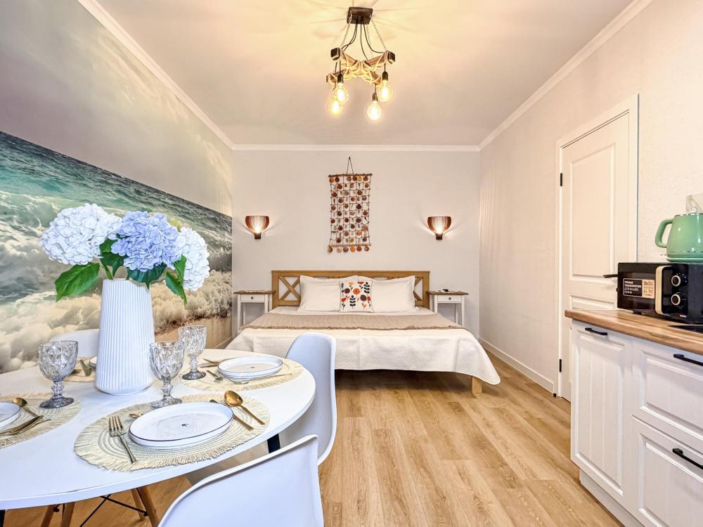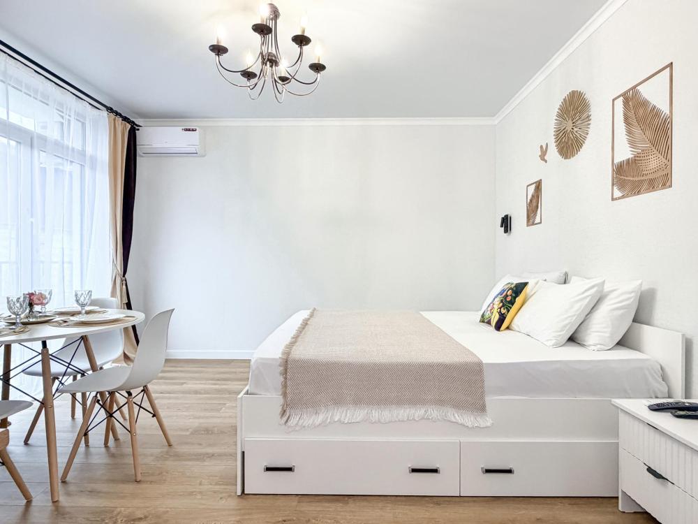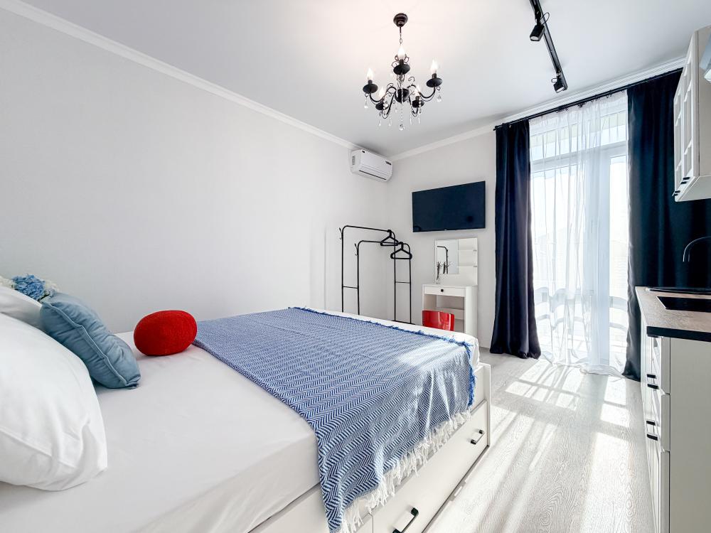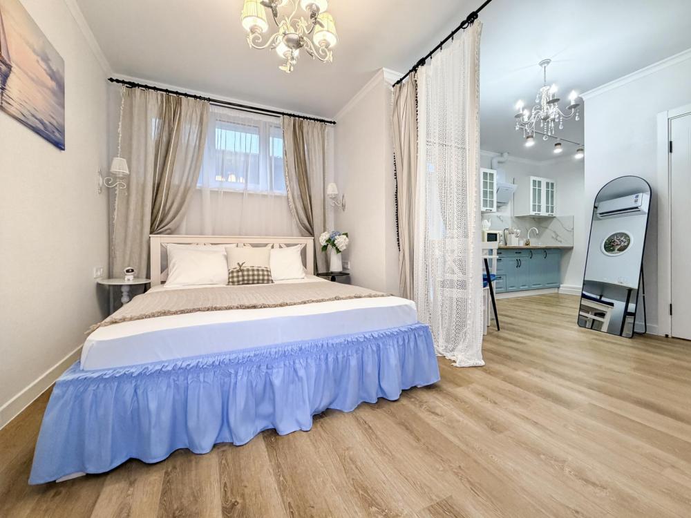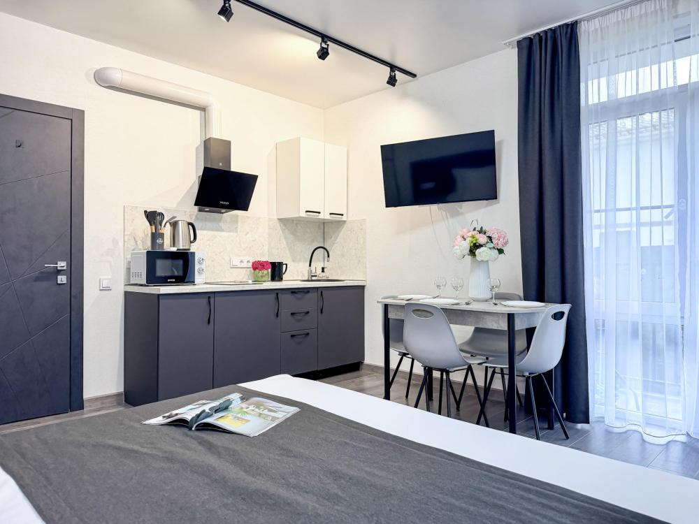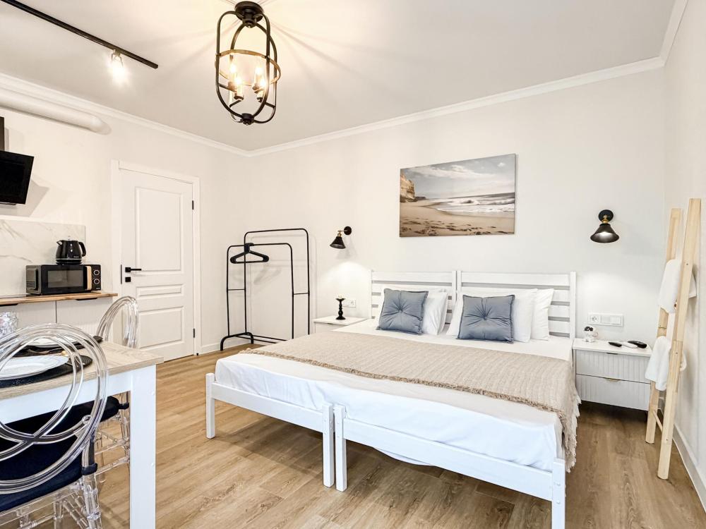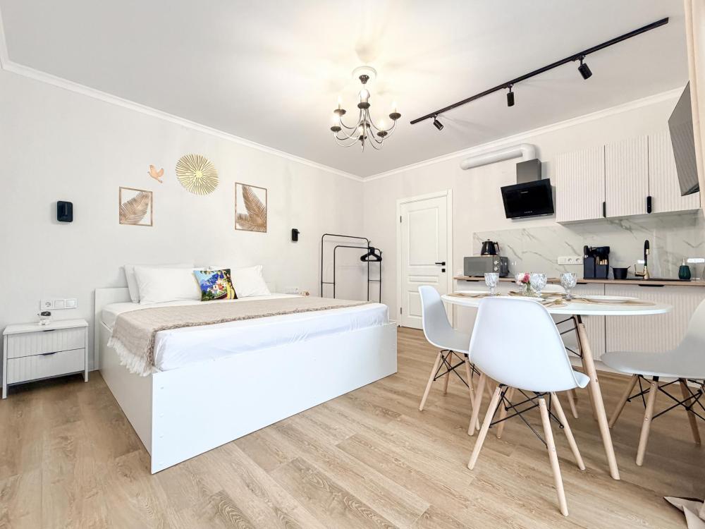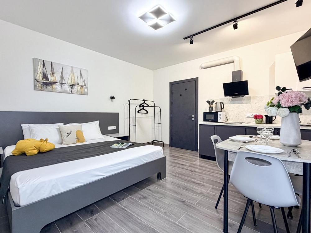 Просторные апартаменты площадью 26 кв.м рассчитаны на размещение до 2 гостей: к вашим услугам большая двуспальная кровать размером 200×200 см с качественным ортопедическим матрасом для спокойного сна. По запросу предоставляется детская кровать-манеж. В студии предусмотрен совмещённый санузел с современной душевой системой и стиральной машиной. Все необходимые мелочи для комфорта: полотенца, фен, мыло, шампунь и гель для душа — уже ждут гостей. Кухня оборудована всем необходимым для самостоятельного приготовления еды: полноразмерный двухкамерный холодильник, микроволновая печь, варочная плита, чайник, а также полный набор посуды для готовки и сервировки, обеденная зона. Для удобства в номере предусмотрены шкаф для одежды, прикроватные тумбочки, телевизор, сплит-система, рабочая зона и напольная раскладная сушка для белья. Гладильные принадлежности находятся на этаже в общем доступе. Бесплатный Wi-Fi обеспечивает стабильное подключение к интернету на протяжении вашего пребывания.