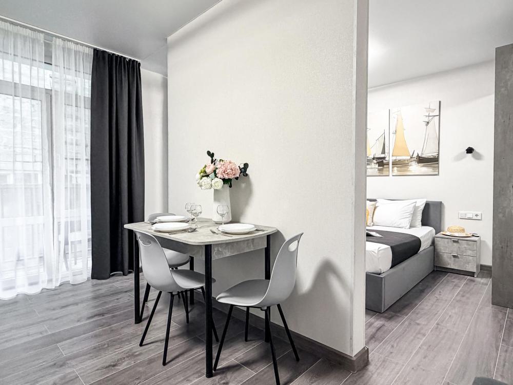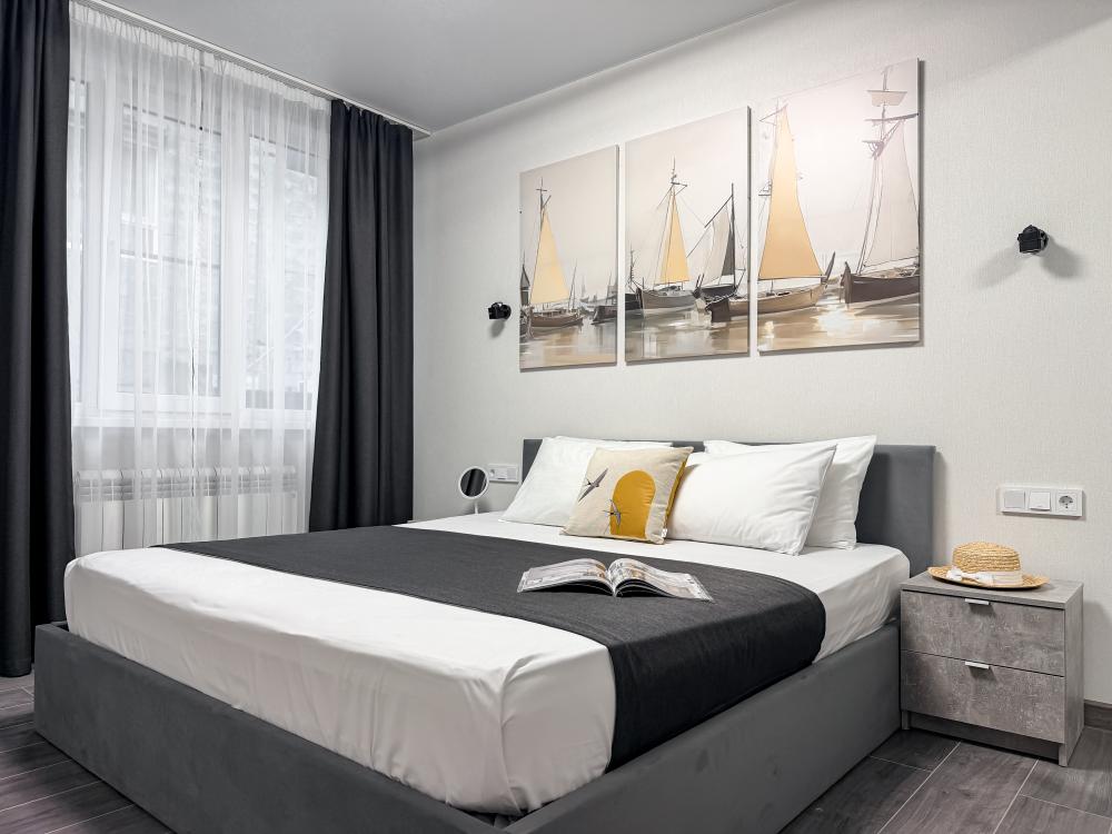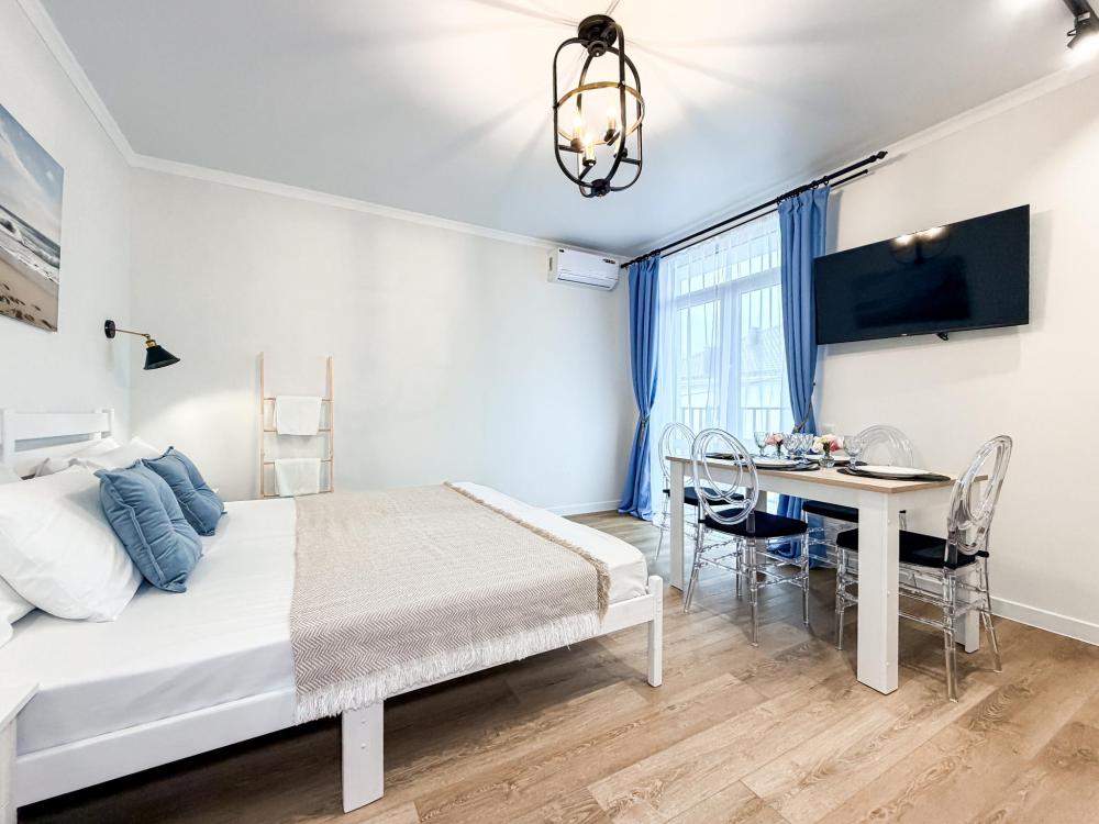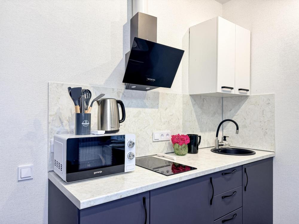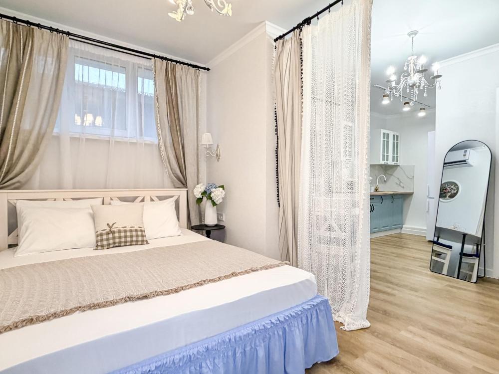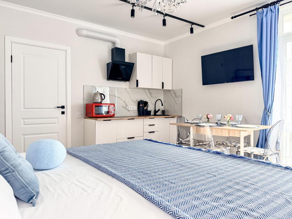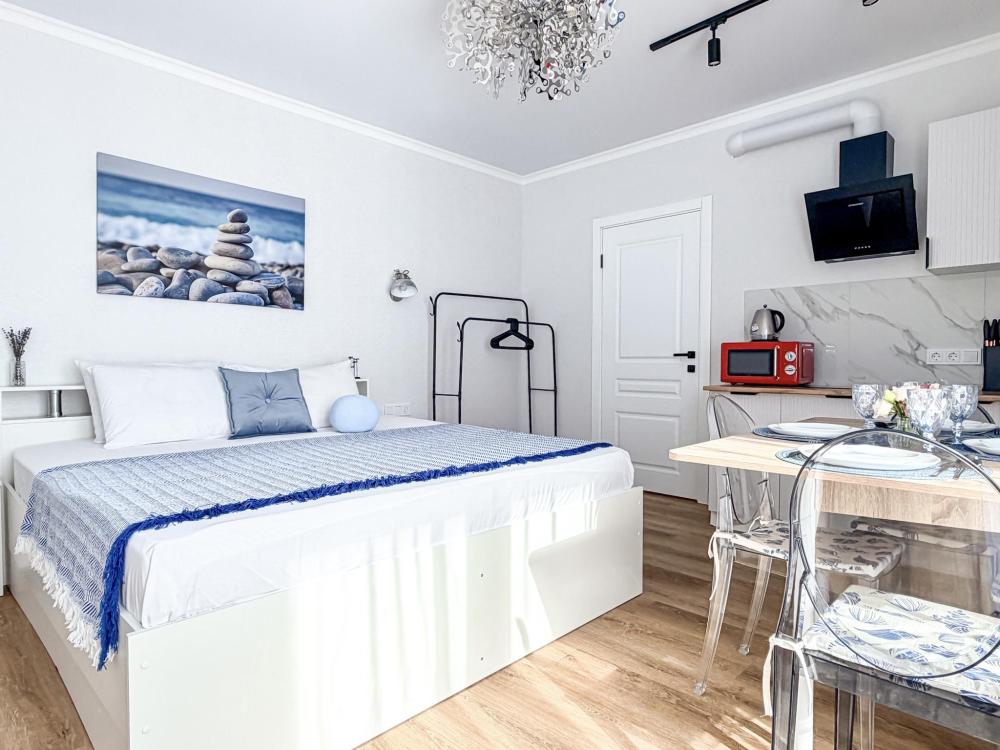 Просторные апартаменты площадью 26 кв.м рассчитаны на размещение до 2 гостей: к вашим услугам большая двуспальная кровать размером 200×200 см с качественным ортопедическим матрасом для спокойного сна. По запросу предоставляется детская кровать-манеж. В студии предусмотрен совмещённый санузел с современной душевой системой и стиральной машиной. Все необходимые мелочи для комфорта: полотенца, фен, мыло, шампунь и гель для душа — уже ждут гостей. Кухня оборудована всем необходимым для самостоятельного приготовления еды: полноразмерный двухкамерный холодильник, микроволновая печь, варочная плита, чайник, а также полный набор посуды для готовки и сервировки, обеденная зона. Для удобства в номере предусмотрены шкаф для одежды, прикроватные тумбочки, телевизор, сплит-система, рабочая зона и напольная раскладная сушка для белья. Гладильные принадлежности находятся на этаже в общем доступе. Бесплатный Wi-Fi обеспечивает стабильное подключение к интернету на протяжении вашего пребывания.