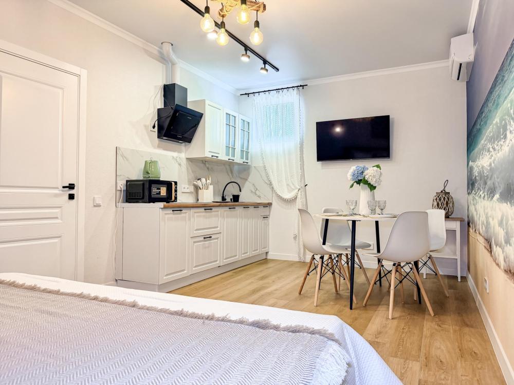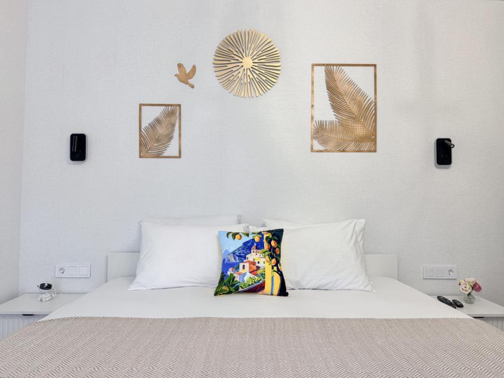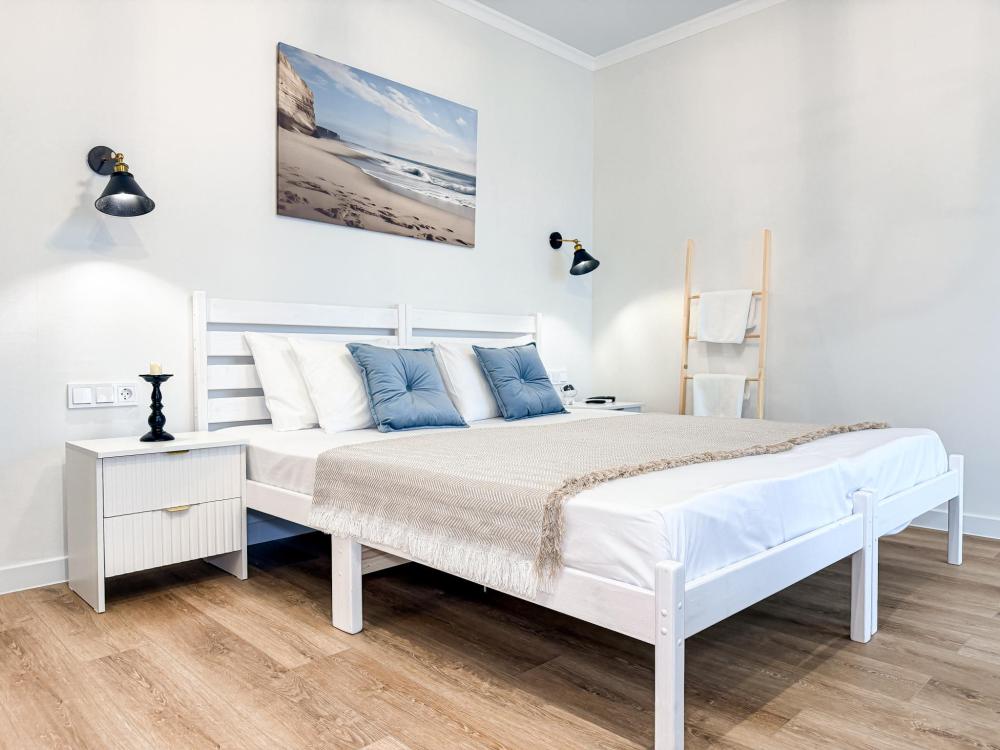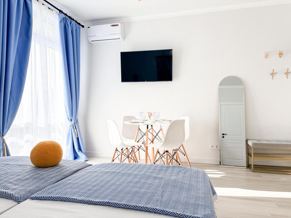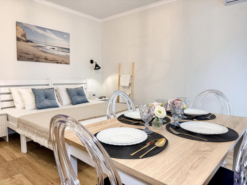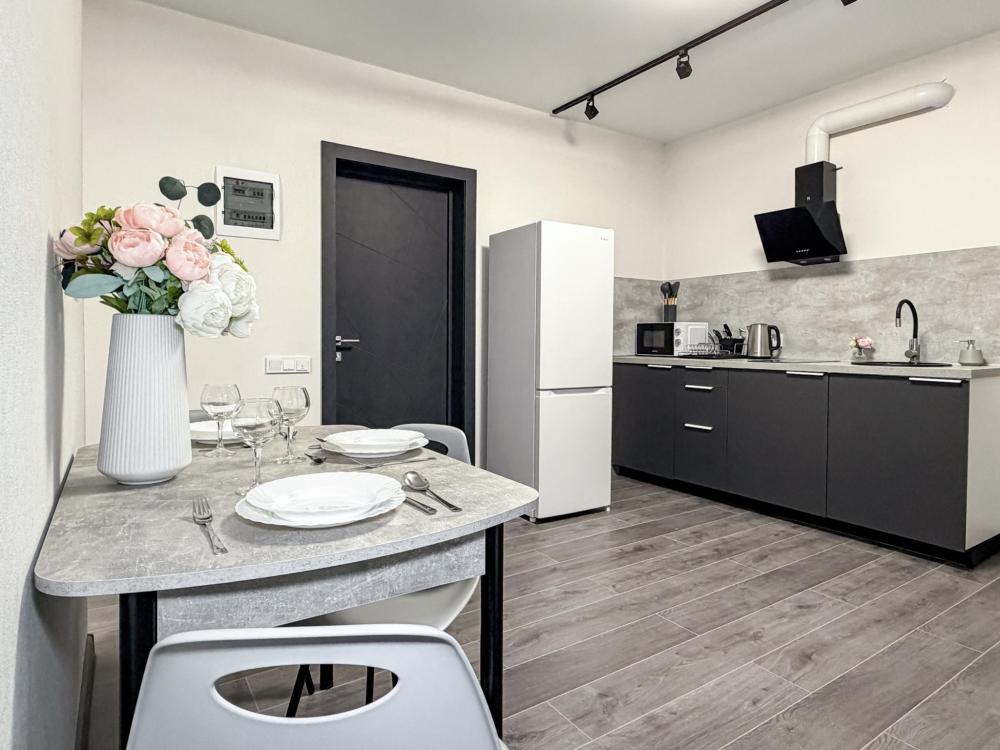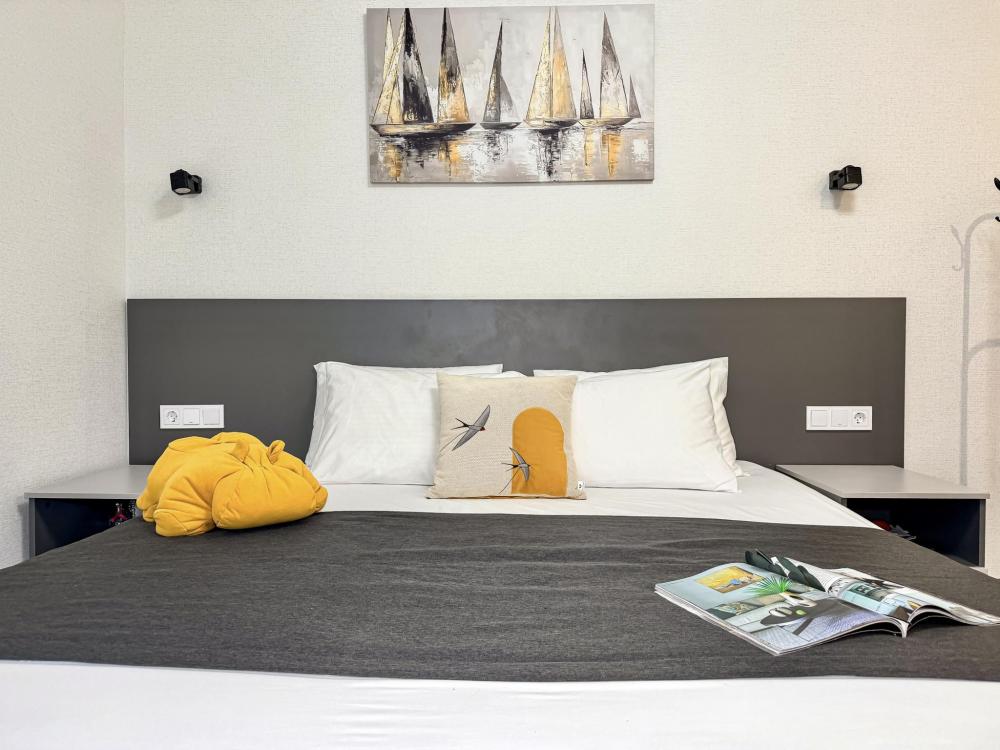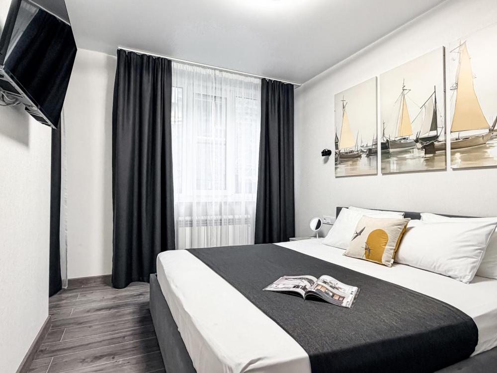 Просторные апартаменты площадью 26 кв.м рассчитаны на размещение до 2 гостей: к вашим услугам большая двуспальная кровать размером 200×200 см с качественным ортопедическим матрасом для спокойного сна. По запросу предоставляется детская кровать-манеж. В студии предусмотрен совмещённый санузел с современной душевой системой и стиральной машиной. Все необходимые мелочи для комфорта: полотенца, фен, мыло, шампунь и гель для душа — уже ждут гостей. Кухня оборудована всем необходимым для самостоятельного приготовления еды: полноразмерный двухкамерный холодильник, микроволновая печь, варочная плита, чайник, а также полный набор посуды для готовки и сервировки, обеденная зона. Для удобства в номере предусмотрены шкаф для одежды, прикроватные тумбочки, телевизор, сплит-система, рабочая зона и напольная раскладная сушка для белья. Гладильные принадлежности находятся на этаже в общем доступе. Бесплатный Wi-Fi обеспечивает стабильное подключение к интернету на протяжении вашего пребывания.