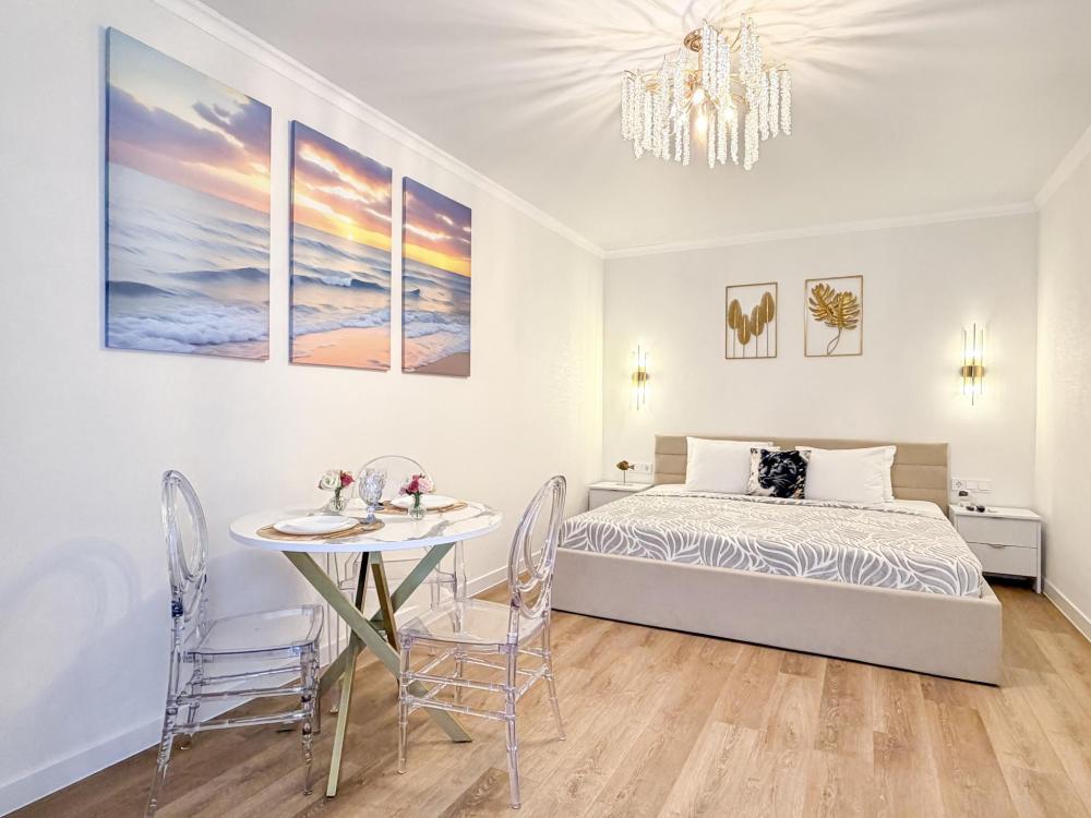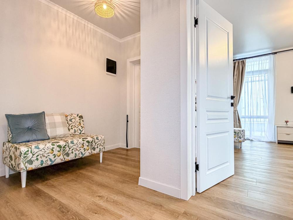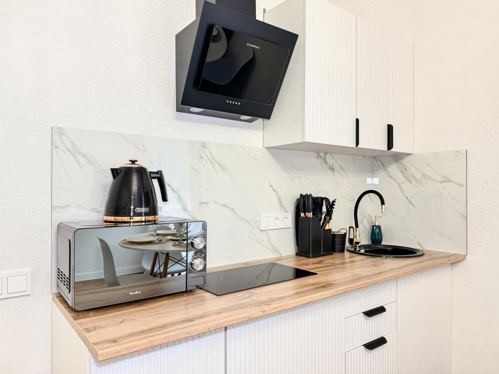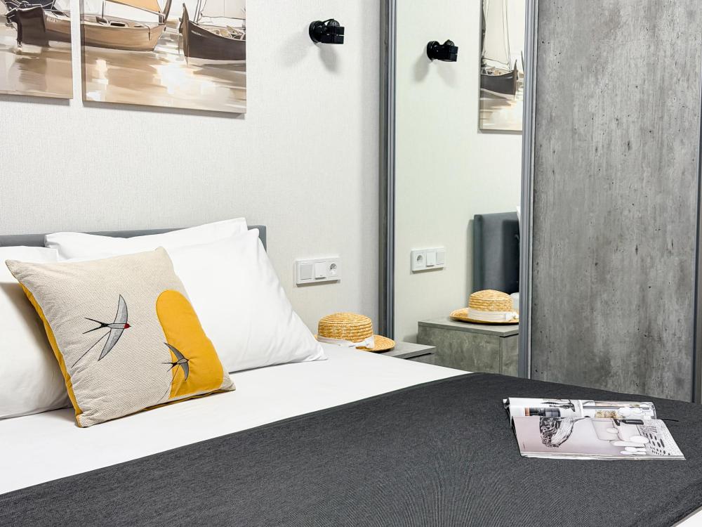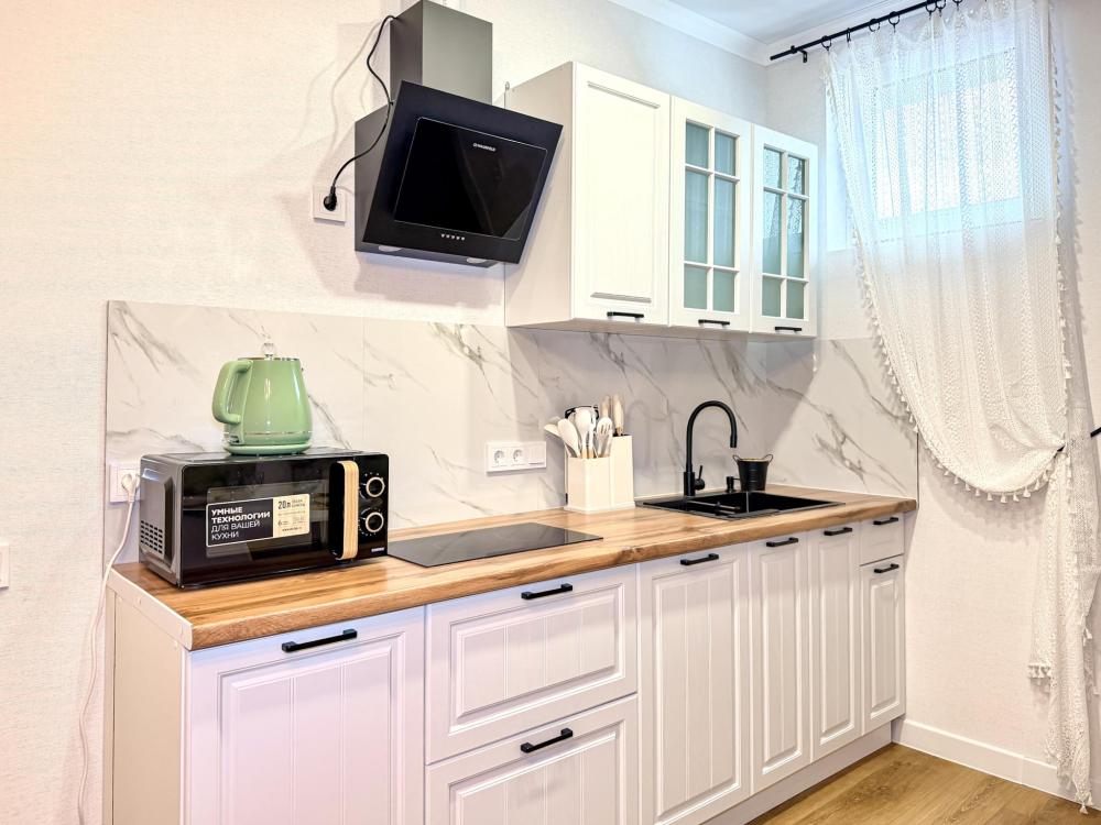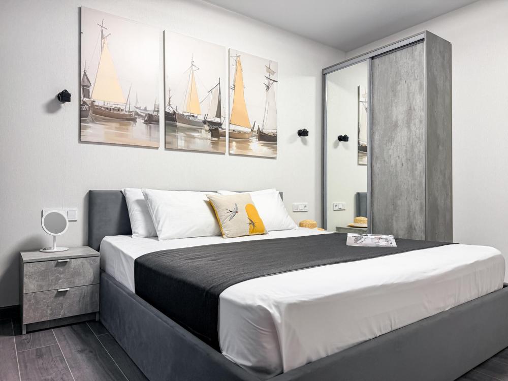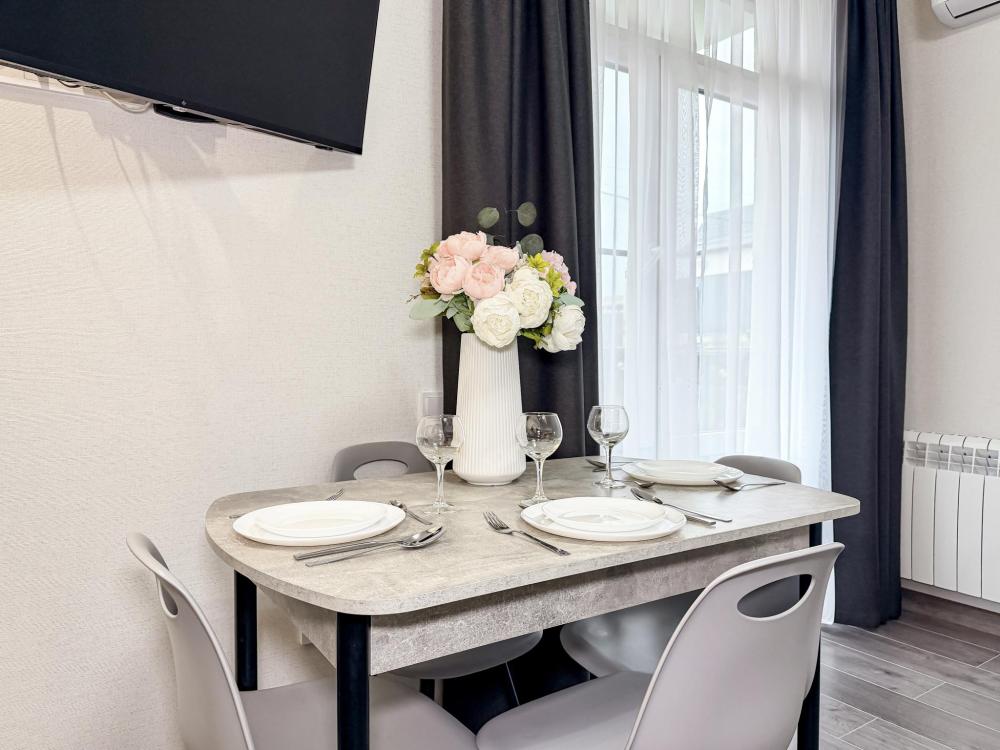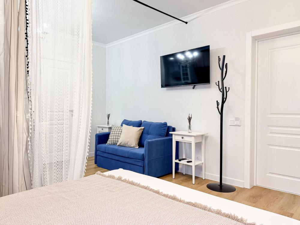 Просторные апартаменты площадью 26 кв.м рассчитаны на размещение до 2 гостей: к вашим услугам большая двуспальная кровать размером 200×200 см с качественным ортопедическим матрасом для спокойного сна. По запросу предоставляется детская кровать-манеж. В студии предусмотрен совмещённый санузел с современной душевой системой и стиральной машиной. Все необходимые мелочи для комфорта: полотенца, фен, мыло, шампунь и гель для душа — уже ждут гостей. Кухня оборудована всем необходимым для самостоятельного приготовления еды: полноразмерный двухкамерный холодильник, микроволновая печь, варочная плита, чайник, а также полный набор посуды для готовки и сервировки, обеденная зона. Для удобства в номере предусмотрены шкаф для одежды, прикроватные тумбочки, телевизор, сплит-система, рабочая зона и напольная раскладная сушка для белья. Гладильные принадлежности находятся на этаже в общем доступе. Бесплатный Wi-Fi обеспечивает стабильное подключение к интернету на протяжении вашего пребывания.