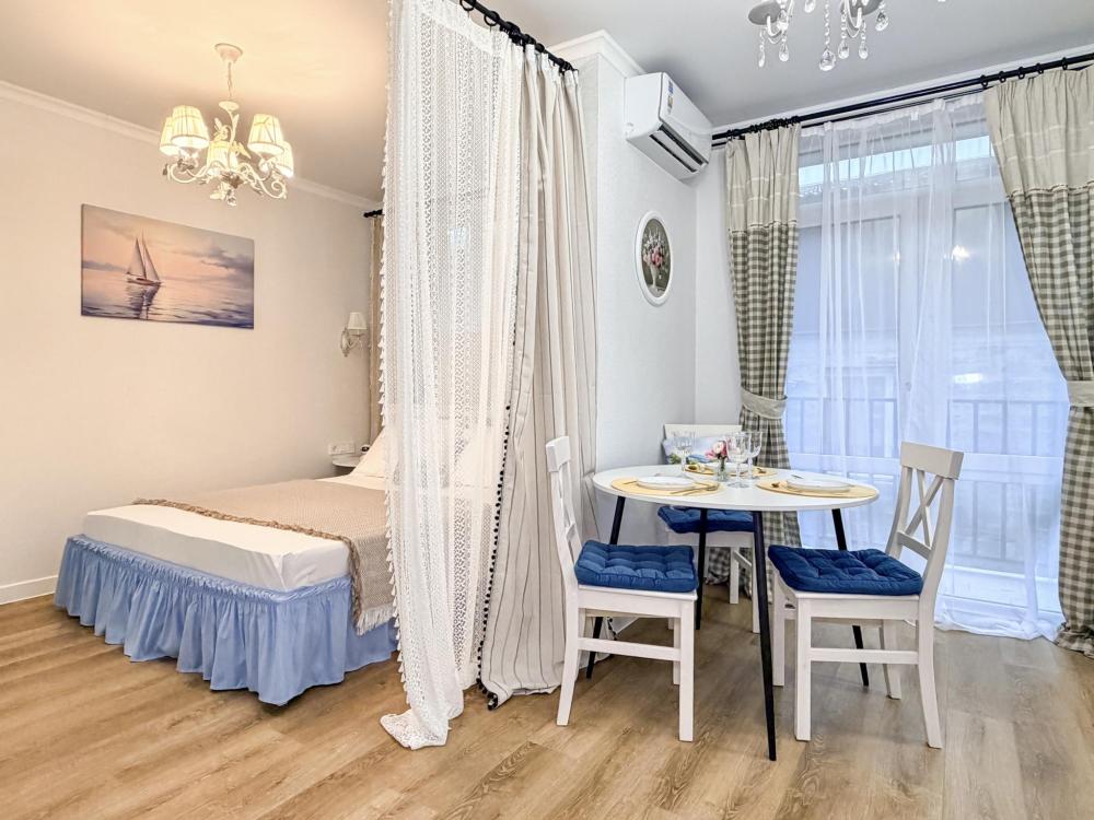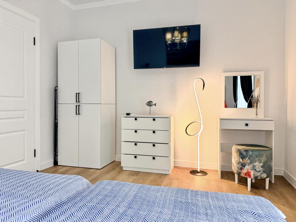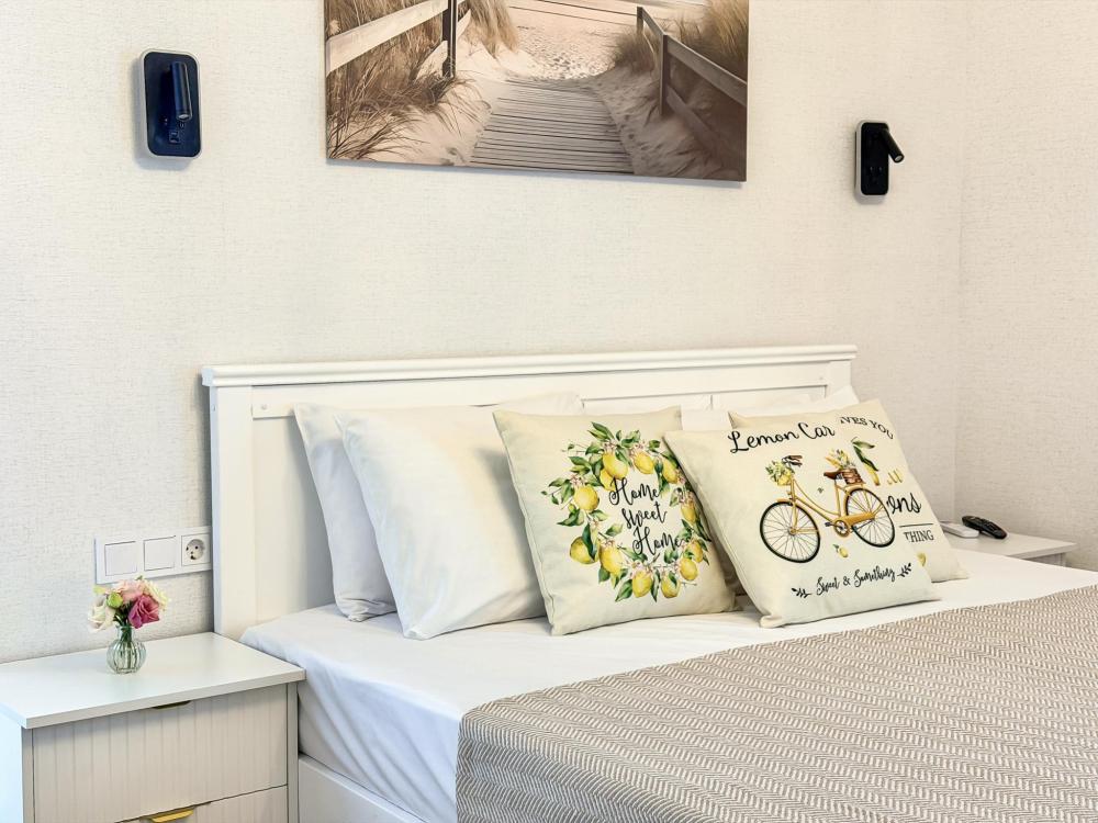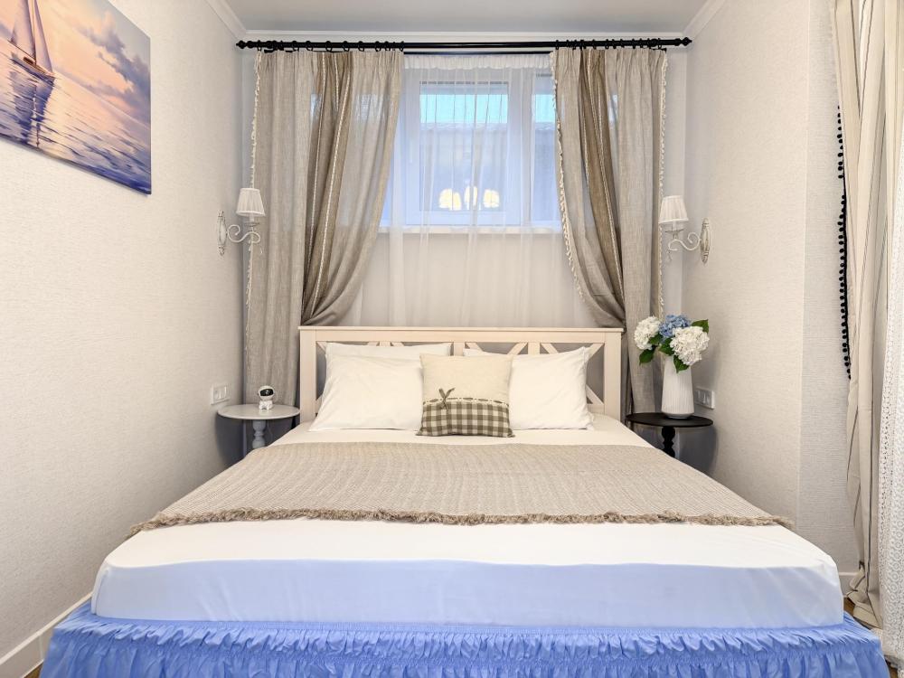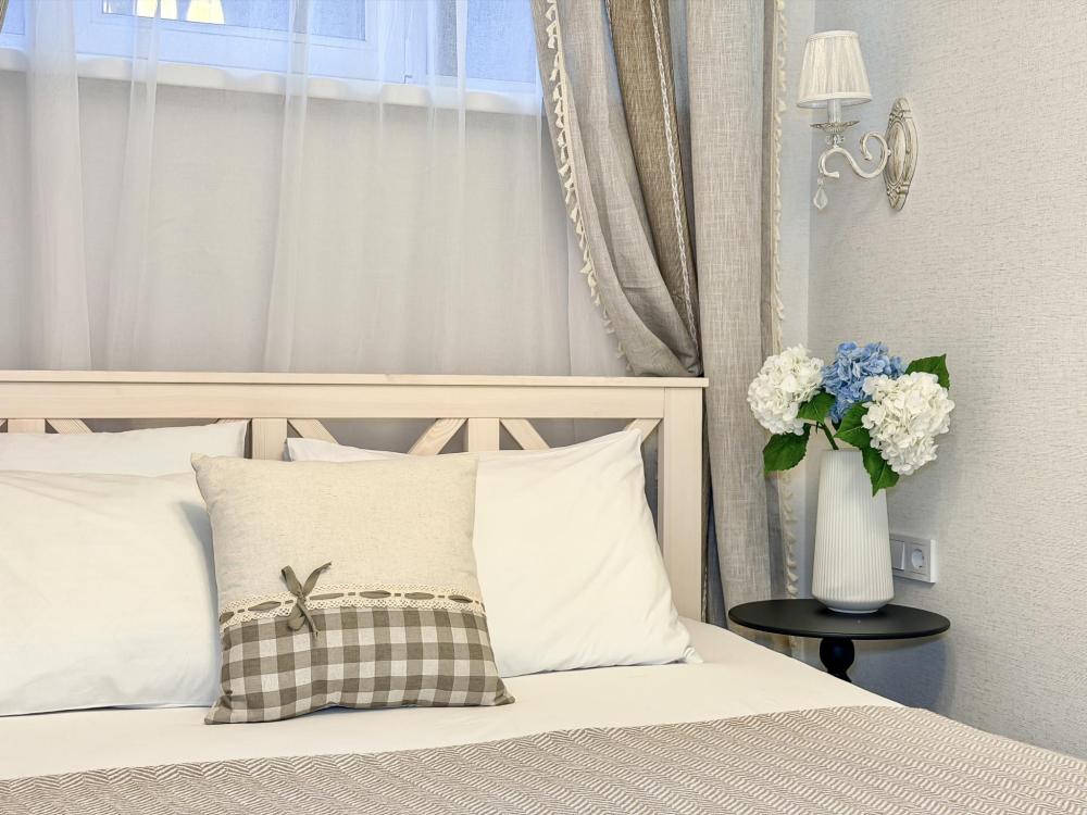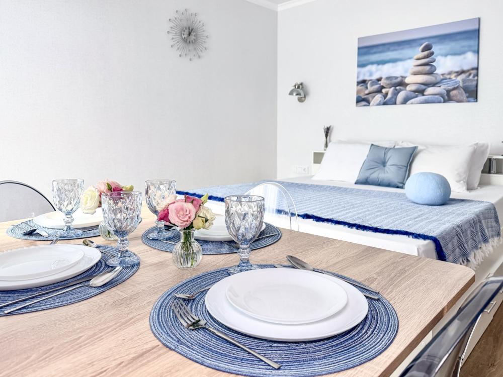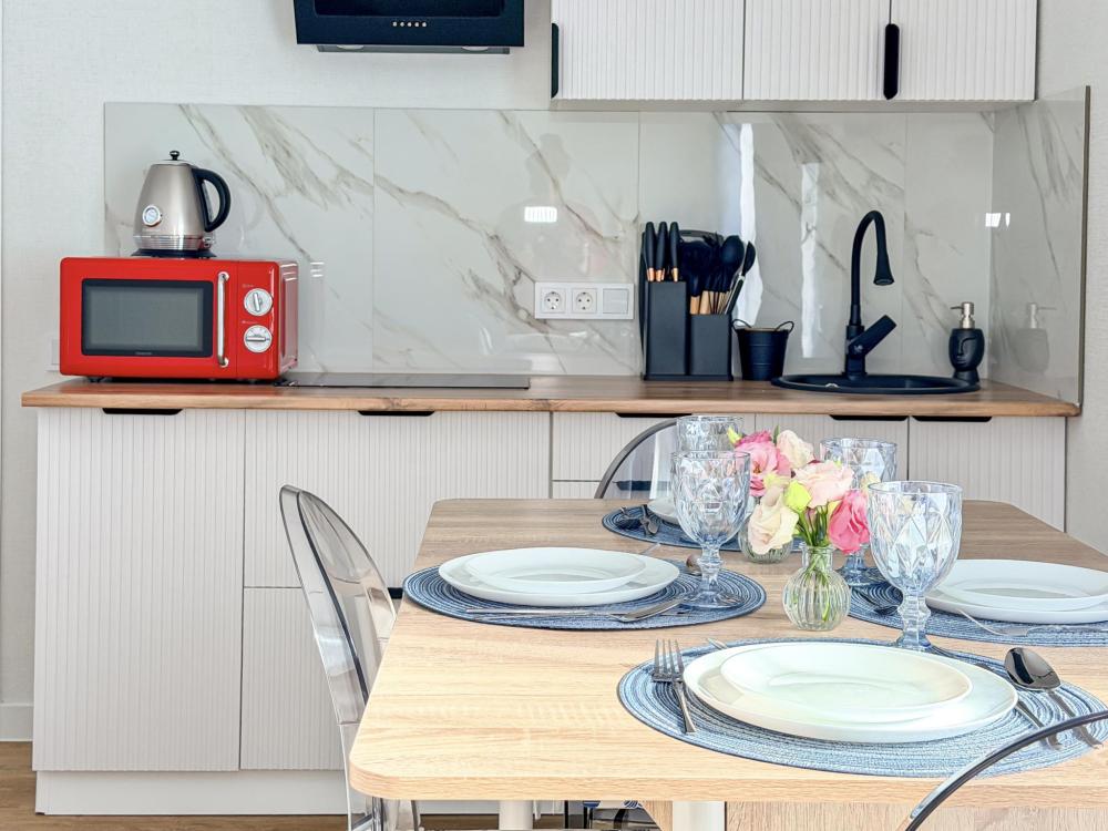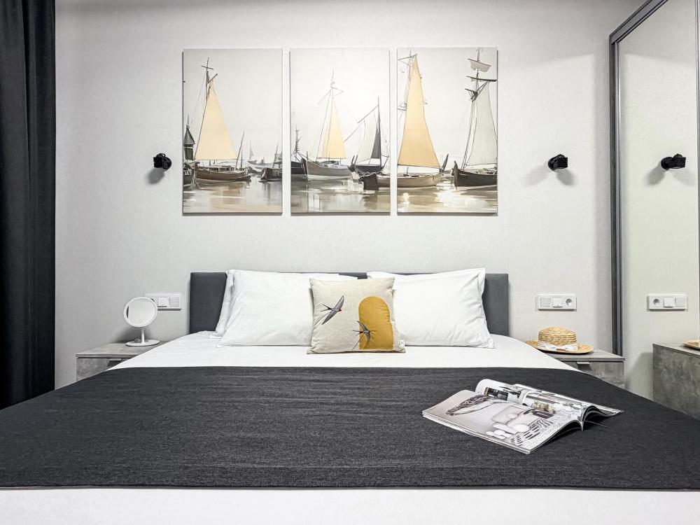 Просторные апартаменты площадью 26 кв.м рассчитаны на размещение до 2 гостей: к вашим услугам большая двуспальная кровать размером 200×200 см с качественным ортопедическим матрасом для спокойного сна. По запросу предоставляется детская кровать-манеж. В студии предусмотрен совмещённый санузел с современной душевой системой и стиральной машиной. Все необходимые мелочи для комфорта: полотенца, фен, мыло, шампунь и гель для душа — уже ждут гостей. Кухня оборудована всем необходимым для самостоятельного приготовления еды: полноразмерный двухкамерный холодильник, микроволновая печь, варочная плита, чайник, а также полный набор посуды для готовки и сервировки, обеденная зона. Для удобства в номере предусмотрены шкаф для одежды, прикроватные тумбочки, телевизор, сплит-система, рабочая зона и напольная раскладная сушка для белья. Гладильные принадлежности находятся на этаже в общем доступе. Бесплатный Wi-Fi обеспечивает стабильное подключение к интернету на протяжении вашего пребывания.