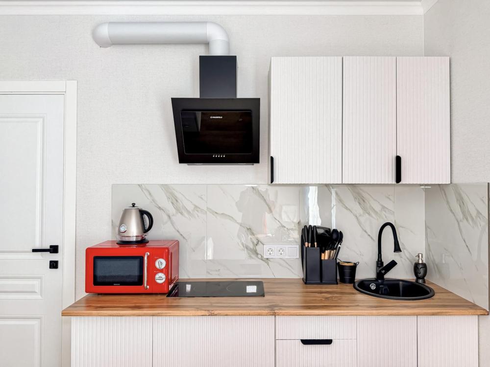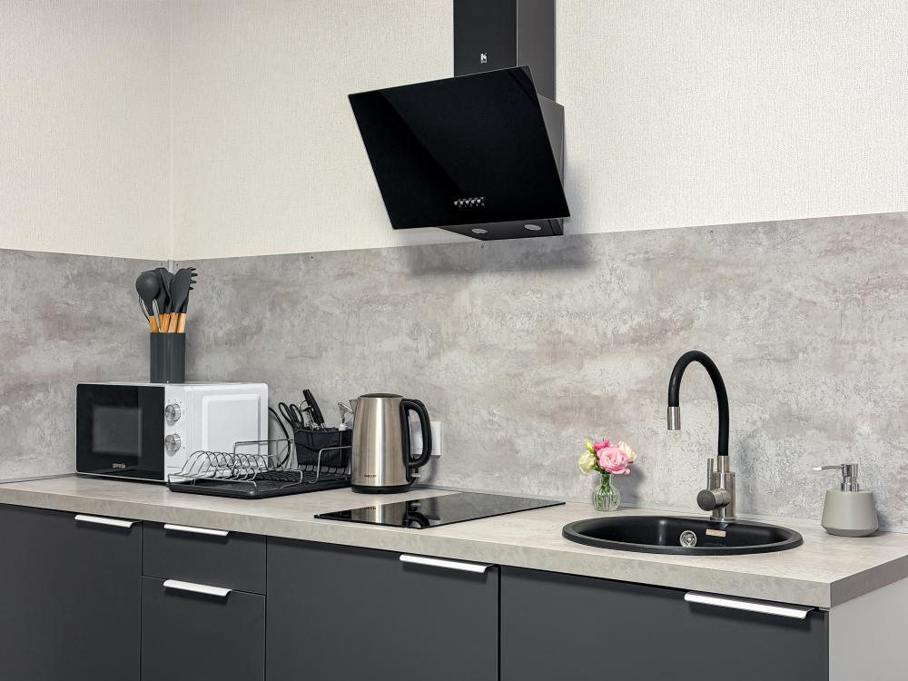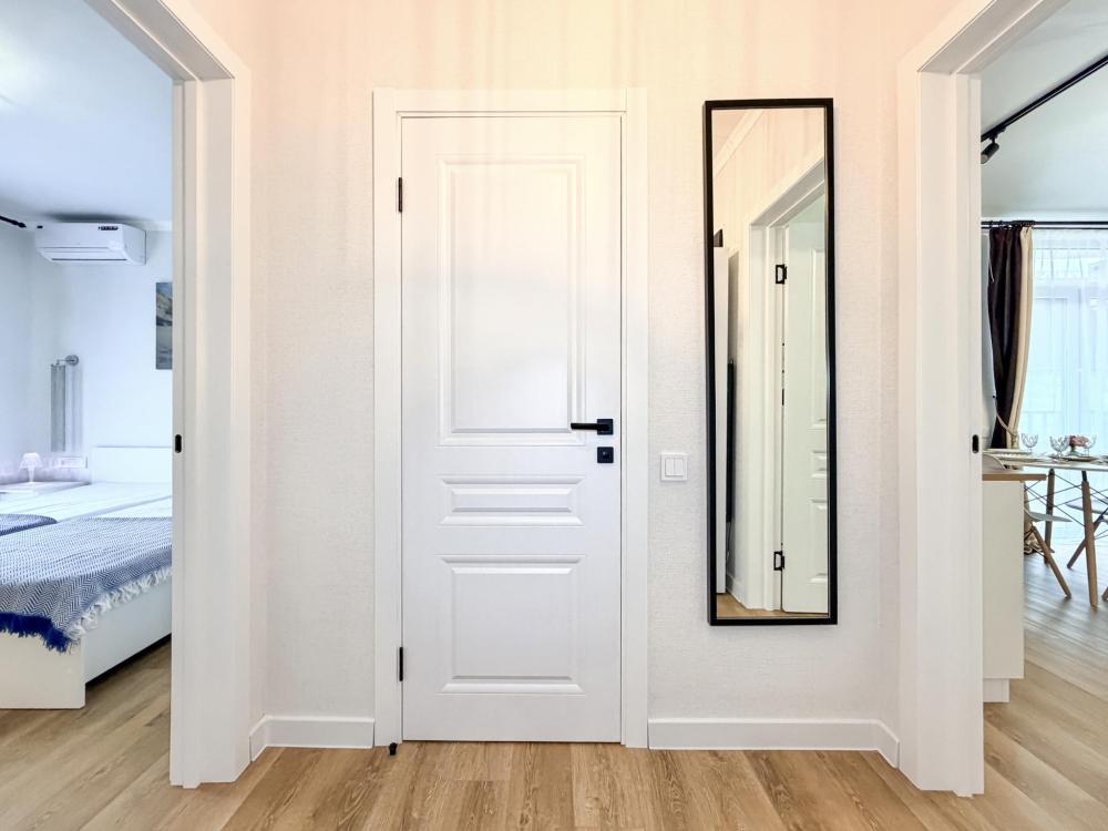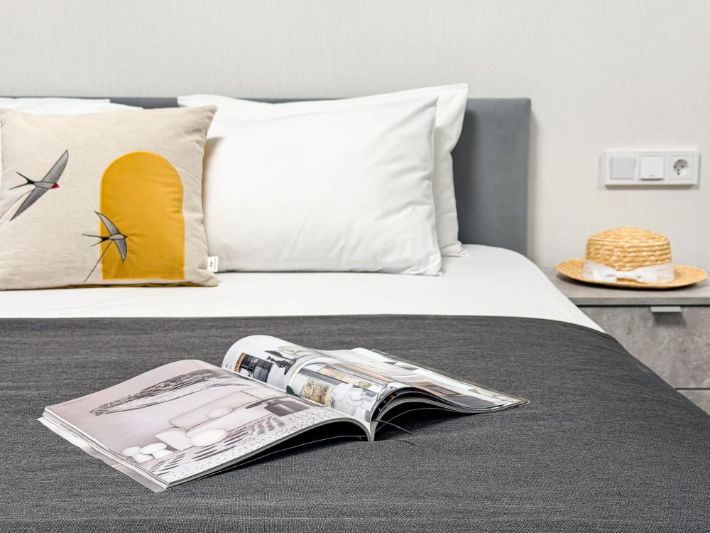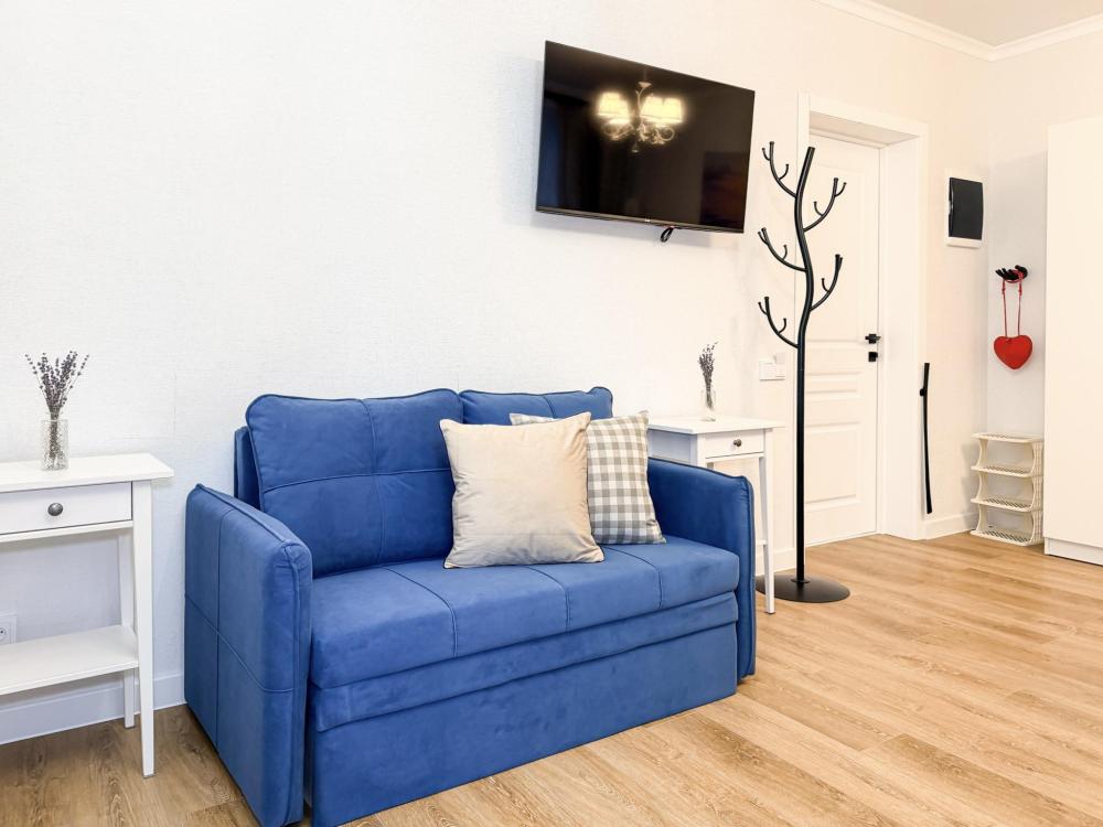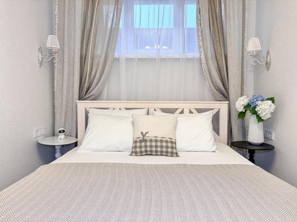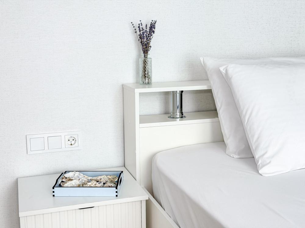 Просторные апартаменты площадью 26 кв.м рассчитаны на размещение до 2 гостей: к вашим услугам большая двуспальная кровать размером 200×200 см с качественным ортопедическим матрасом для спокойного сна. По запросу предоставляется детская кровать-манеж. В студии предусмотрен совмещённый санузел с современной душевой системой и стиральной машиной. Все необходимые мелочи для комфорта: полотенца, фен, мыло, шампунь и гель для душа — уже ждут гостей. Кухня оборудована всем необходимым для самостоятельного приготовления еды: полноразмерный двухкамерный холодильник, микроволновая печь, варочная плита, чайник, а также полный набор посуды для готовки и сервировки, обеденная зона. Для удобства в номере предусмотрены шкаф для одежды, прикроватные тумбочки, телевизор, сплит-система, рабочая зона и напольная раскладная сушка для белья. Гладильные принадлежности находятся на этаже в общем доступе. Бесплатный Wi-Fi обеспечивает стабильное подключение к интернету на протяжении вашего пребывания.