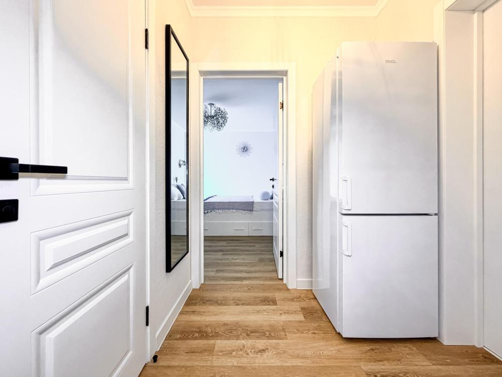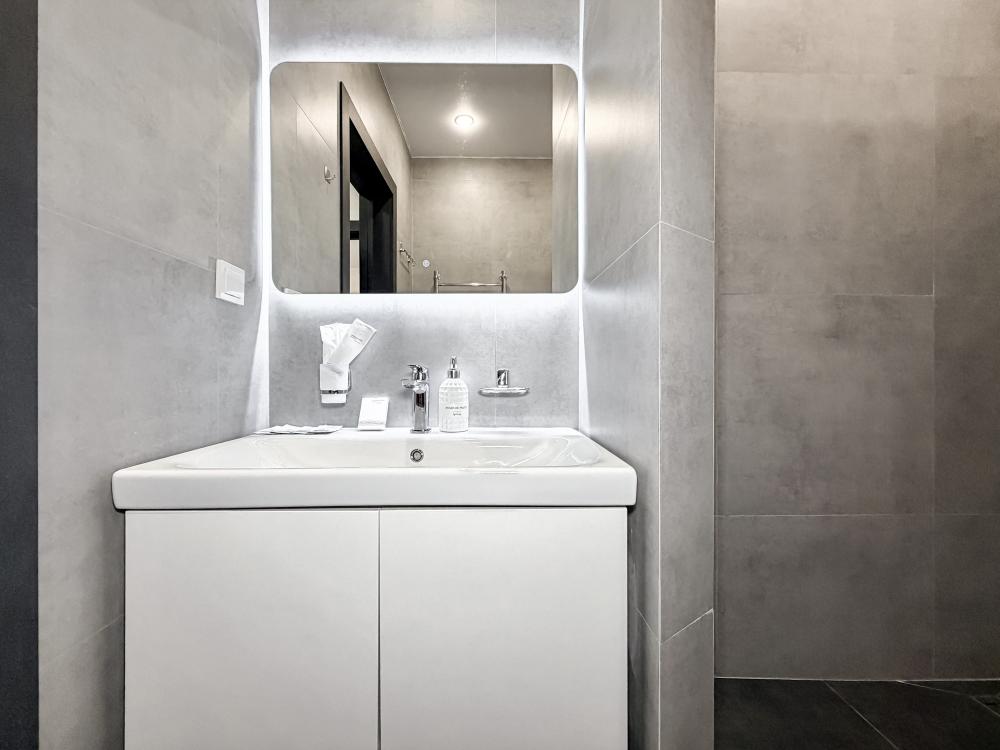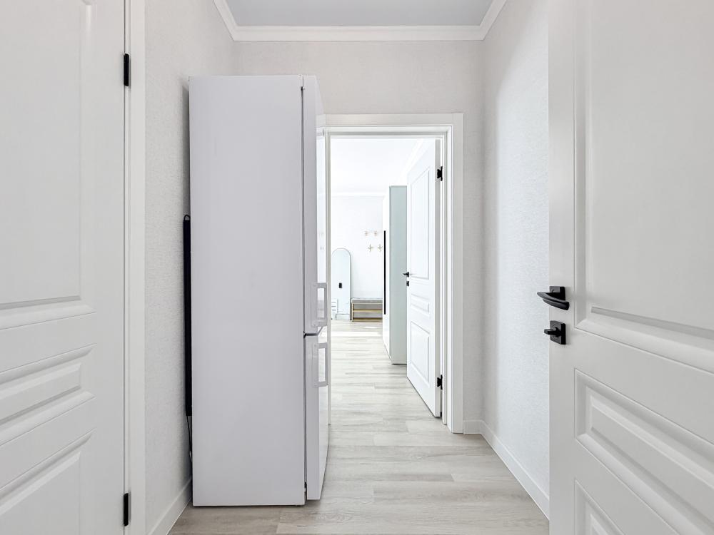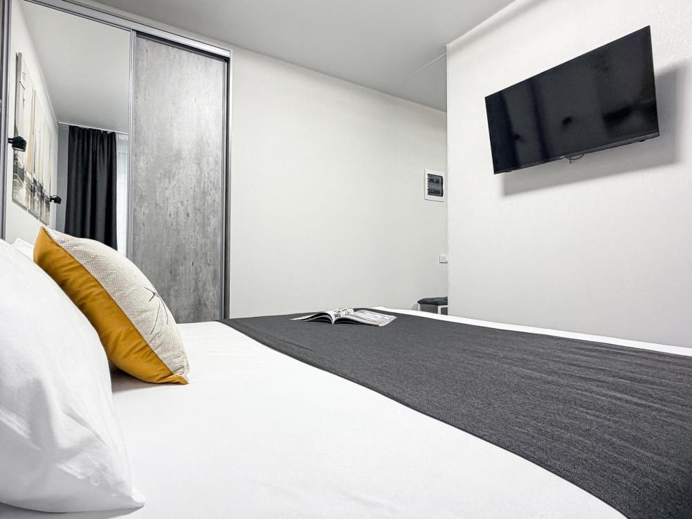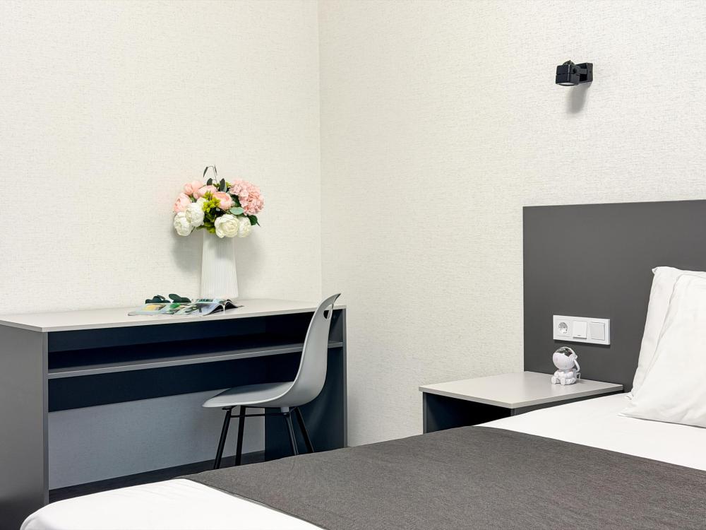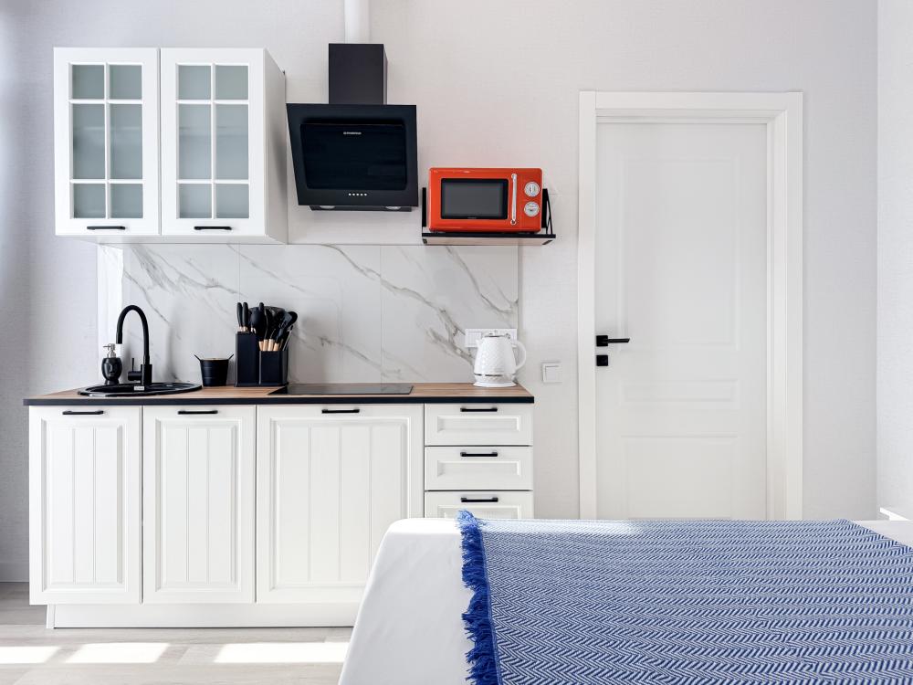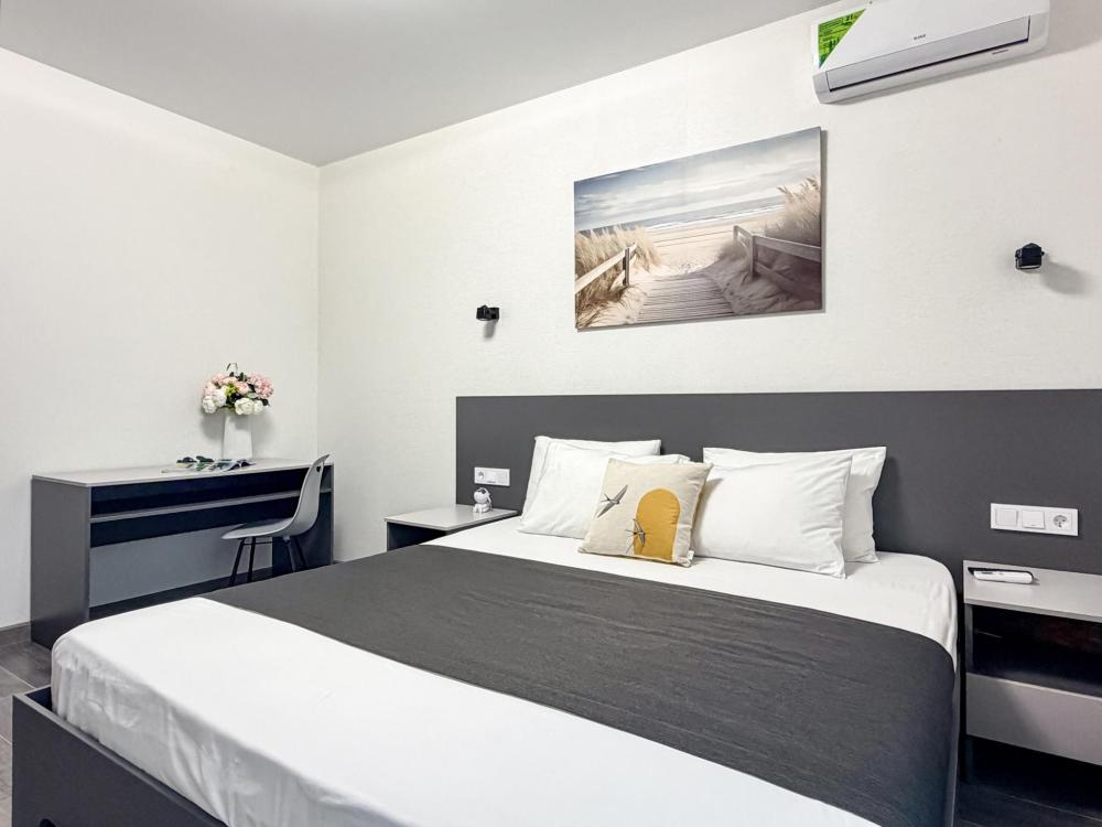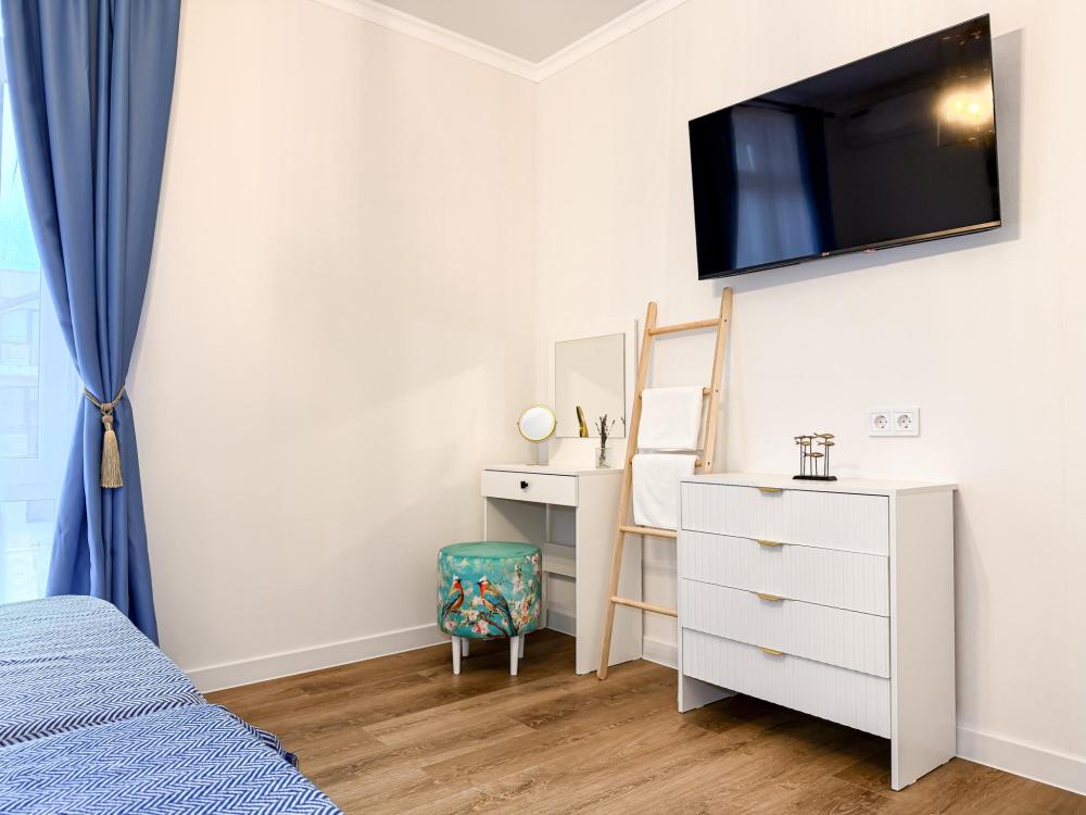 Просторные апартаменты площадью 26 кв.м рассчитаны на размещение до 2 гостей: к вашим услугам большая двуспальная кровать размером 200×200 см с качественным ортопедическим матрасом для спокойного сна. По запросу предоставляется детская кровать-манеж. В студии предусмотрен совмещённый санузел с современной душевой системой и стиральной машиной. Все необходимые мелочи для комфорта: полотенца, фен, мыло, шампунь и гель для душа — уже ждут гостей. Кухня оборудована всем необходимым для самостоятельного приготовления еды: полноразмерный двухкамерный холодильник, микроволновая печь, варочная плита, чайник, а также полный набор посуды для готовки и сервировки, обеденная зона. Для удобства в номере предусмотрены шкаф для одежды, прикроватные тумбочки, телевизор, сплит-система, рабочая зона и напольная раскладная сушка для белья. Гладильные принадлежности находятся на этаже в общем доступе. Бесплатный Wi-Fi обеспечивает стабильное подключение к интернету на протяжении вашего пребывания.