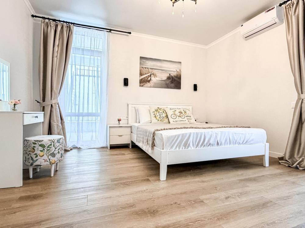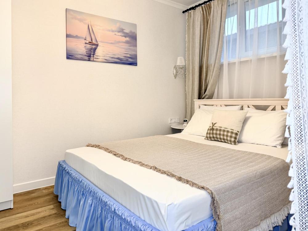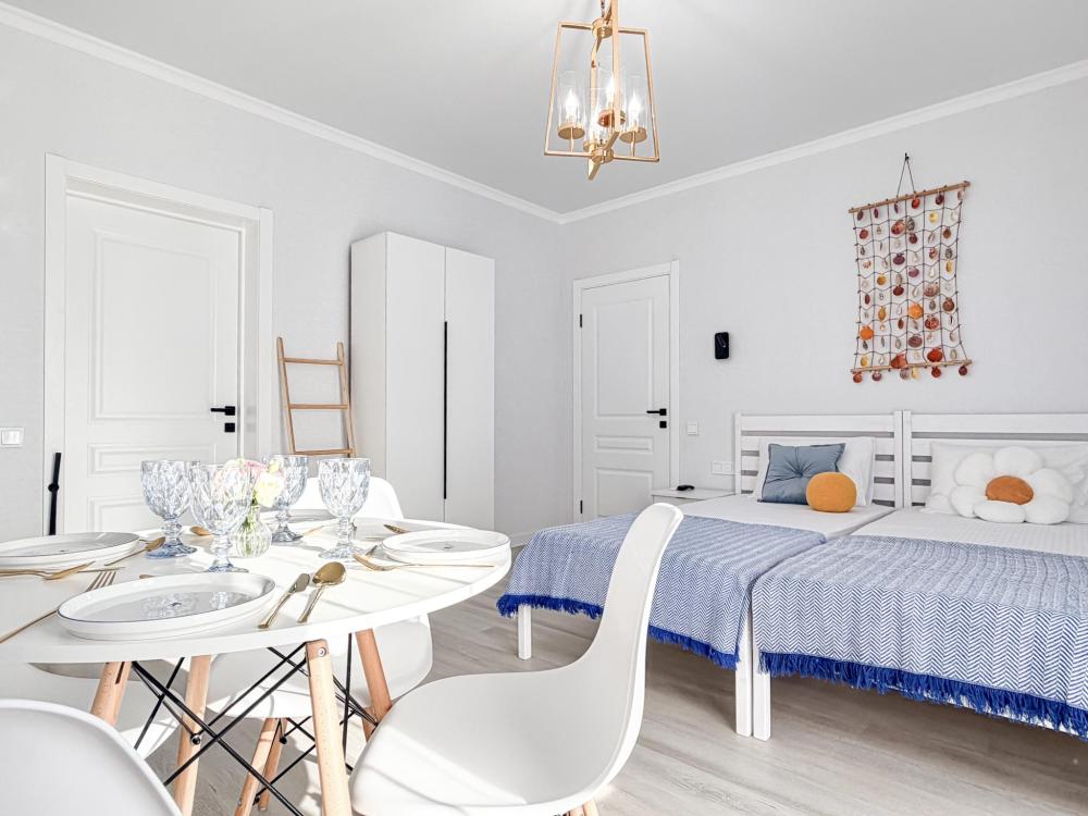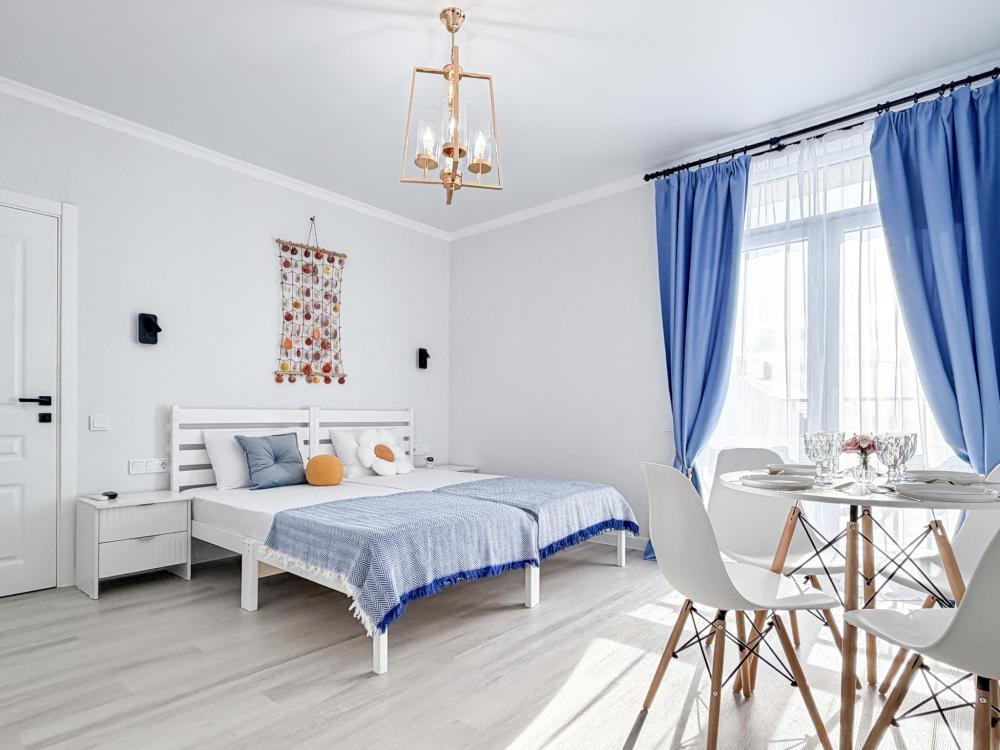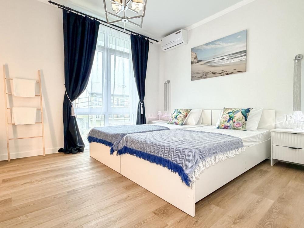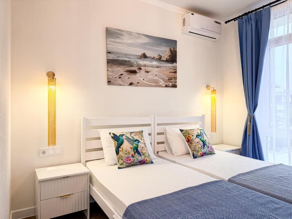 Апартаменты «Море» — это уютные двухкомнатные апартаменты на 4 персон, интерьер которых объединяет два современных стиля: самерсендс и хамстонс. В интерьере много мягкого естественного света, текстиля и природных оттенков. Мебель простая, но очень удобная, декор — минималистичный, с морскими и пляжными акцентами. Хочется отметить атмосферу лёгкости и покоя, которая позволяет максимально насладиться отдыхом на морском побережье в Анапе. Спальные места: спальня: двуспальная кровать 180×200 с ортопедическим матрасом (или 2 кровати односпальные), обеспечивающими комфортный и здоровый сон. Гостиная: двуспальная кровать 180×200 с ортопедическим матрасом. Кухня: полностью оборудованная кухня со всеми необходимыми принадлежностями для приготовления еды: варочная панель, вытяжка, большой холодильник с морозильной камерой, микроволновая печь, электрочайник, посуда, столовые приборы, кастрюли, сковороды и удобная обеденная зона на 4 персоны. Ванная комната: современная душевая система с тропическим душем, комплект полотенец, фен и все необходимые туалетные принадлежности (шампунь, гель для душа, мыло). Балкон: выход на балкон с мебельной группой: столик и стулья для приятного времяпрепровождения на свежем воздухе.