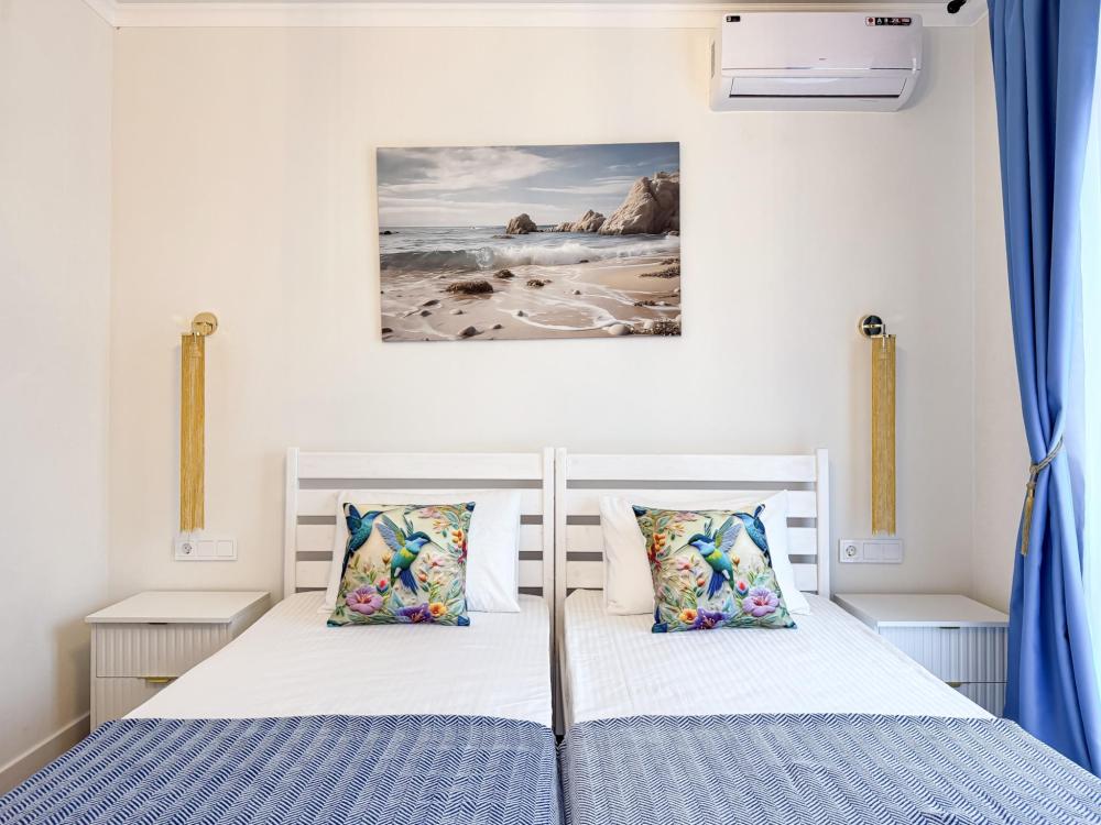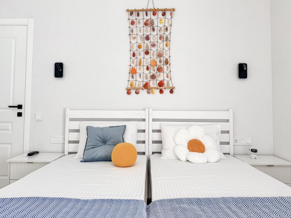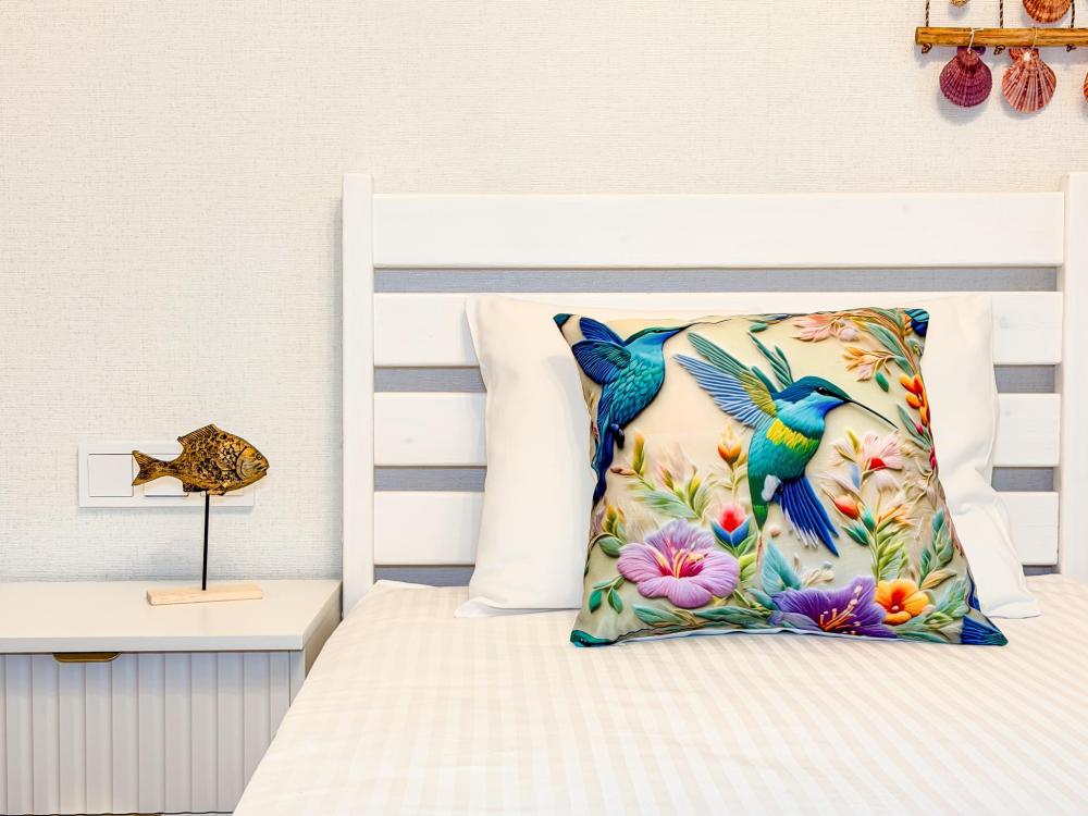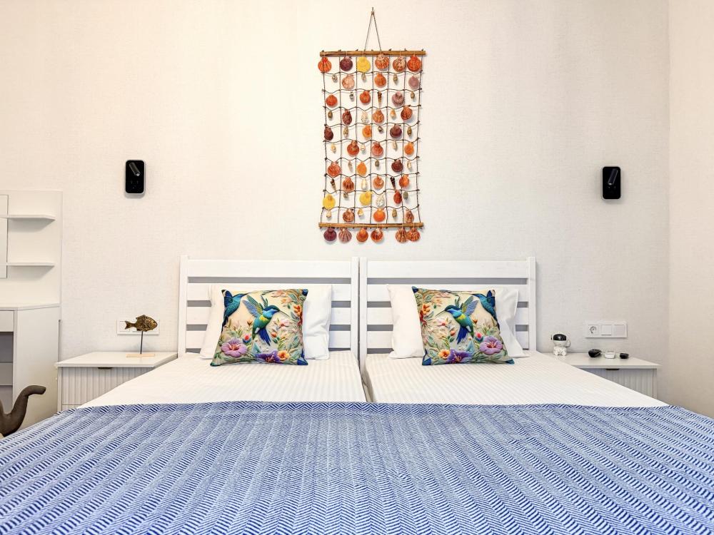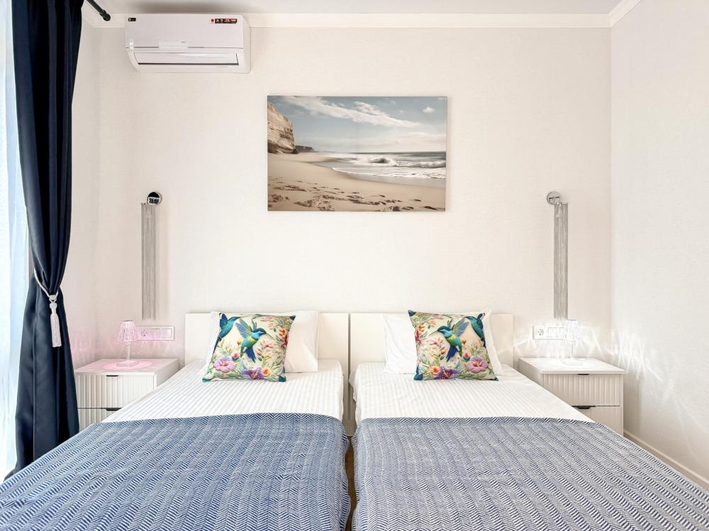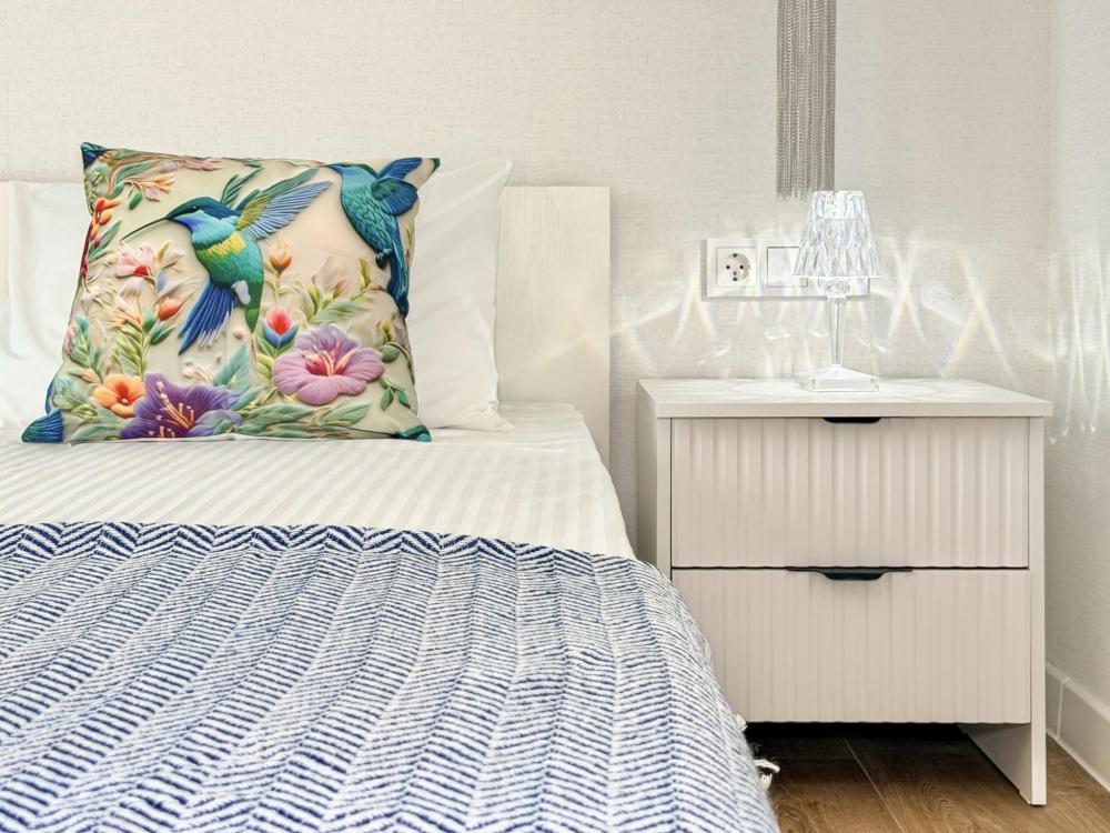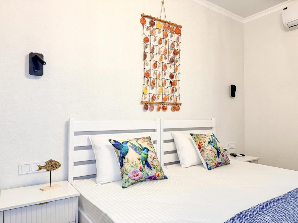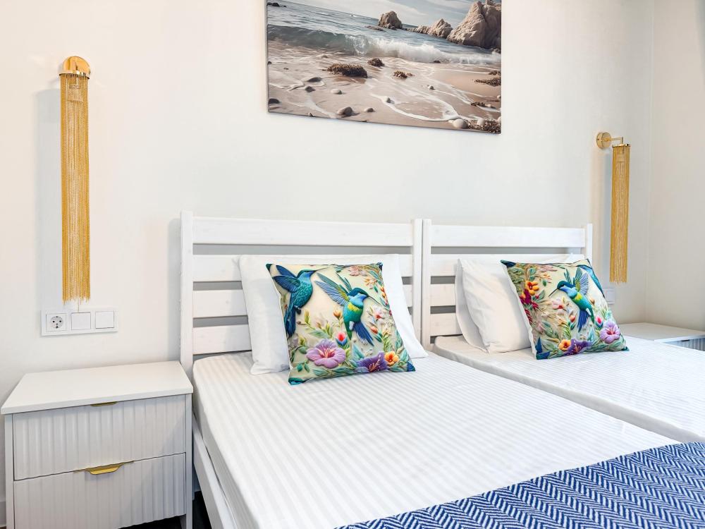 Апартаменты «Колибри» — это уютные двухкомнатные апартаменты на 4 персон, интерьер которых объединяет два современных стиля: самерсендс и хамстонс. В интерьере много мягкого естественного света, текстиля и природных оттенков. Мебель простая, но очень удобная, декор — минималистичный, с морскими и пляжными акцентами. Хочется отметить атмосферу лёгкости и покоя, которая позволяет максимально насладиться отдыхом на морском побережье в Анапе. Спальные места: спальня: двуспальная кровать 180×200 с ортопедическим матрасом (или 2 кровати односпальные), обеспечивающими комфортный и здоровый сон гостиная: двуспальная кровать 180×200 с ортопедическим матрасом. Кухня: полностью оборудованная кухня со всеми необходимыми принадлежностями для приготовления еды: варочная панель, вытяжка, большой холодильник с морозильной камерой, микроволновая печь, электрочайник, посуда, столовые приборы, кастрюли, сковороды и удобная обеденная зона на 4 персоны. Ванная комната: современная душевая система с тропическим душем, комплект полотенец, фен и все необходимые туалетные принадлежности (шампунь, гель для душа, мыло). Балкон: выход на балкон с мебельной группой: столик и стулья для приятного времяпрепровождения на свежем воздухе.