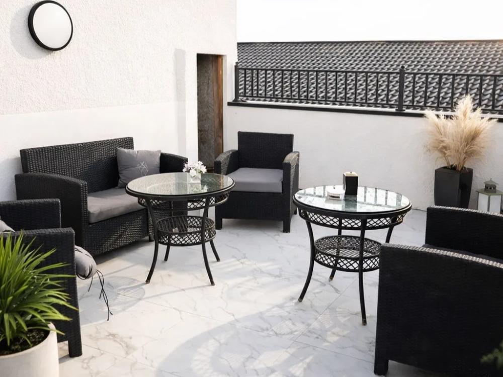 Апартаменты «Океан», площадью 50 кв м — это светлые и уютные двухкомнатные апартаменты с собственной террасой и прямым выходом к бассейну. Интерьер гармонично сочетает два современных стиля: самерсендс и хамстонс. Светлые натуральные оттенки, стильная мебель и текстиль создают атмосферу покоя и легкости, навевая ассоциации с морским бризом и солнечными днями. С террасы открывается приятный вид на территорию с бассейном и лаундж-зоной — здесь особенно приятно проводить время, встречать рассветы или устраивать вечерние посиделки с семьёй и друзьями. Всё продумано для вашего максимального комфорта и отдыха. Спальные места: спальня: двуспальная кровать 180×200 с ортопедическим матрасом (или 2 кровати односпальные), обеспечивающими комфортный и здоровый сон. Гостиная: двуспальная кровать 180×200 с ортопедическим матрасом. Кухня: полностью оборудованная кухня со всеми необходимыми принадлежностями для приготовления еды: варочная панель, вытяжка, большой холодильник с морозильной камерой, микроволновая печь, электрочайник, посуда, столовые приборы, кастрюли, сковороды и удобная обеденная зона на 4 персоны. Ванная комната: современная душевая система с тропическим душем, комплект полотенец, фен и все необходимые туалетные принадлежности (шампунь, гель для душа, мыло). Балкон: выход на балкон с мебельной группой: столик и стулья для приятного времяпрепровождения на свежем воздухе.
