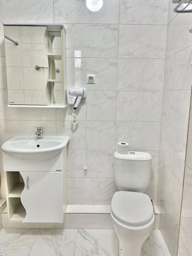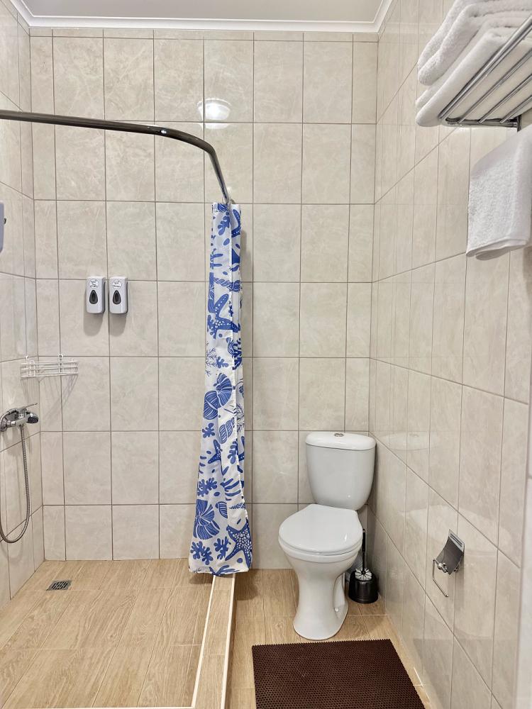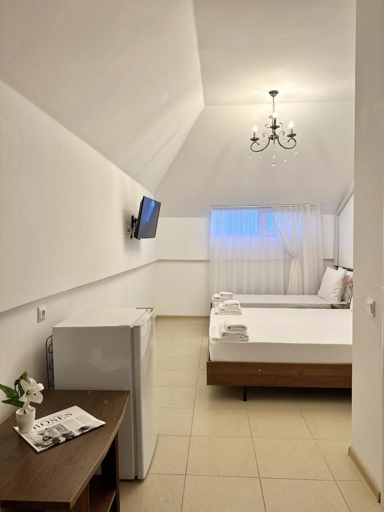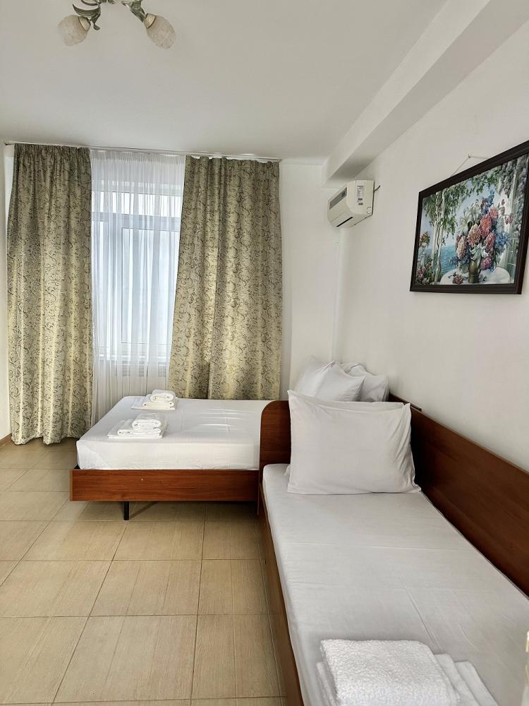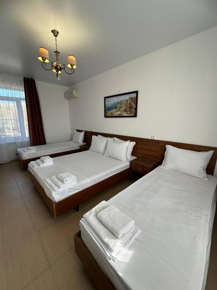 Комната стандарт с 2 односпальными и 1 двуспальной кроватью. В комнате: телевизор, кондиционер, санузел с душем. Гостям предоставляется постельное белье и полотенца.