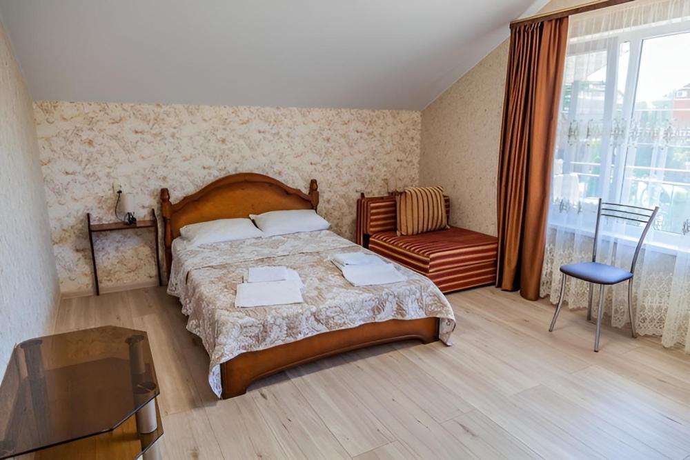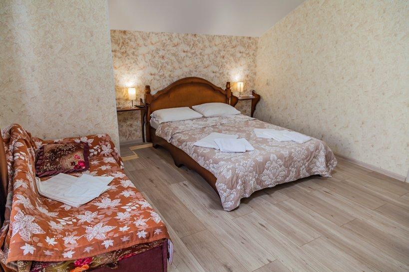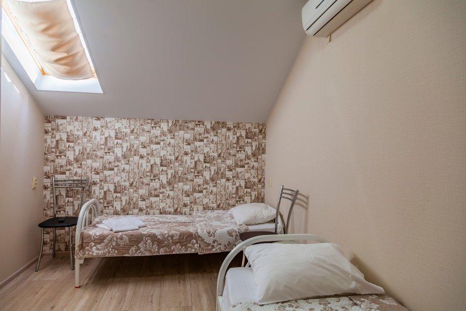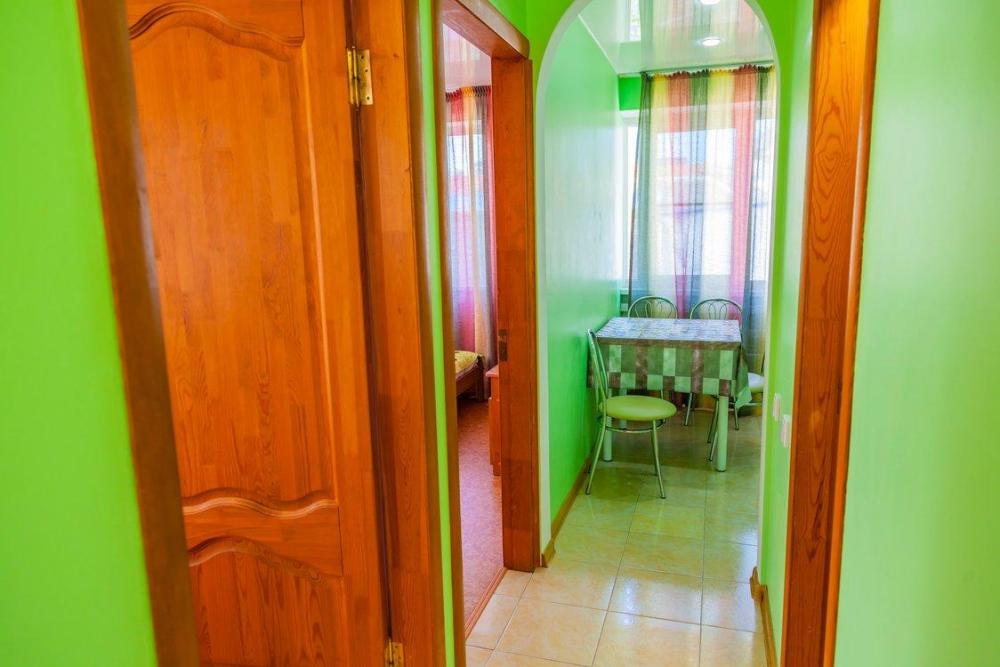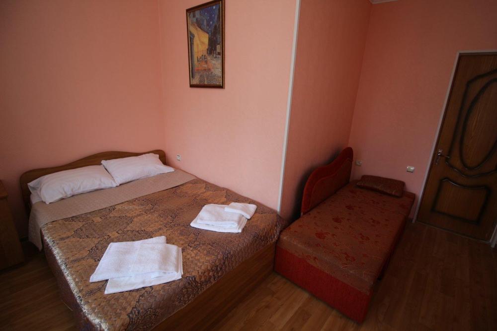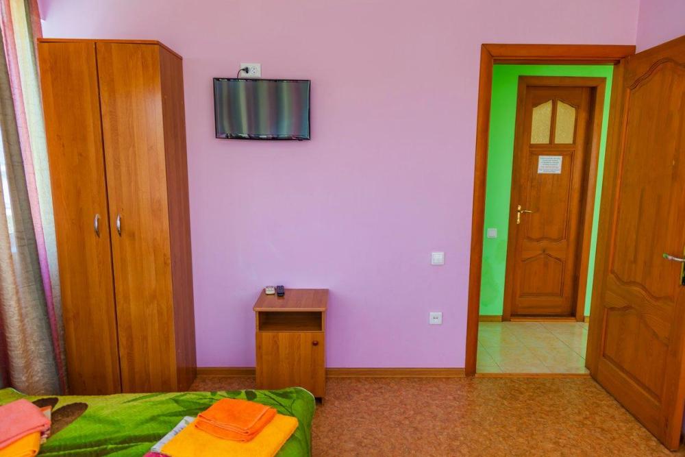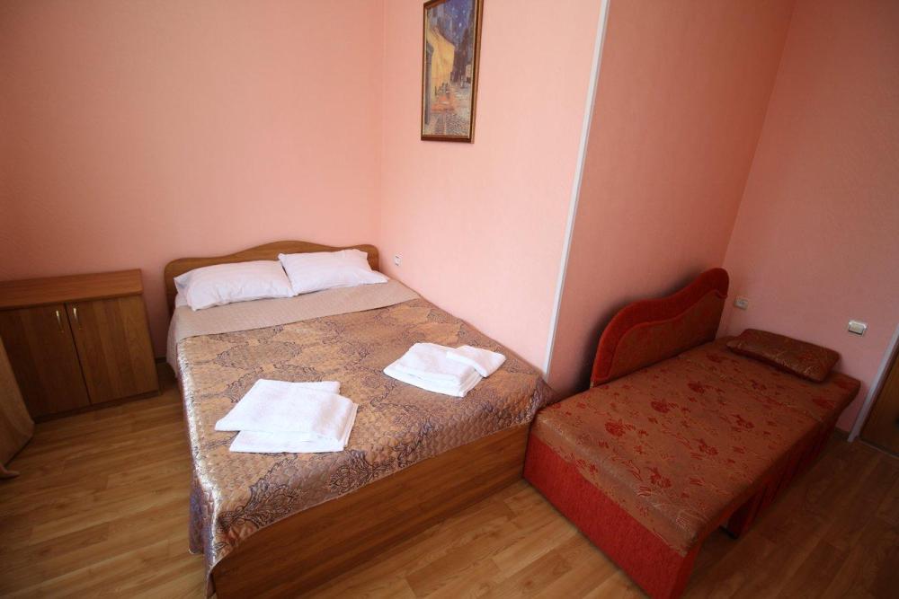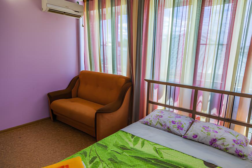 Комнат: 1, Этаж: 2. Кухня: общая оборудованная. Санузел: в номере. Мебель: двуспальные и односпальные кровати, кресло раскладное, тумбочки, шкаф, стулья. Описание: возможно установить доп. место платно.