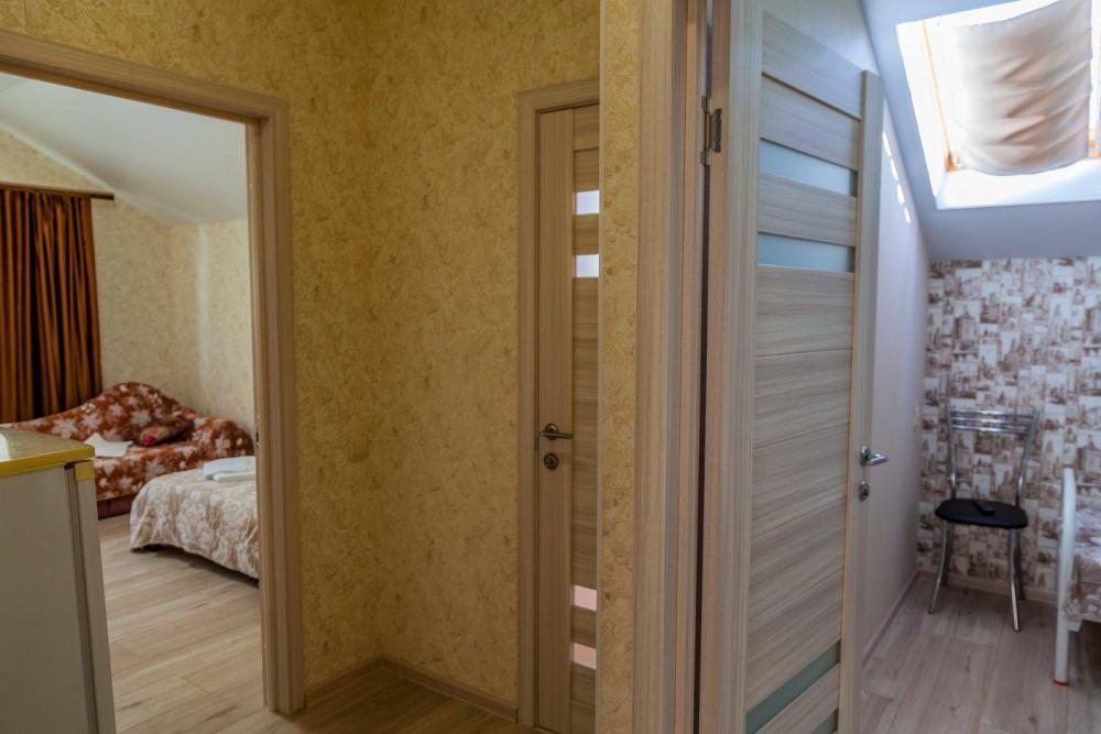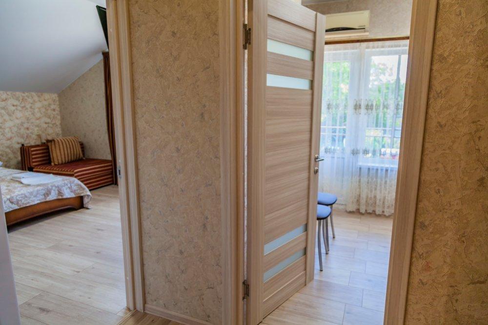 Двухкомнатный люкс, с мини кухней (столик, кухонный гарнитур, холодильник, микроволновая печь, электрический чайник). В одной комнате двухспальная кровать, во второй комнате двухспальная кровать и диван на двоих. Каждая комната изолирована. Кондиционер, телевизор, мебель. Санузел.