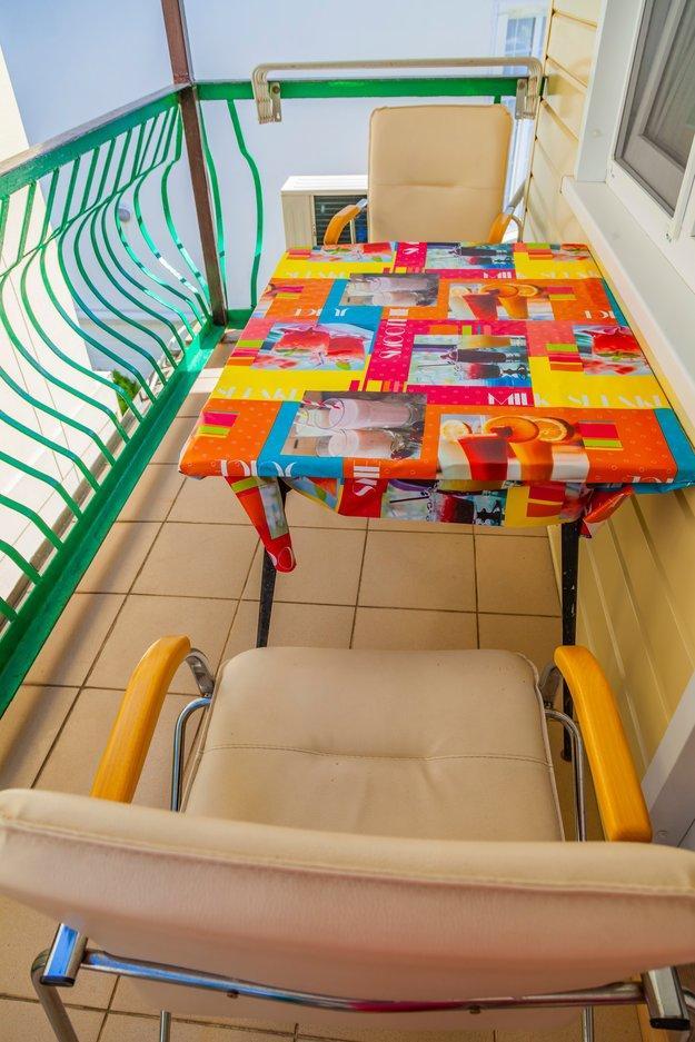 Комнат: 2, Этаж: 2, Площадь: 40 м². Кухня: общая оборудованная. Санузел: в номере. Мебель: двуспальная и односпальные кровати, диван-кровать, шкаф, стулья, прикроватные тумбочки, журнальный столик. Уютный балкон с видом на внутренний дворик.
