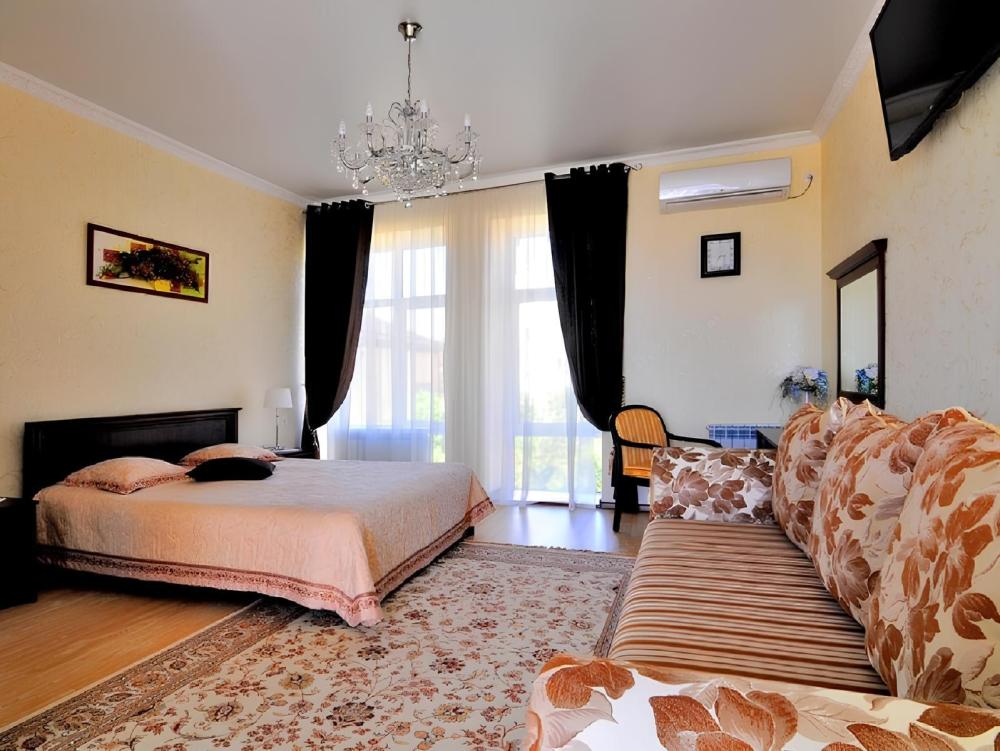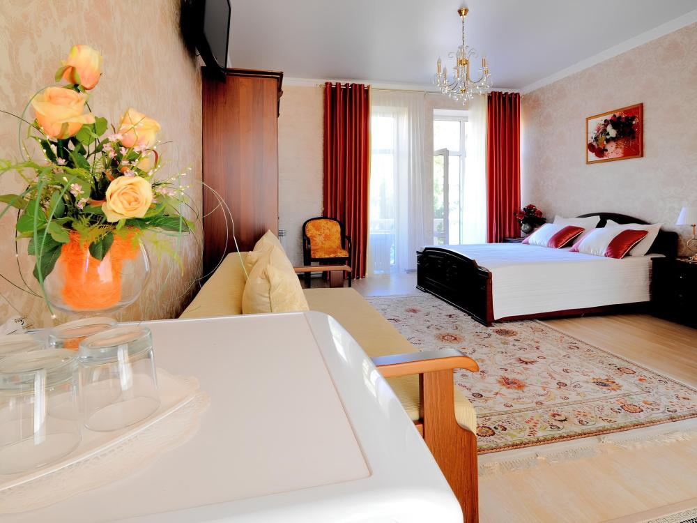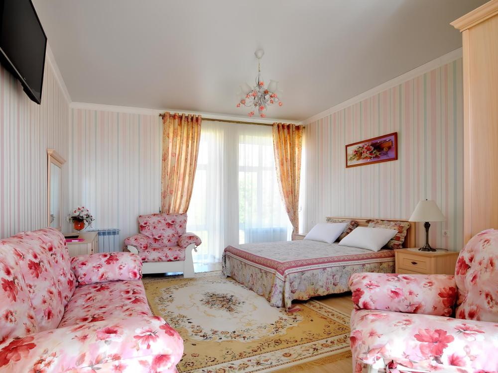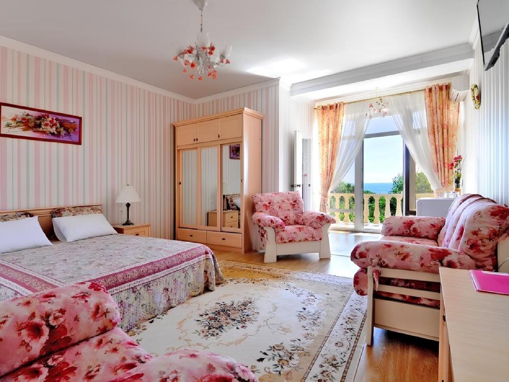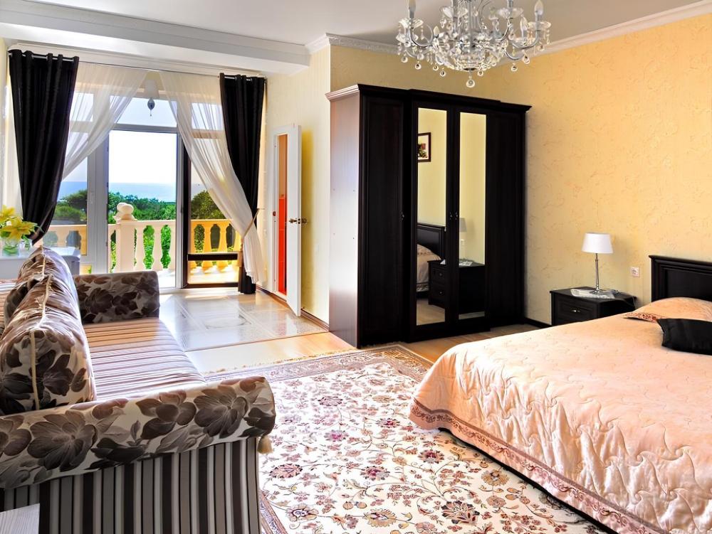 Двуспальная кровать, двуспальный кожаный диван, 2 кожаных кресла, односпальная кровать, ванная, сервис с посудой, 2 балкона. Смотровая площадка с видом на море и горы(предоставляются шезлонги и столики), двор, шатёр, беседки, кухня, парковка, рядом зарядка электромобилей. Доп. плат. услуги: Столовая, услуги трансфера, детские коляски на прокат, стирка и сушка белья