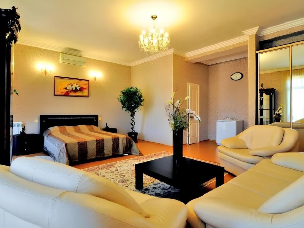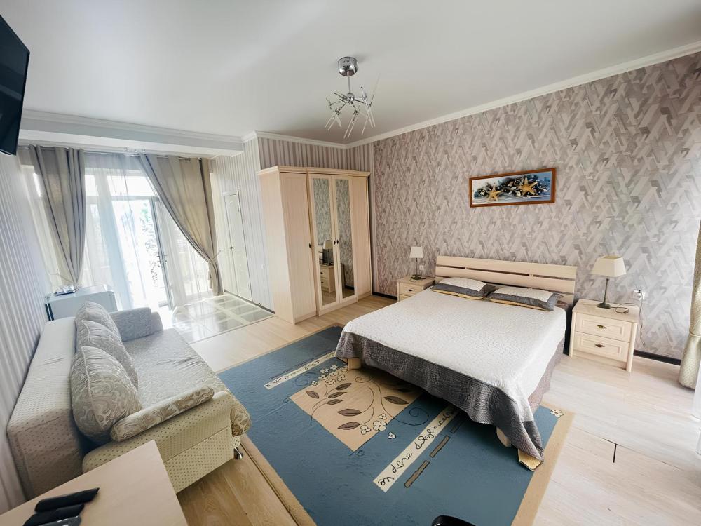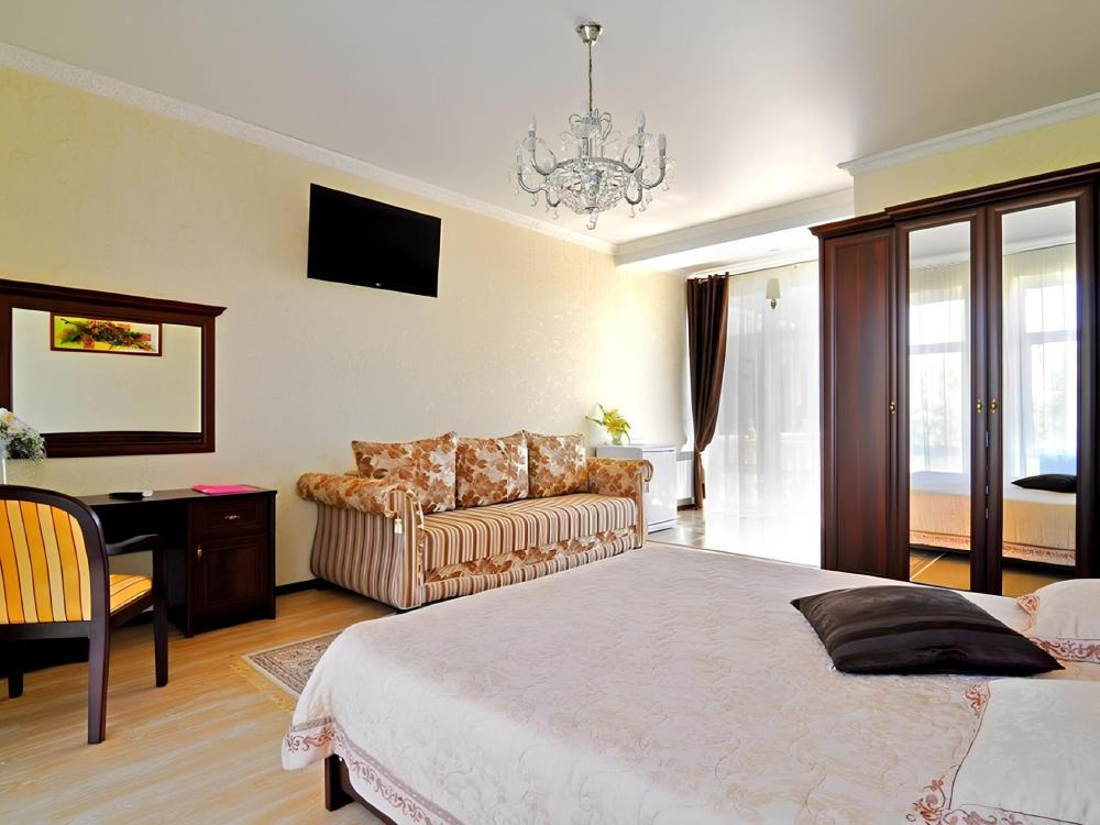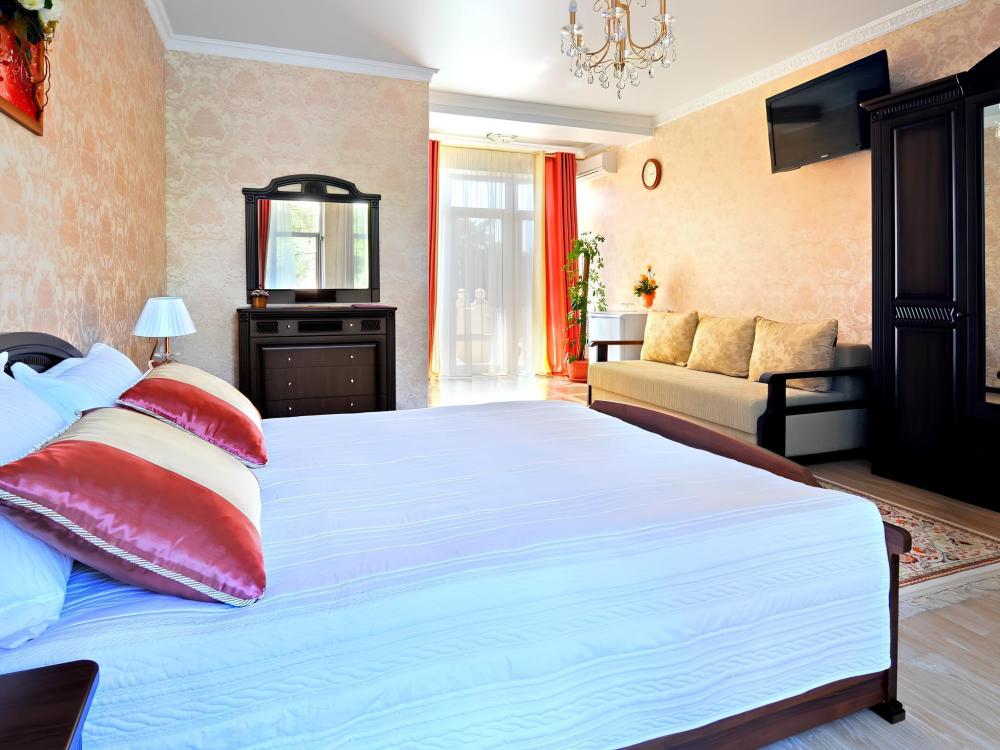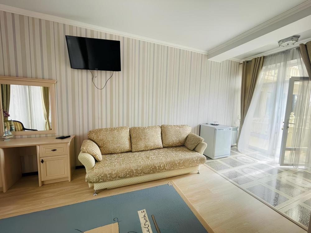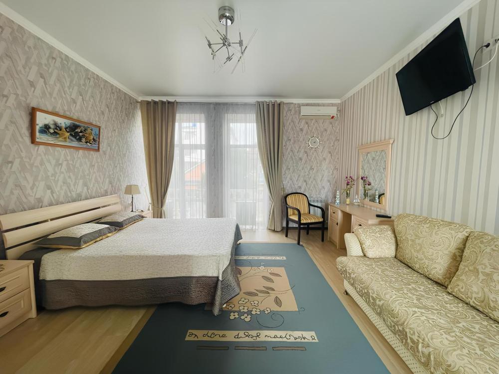 Двуспальная кровать, двуспальный кожаный диван, 2 кожаных кресла, односпальная кровать, ванная, сервис с посудой, 2 балкона. Смотровая площадка с видом на море и горы(предоставляются шезлонги и столики), двор, шатёр, беседки, кухня, парковка, рядом зарядка электромобилей. Доп. плат. услуги: Столовая, услуги трансфера, детские коляски на прокат, стирка и сушка белья