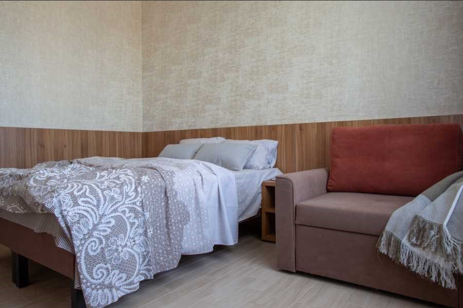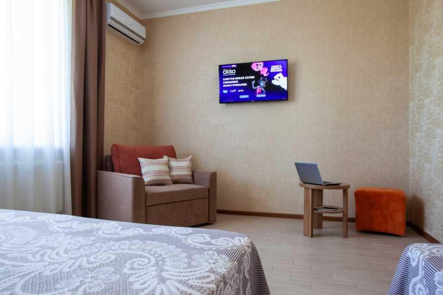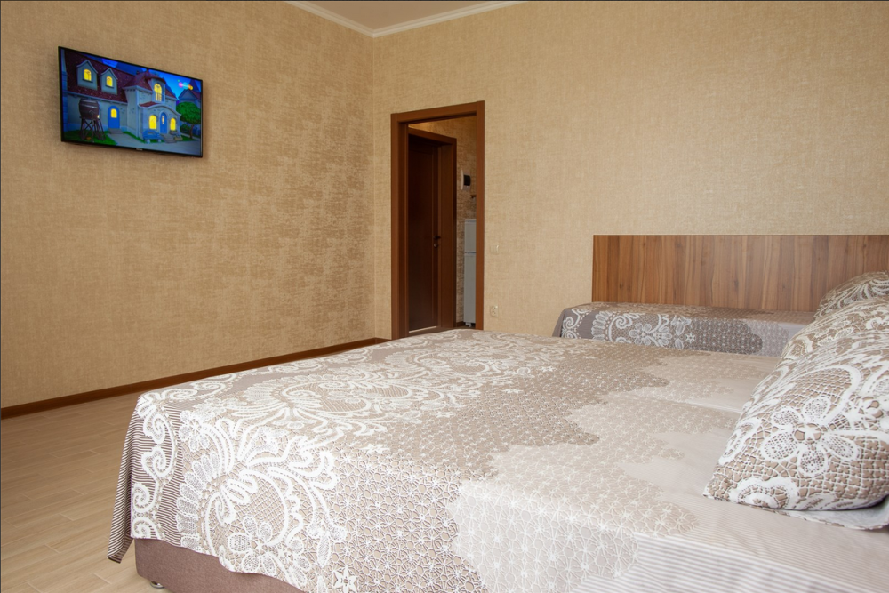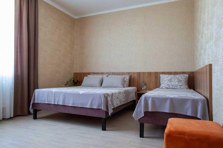 Стандарт трехместный - просторный однокомнатный номер повышенной степени комфортности. Он отлично подойдет для гостей, которые уделяют внимание как комфорту, простору номера так и функциональности. Дополнительное место в сочетании с просторным номером не стеснит пребывание большой семьи . Рассчитан на проживание 2-3-4х человек (с возможностью дополнительного места). Кухня общего пользования на 1 этаже - оборудована всем необходимым для приготовления пищи.