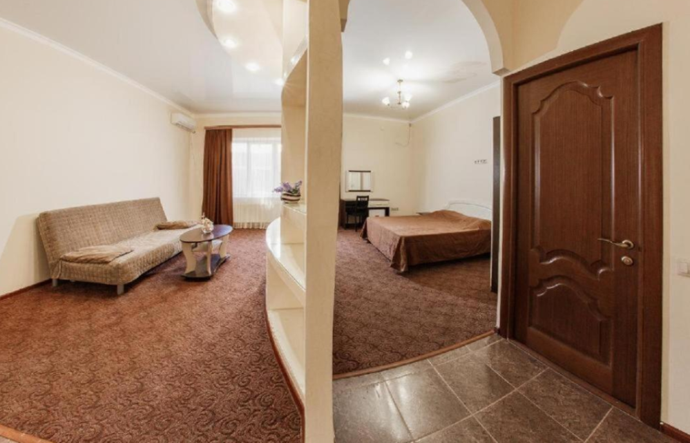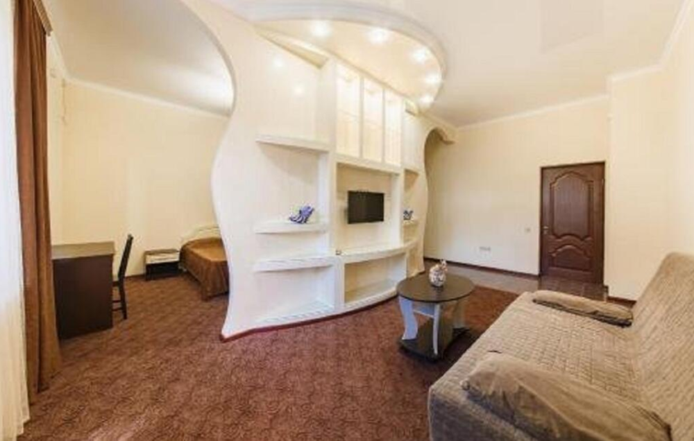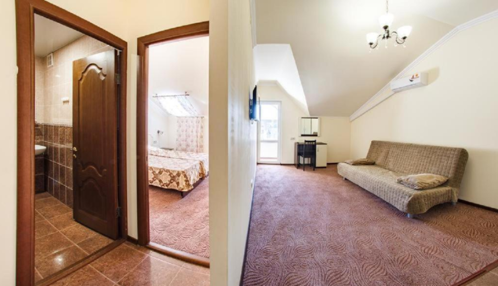 Представляем вашему вниманию просторный четырехместный номер-студио. Этот номер идеально подойдет для семьи или компании друзей, которые хотят провести незабываемый отдых в Анапе. В номере удобная двухспальная кровать, двухспальный диван, стол, холодильник, фен, ЖК-телевизор, кондиционер, сушилка для белья, ванная комната и бесплатные туалетно-косметические принадлежности.
