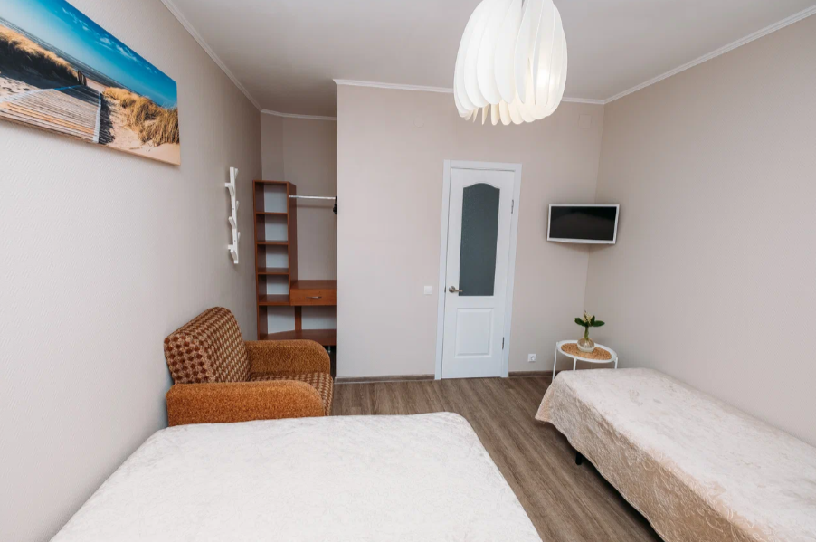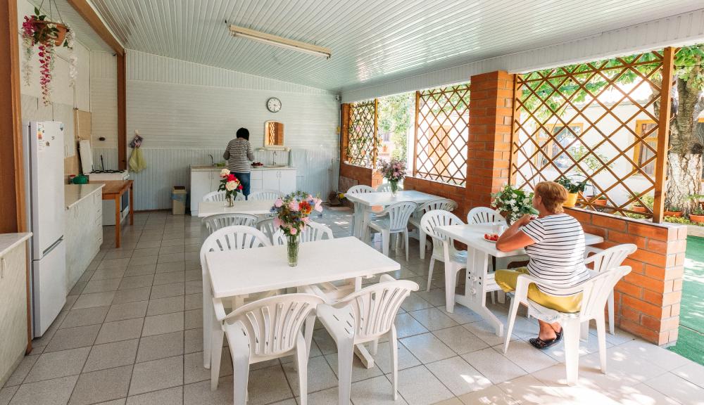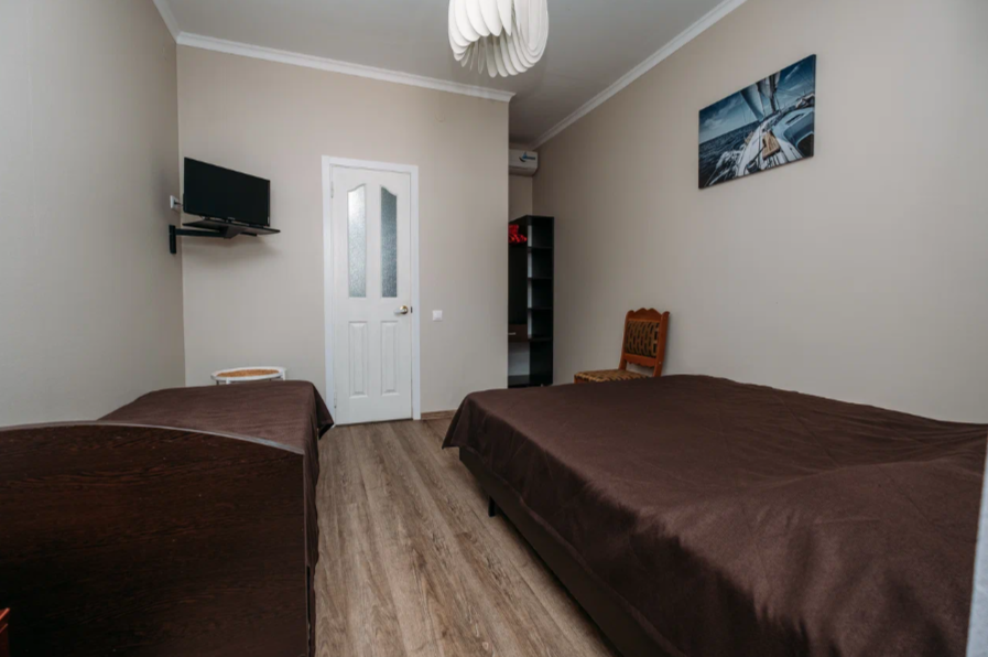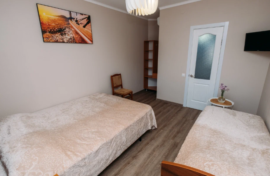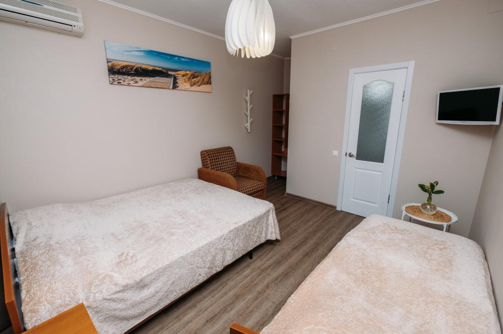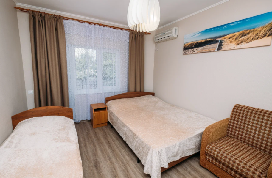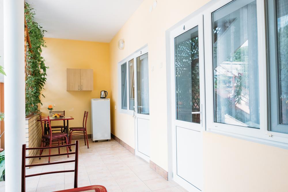В комнате имеется одна двуспальная кровать и одна односпальная. Имеется возможность размещения одного дополнительного места на раздвижном кресле кровати. У каждой комнаты имеется отдельная терраса с летней мебелью, столиком, электрическим чайником и холодильником. Комнаты имеют сплит-систему, телевизор, холодильник и санузел.