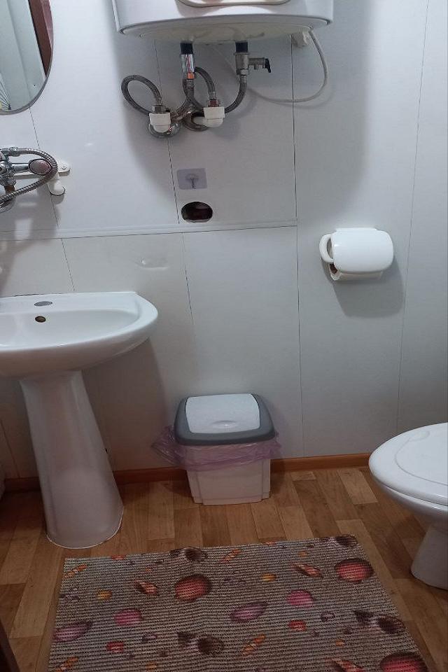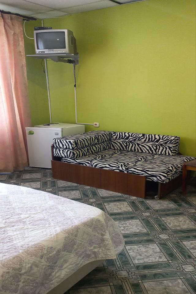 В номере одна двуспальная, одна полутороспальная кровать, раскладной диван и дополнительное спальное место. Санузел на этаже.