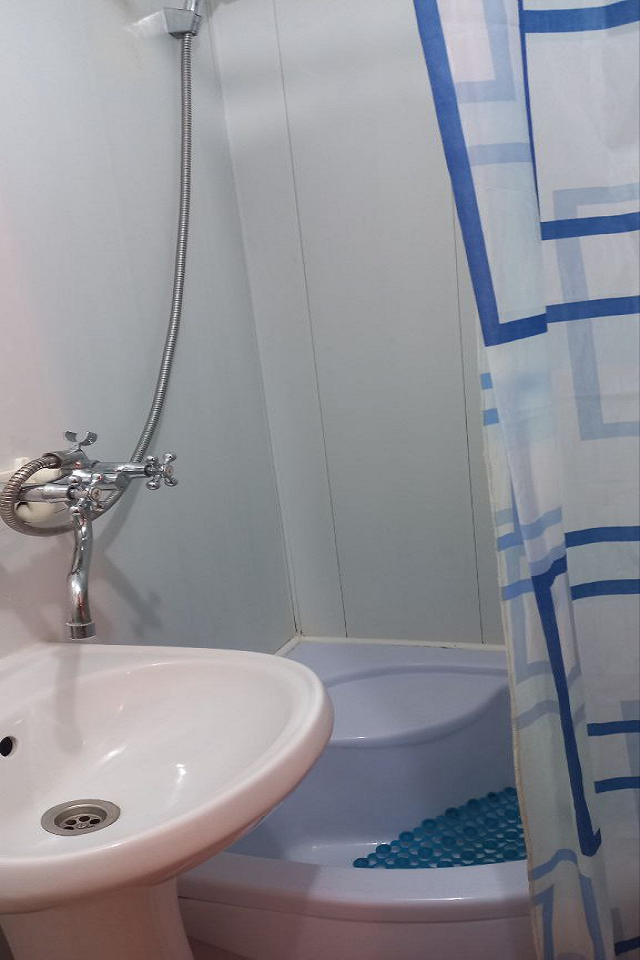 В номере одна двуспальная кровать. Санузел находится в номере.