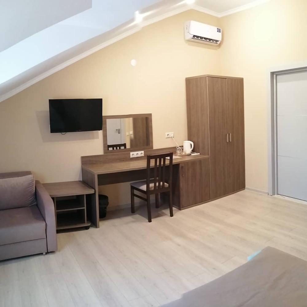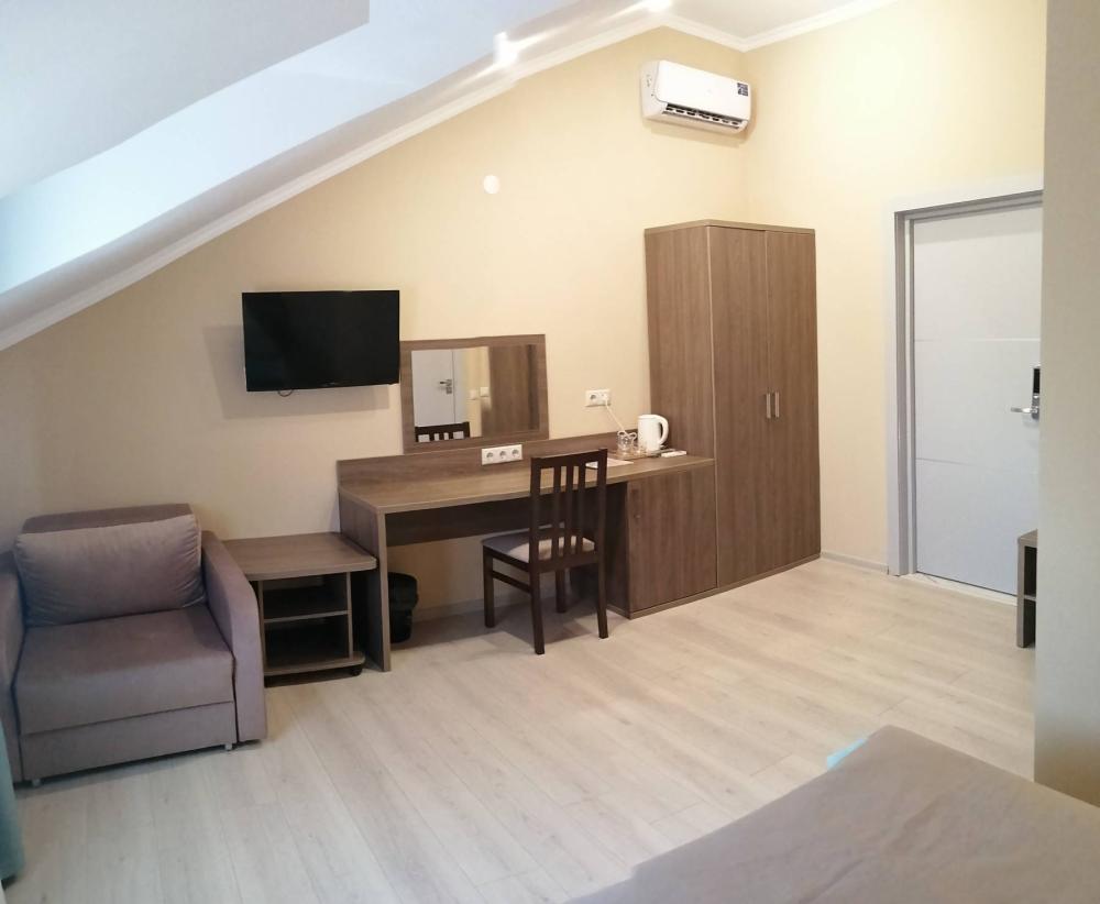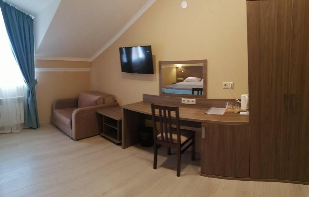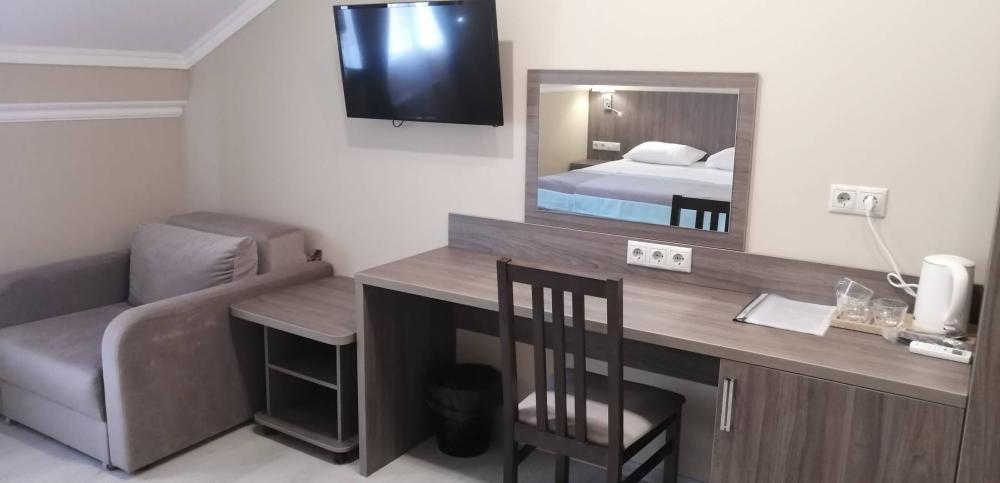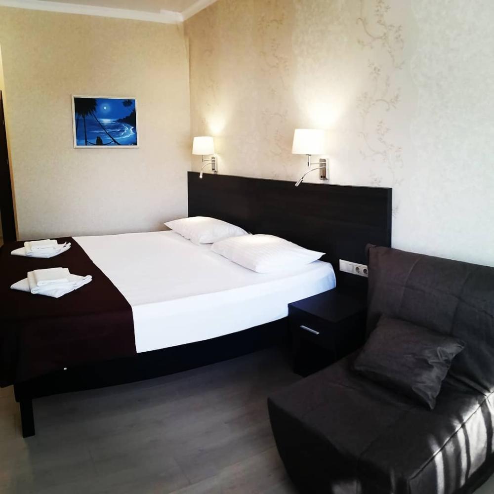 Номер повышенной комфортности с одной большой кроватью или двумя односпальными кроватями и раскладным диваном. В номере есть всё необходимое для комфортного проживания от одного до четырёх гостей: большой БАЛКОН, прихожая, шкаф, стол, стул, журнальный столик, прикроватные тумбочки, зеркало, телевизор, сейф, мини-холодильник, кондиционер, сушилка для белья, а также оборудованная ванная комната с душем, зеркалом и феном. Площадь номера 21-28 м2.