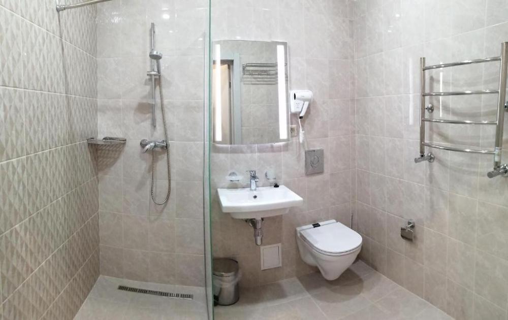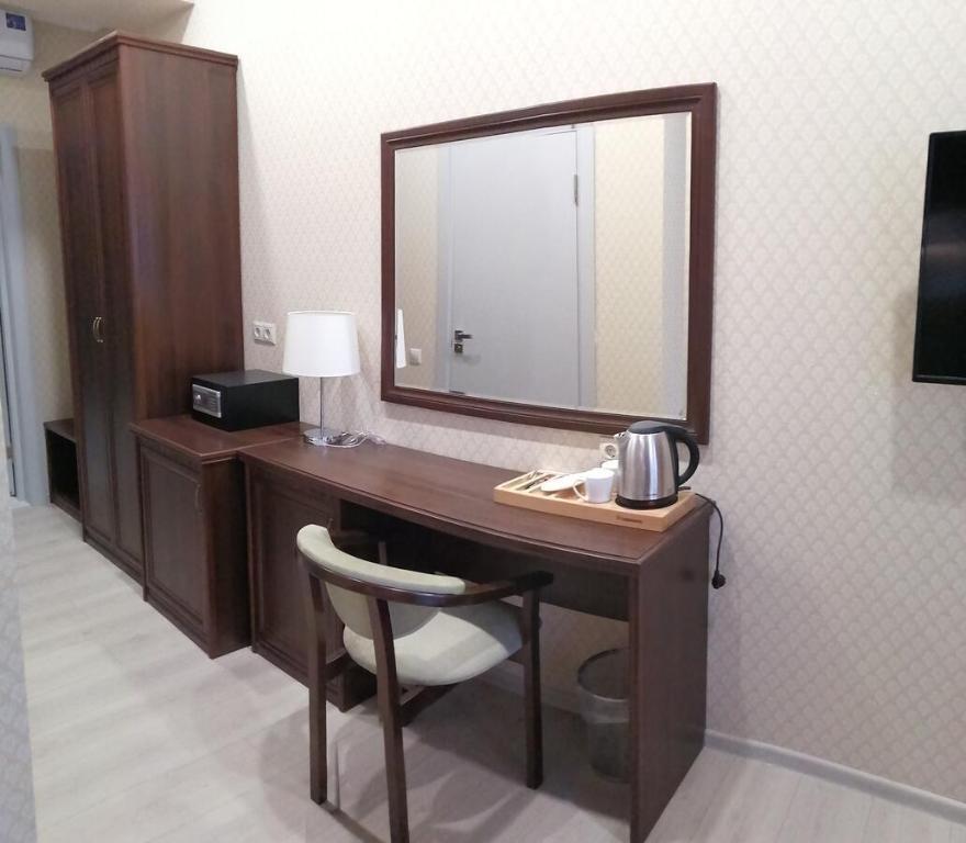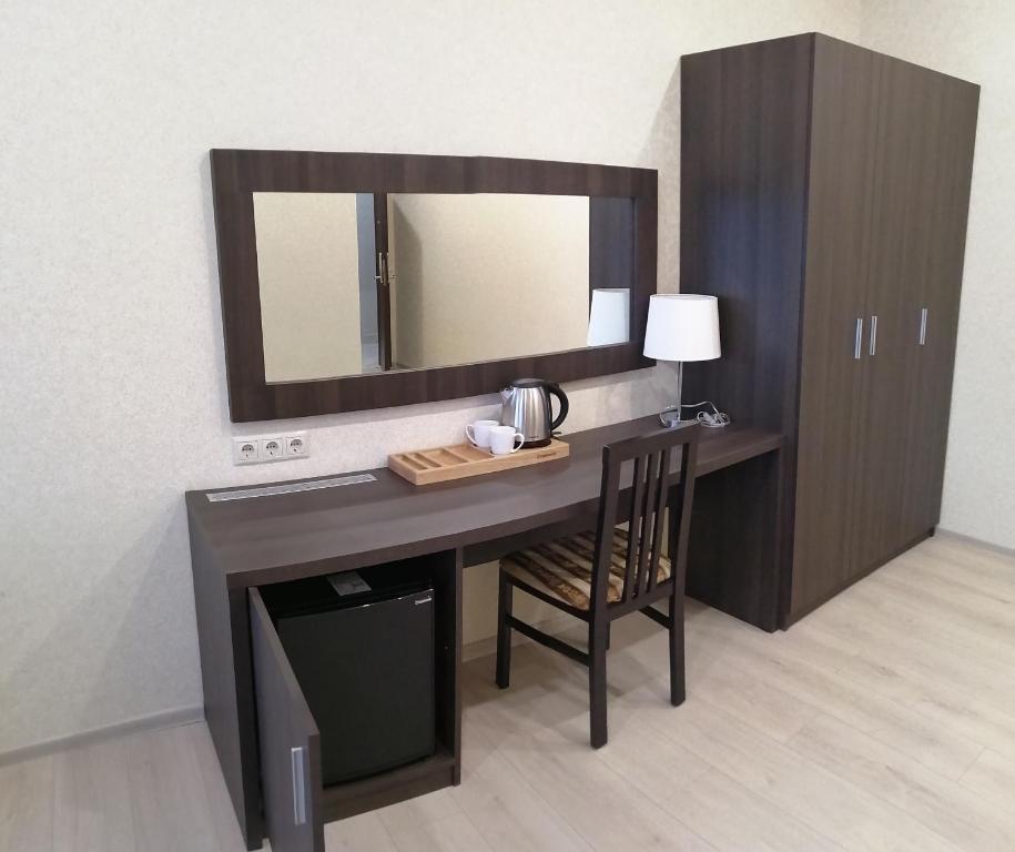 Двухместная комната с одной большой кроватью или двумя односпальными кроватями. В номере есть всё необходимое для комфортного проживания одного или двух гостей: прихожая, шкаф, стол, стул, прикроватные тумбочки, журнальный столик, зеркало, телевизор, мини-холодильник, кондиционер, сушилка для белья, а также оборудованная ванная комната с душем, зеркалом и феном.