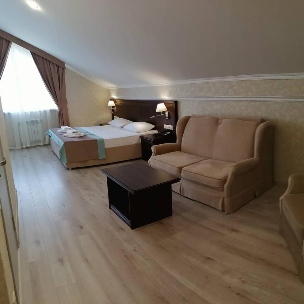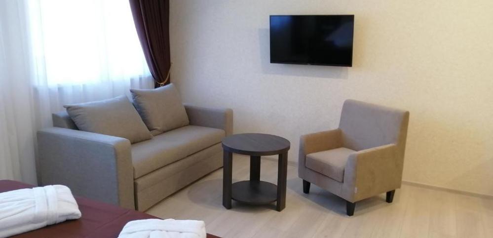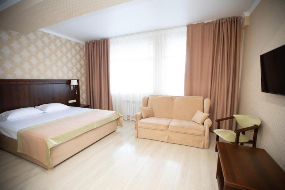 Просторный номер повышенной комфортности с одной большой кроватью или двумя односпальными кроватями, раскладным диваном и креслом. В номере есть всё необходимое для комфортного проживания от одного до четырёх гостей: большой БАЛКОН, прихожая, шкаф, стол, стулья, журнальный столик, прикроватные тумбочки, зеркало, телевизор, мини-холодильник, сейф, кондиционер, сушилка для белья, а также оборудованная ванная комната с душем, зеркалом и феном. Площадь номера 30-34 м2.