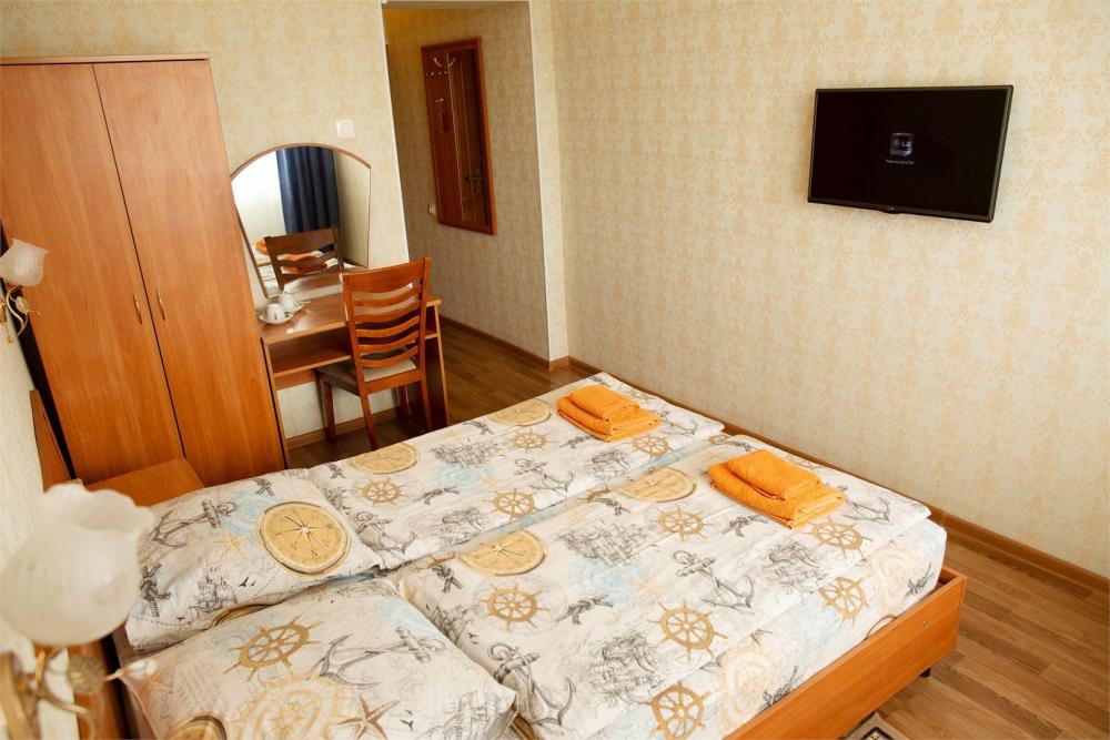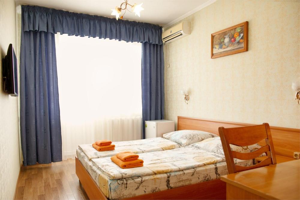 14 кв.м с балконом. В номере: телевизор, холодильник, кондиционер, две односпальные кровати, две прикроватные тумбочки, шкаф, туалетный столик, санузел с душем.