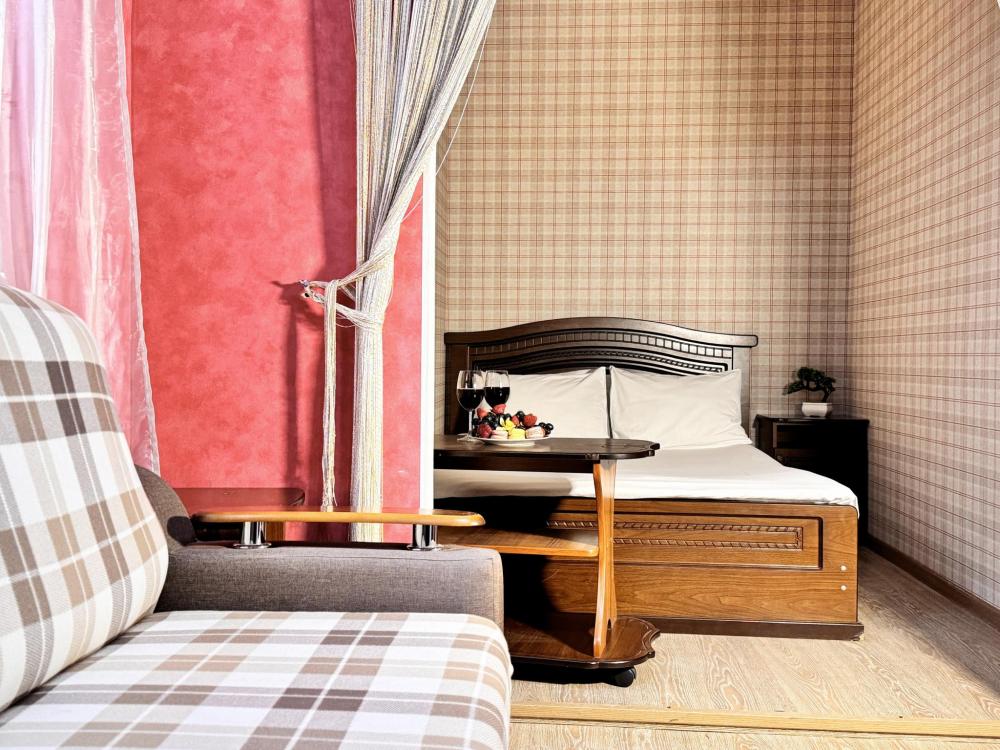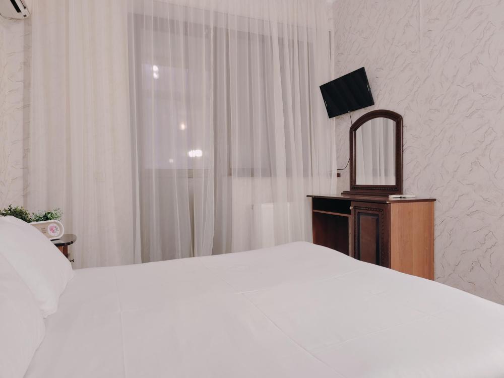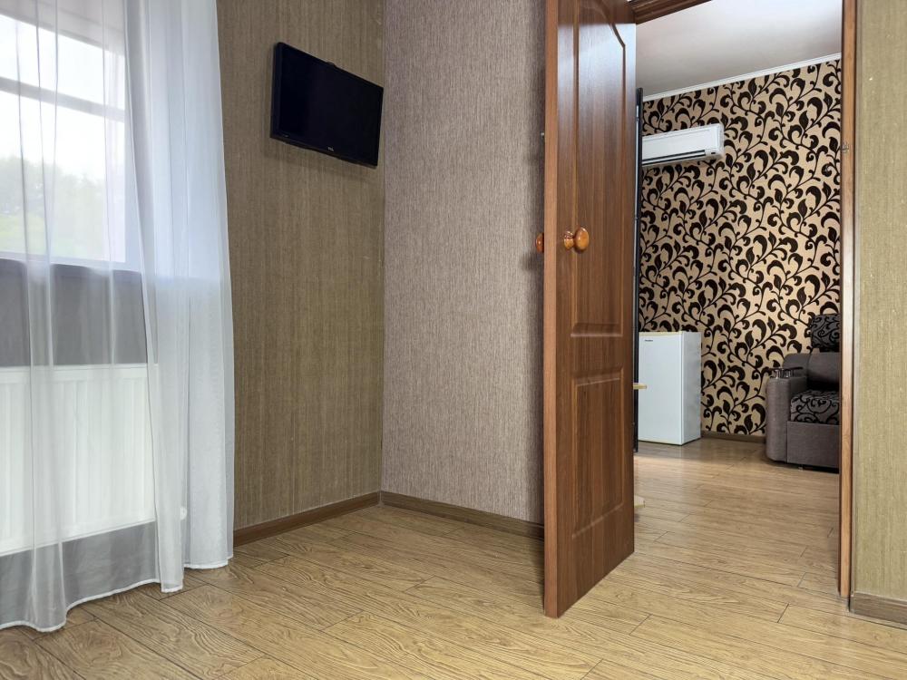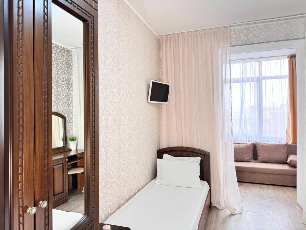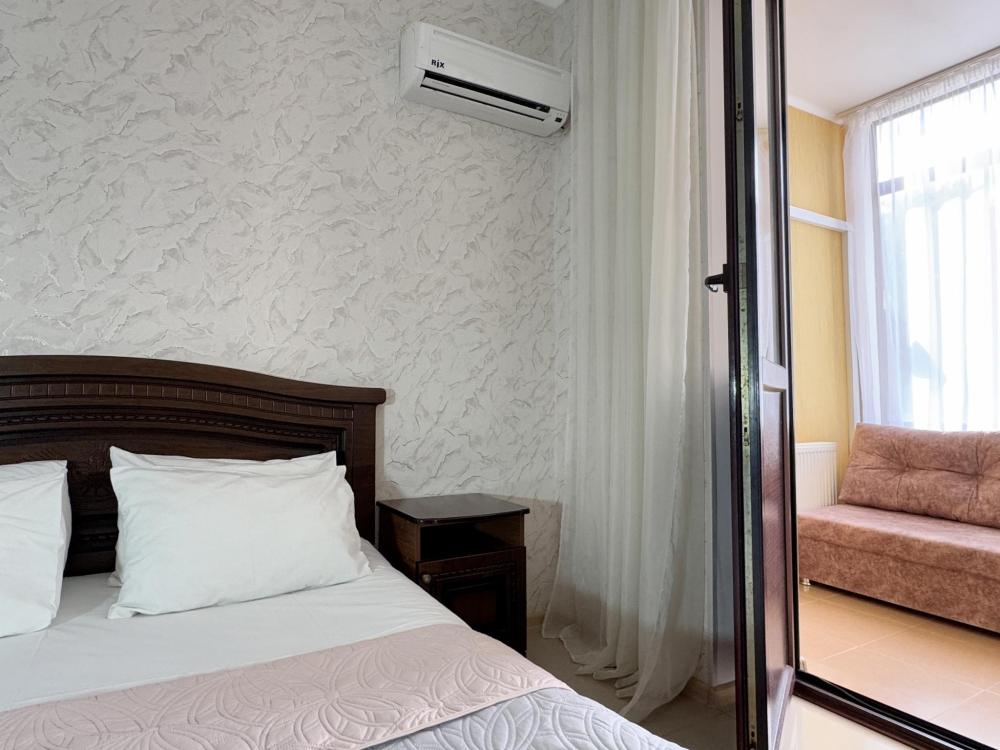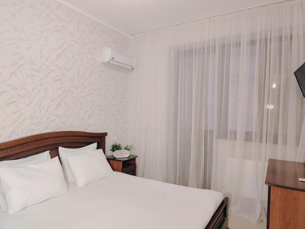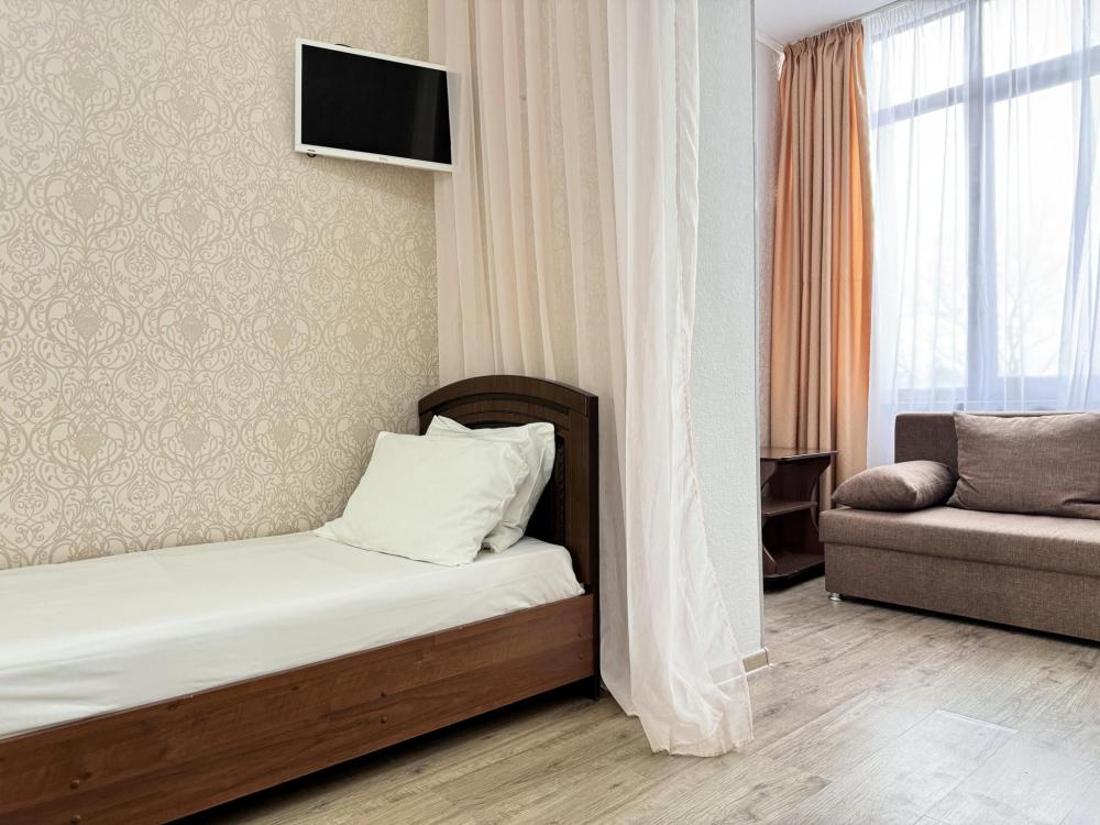 Уютный двухместный номер. В номере имеется двуспальная кровать, шкаф, гостиная зона (диванчик, журнальный столик, телевизор, мини-холодильник), кондиционер. Ванная комната: душевая кабина, раковина, туалет. Номер без балкона.