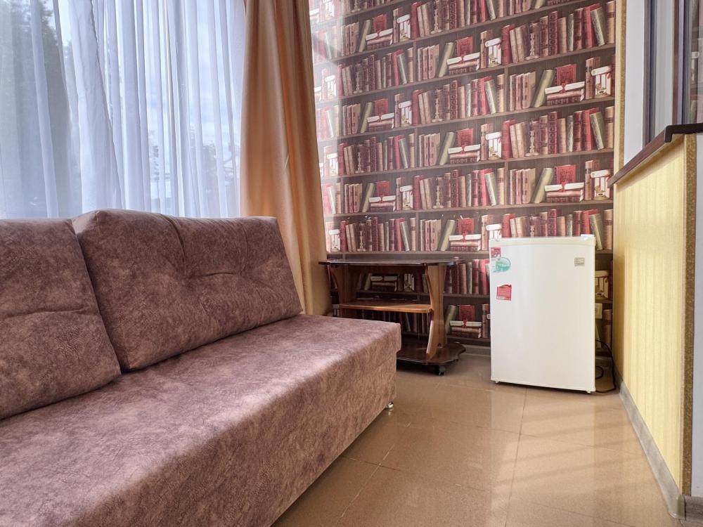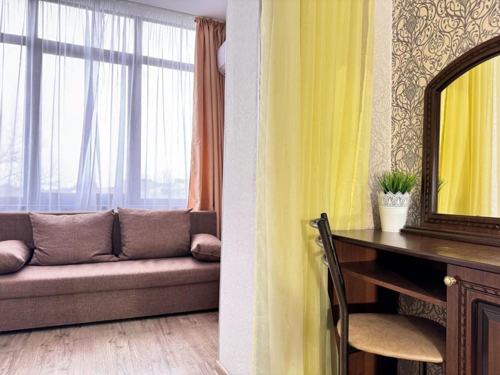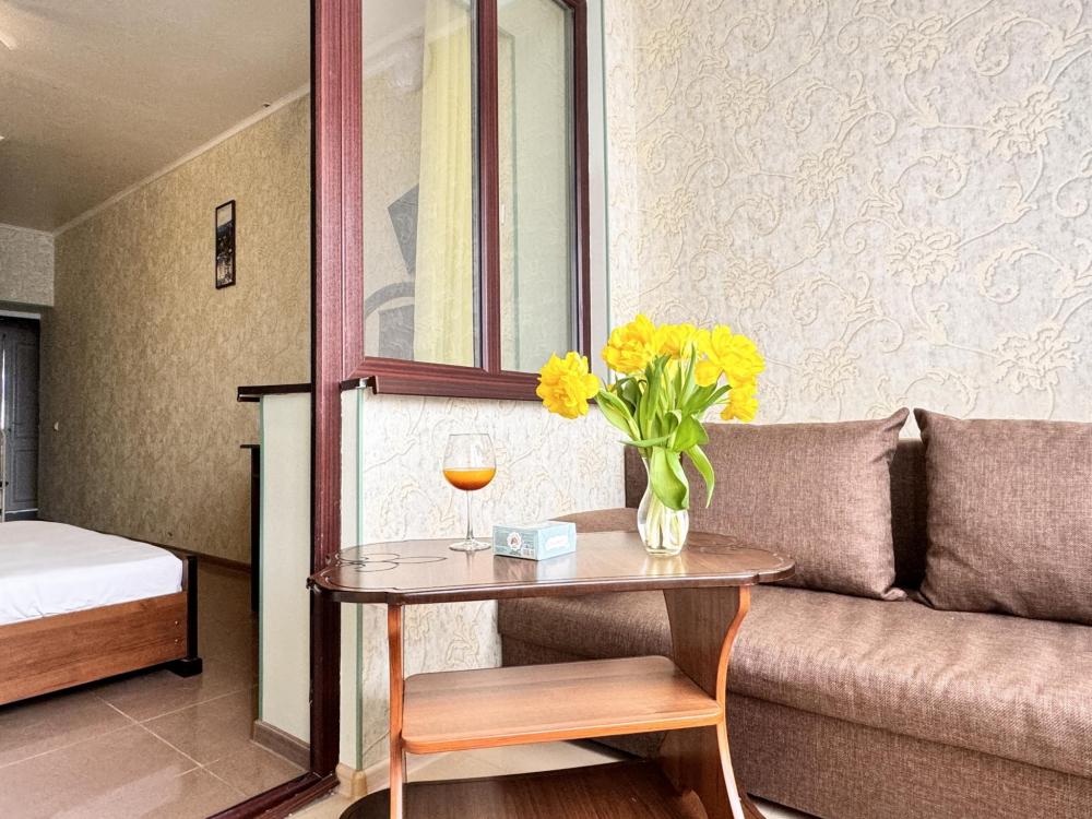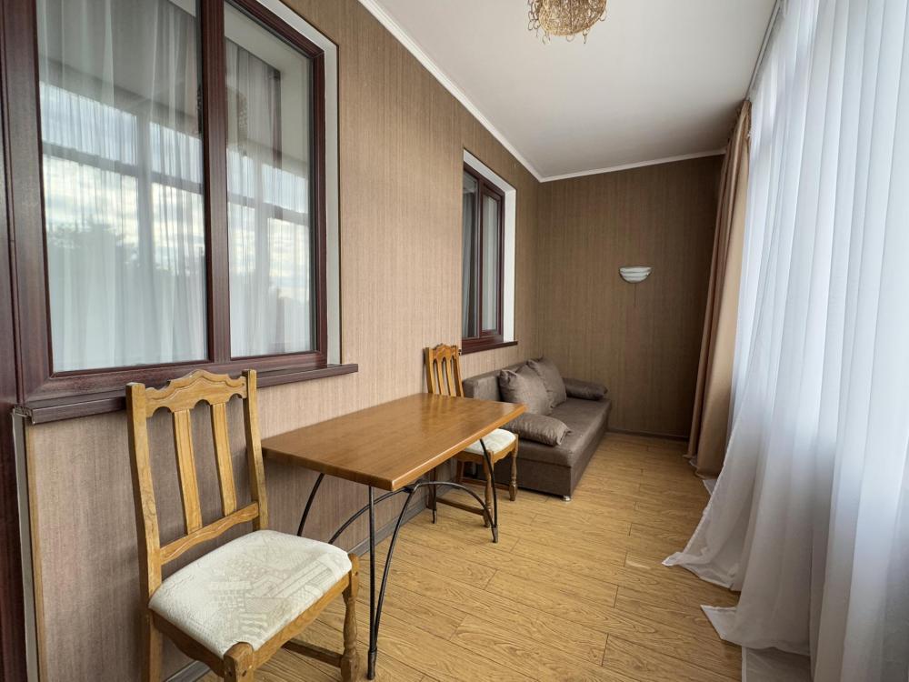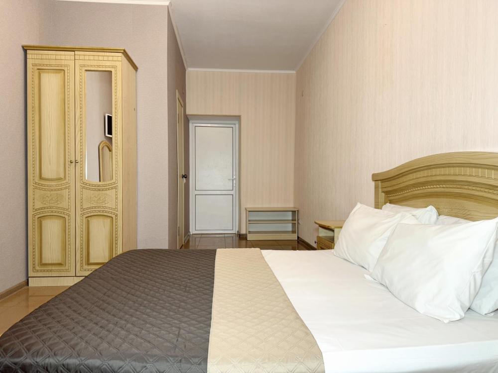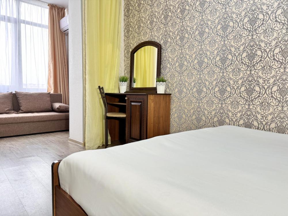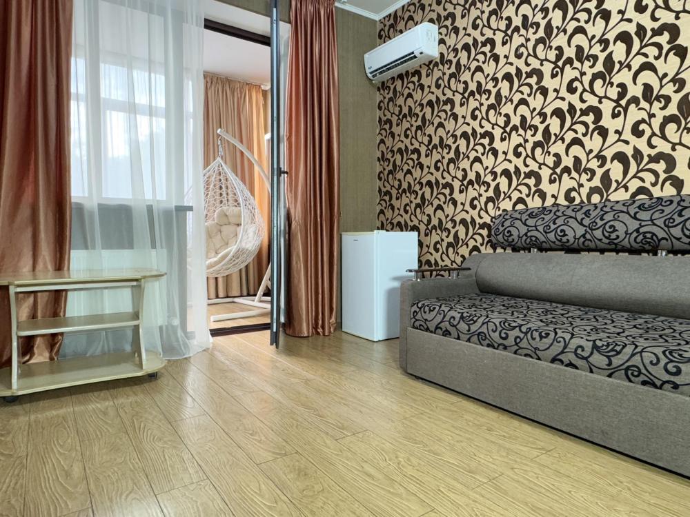 Просторный однокомнатный номер с возможность размещения до 5ти человек. В номере имеется: двуспальная кровать, диван-кровать, кресло-кровать, прикроватные тумбочки, журнальный столик, шкаф, телевизор, мини-холодильник, кондиционер. На лоджии находится кресло-кокон. Ванная комната: душевая кабина, раковина, туалет.