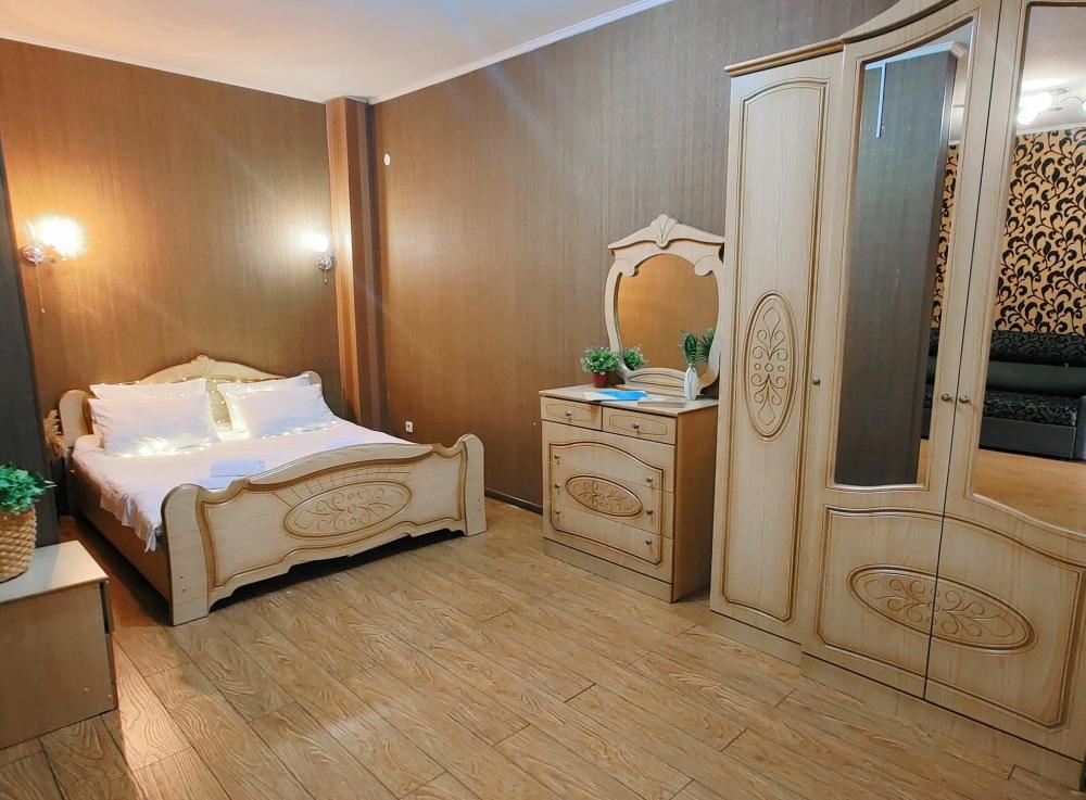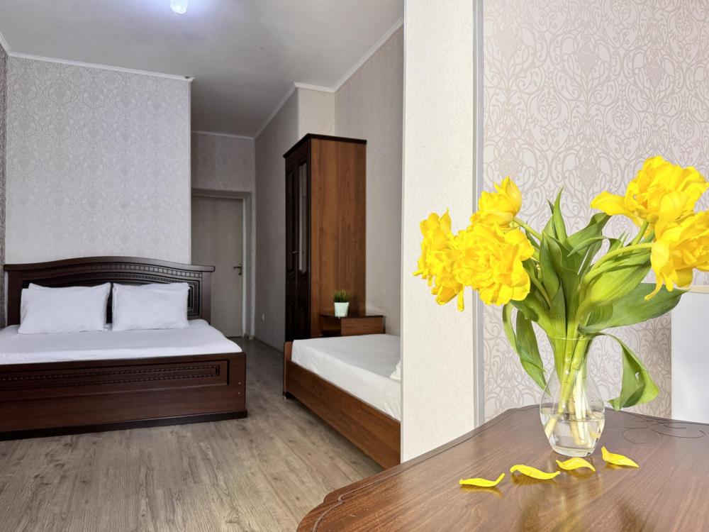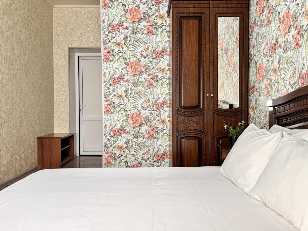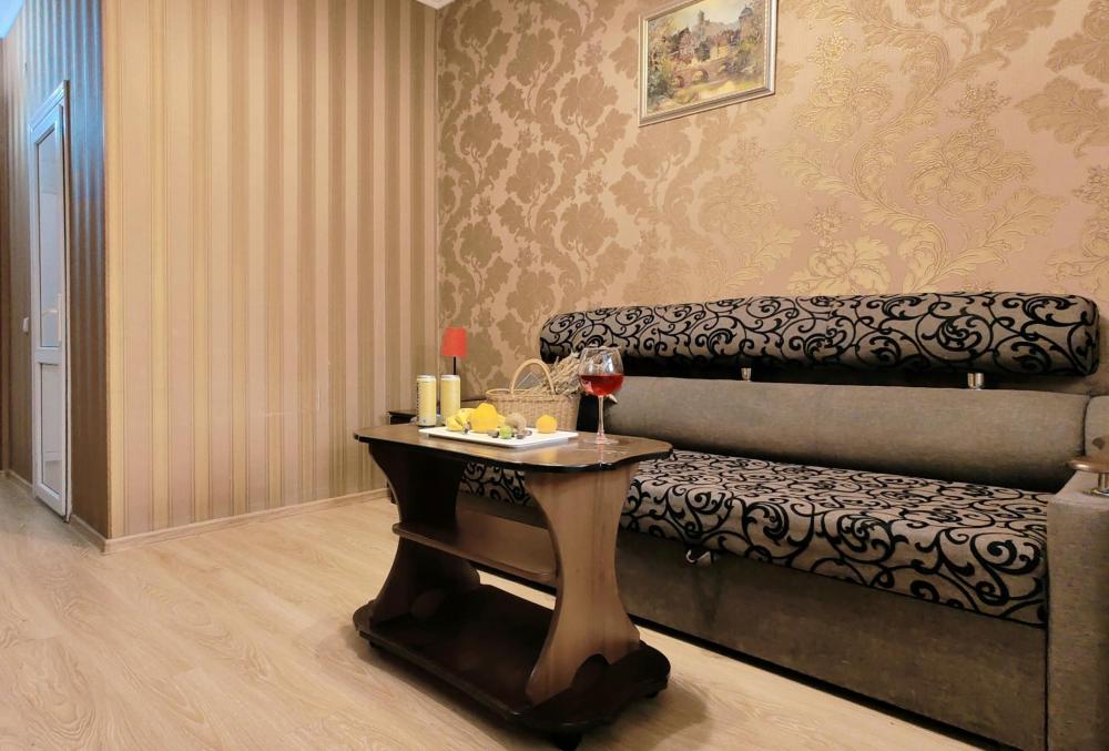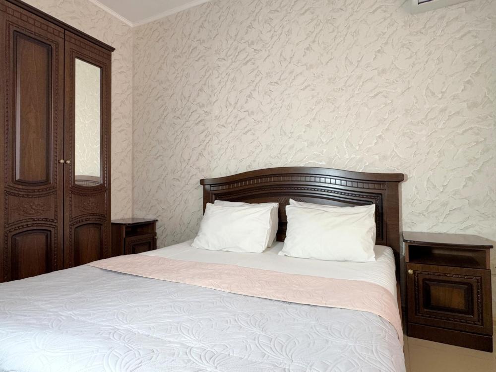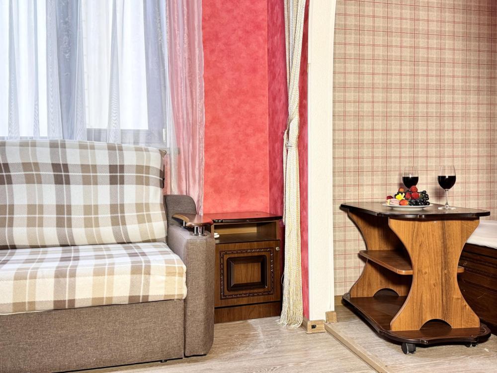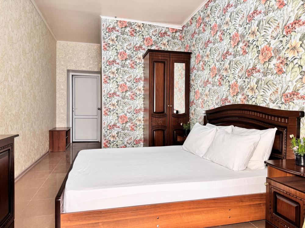 Просторный однокомнатный номер с возможность размещения до 5ти человек. В номере имеется: двуспальная кровать, диван-кровать, кресло-кровать, прикроватные тумбочки, журнальный столик, шкаф, телевизор, мини-холодильник, кондиционер. На лоджии находится кресло-кокон. Ванная комната: душевая кабина, раковина, туалет.