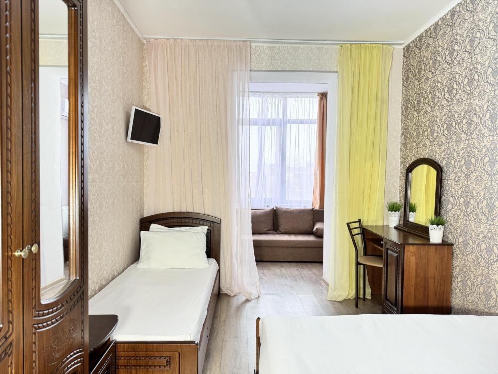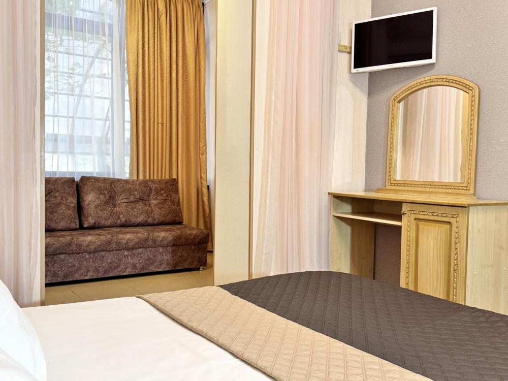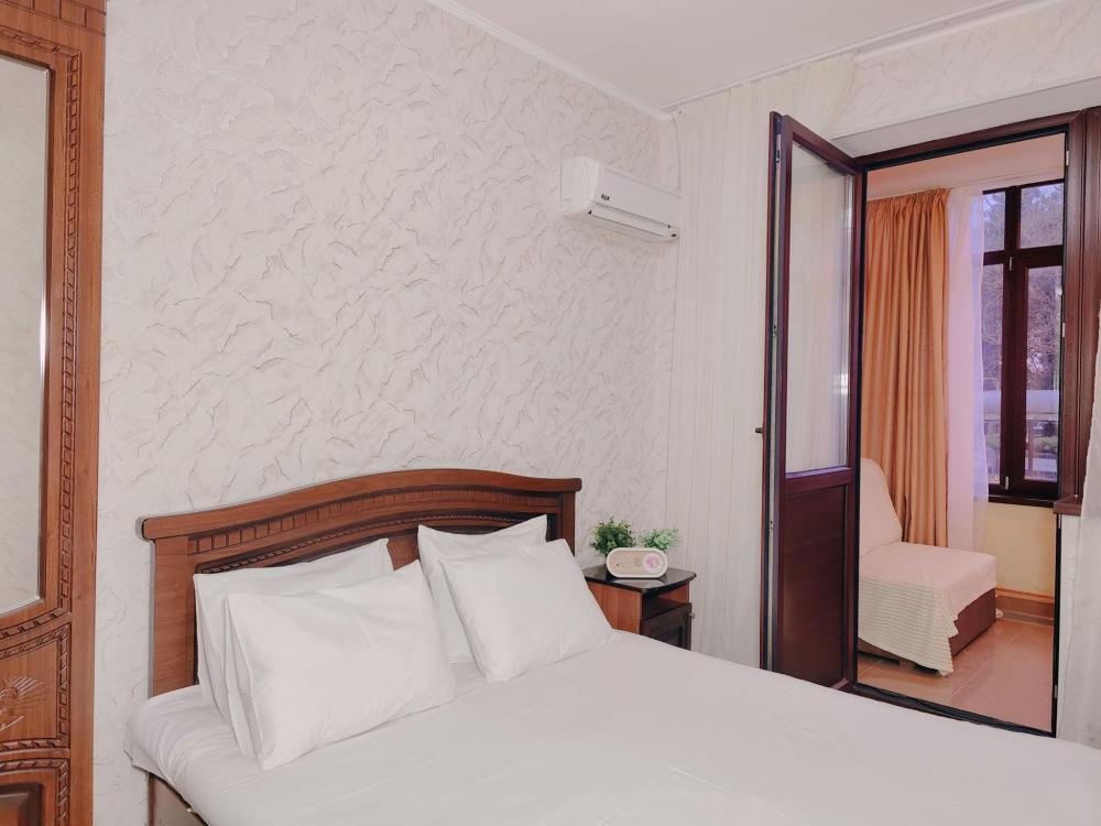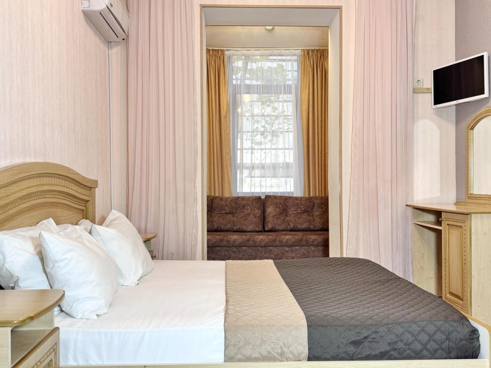 Уютный трехместный номер. Оснащение номера: двуспальная кровать, кресло-кровать, прикроватные тумбочки, туалетный столик, зеркало, шкаф, журнальный столик, телевизор, мини-холодильник, кондиционер. В номере имеется небольшая лоджия с видом на столовую и территорию отеля.