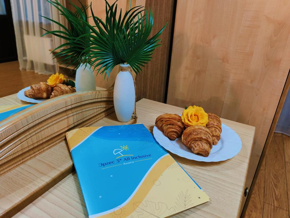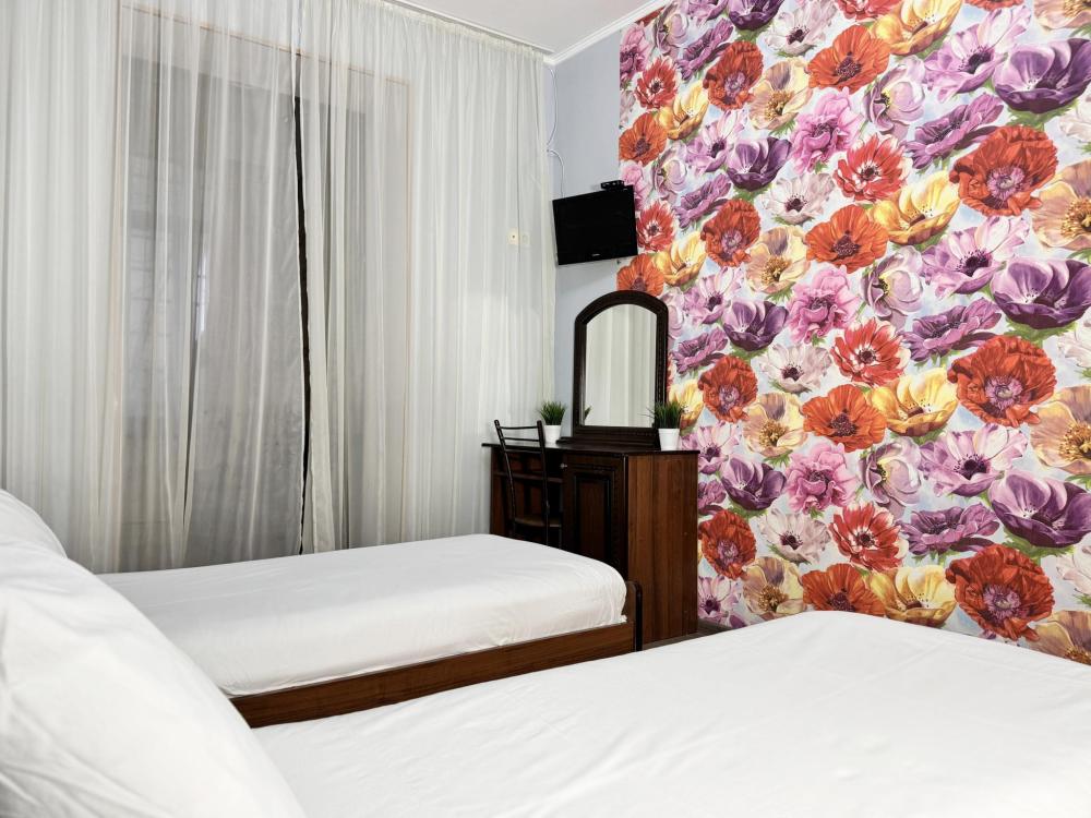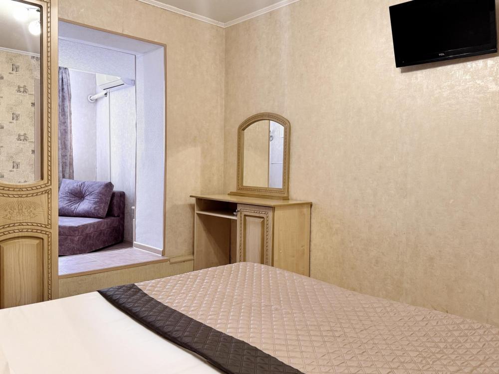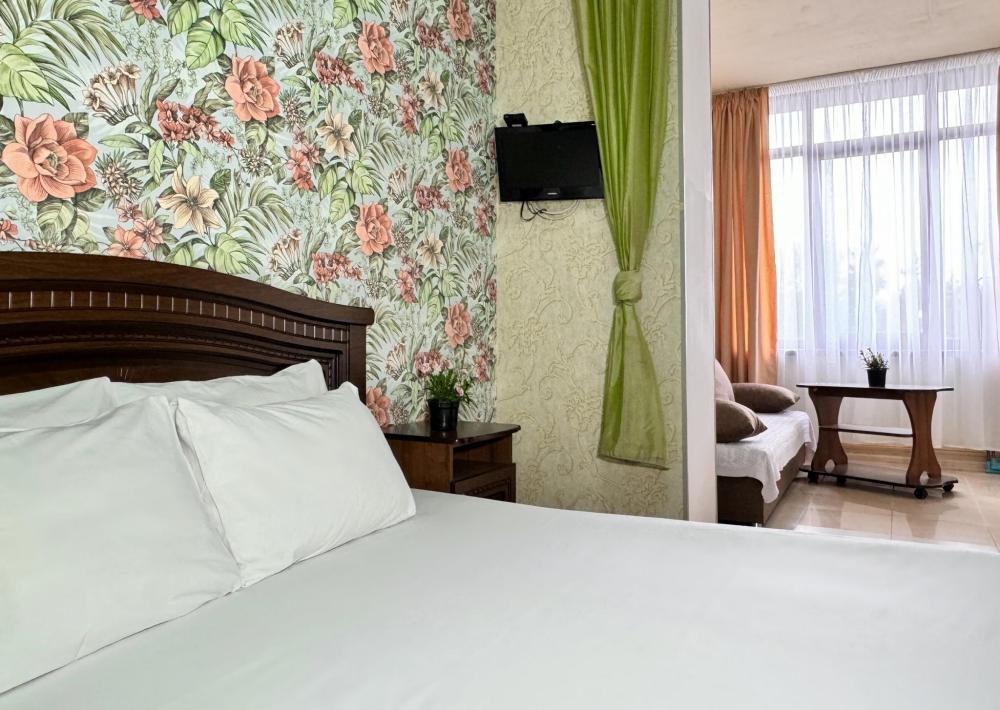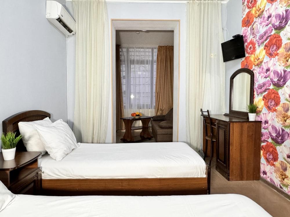 Уютный трехместный номер. Оснащение номера: двуспальная кровать, кресло-кровать, прикроватные тумбочки, туалетный столик, зеркало, шкаф, журнальный столик, телевизор, мини-холодильник, кондиционер. В номере имеется небольшая лоджия с видом на столовую и территорию отеля.
