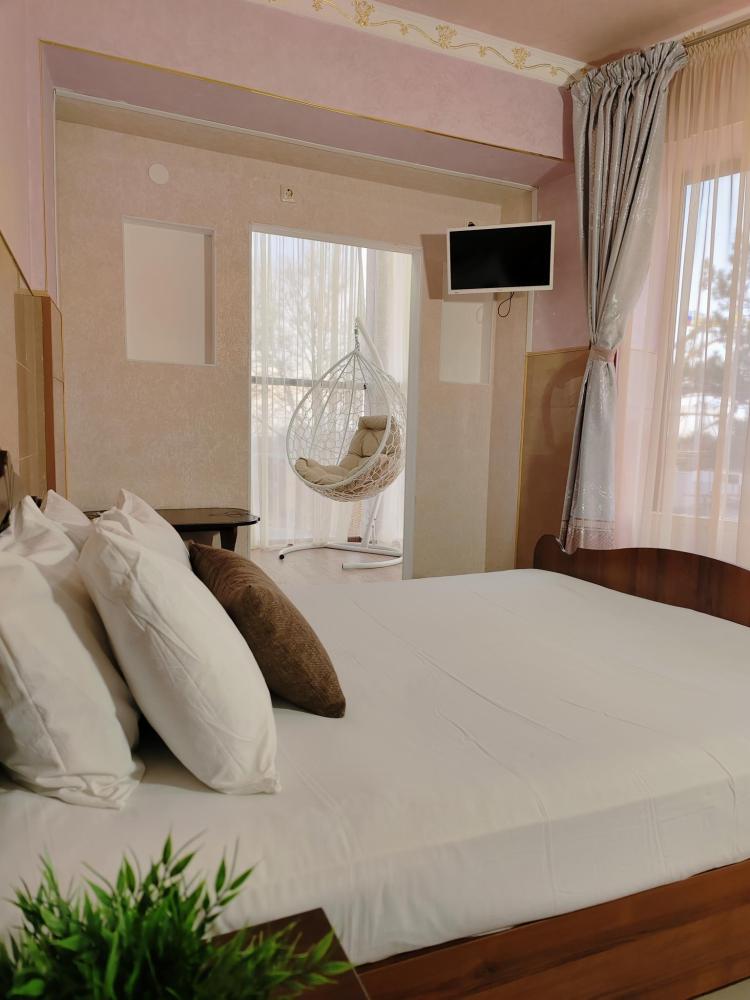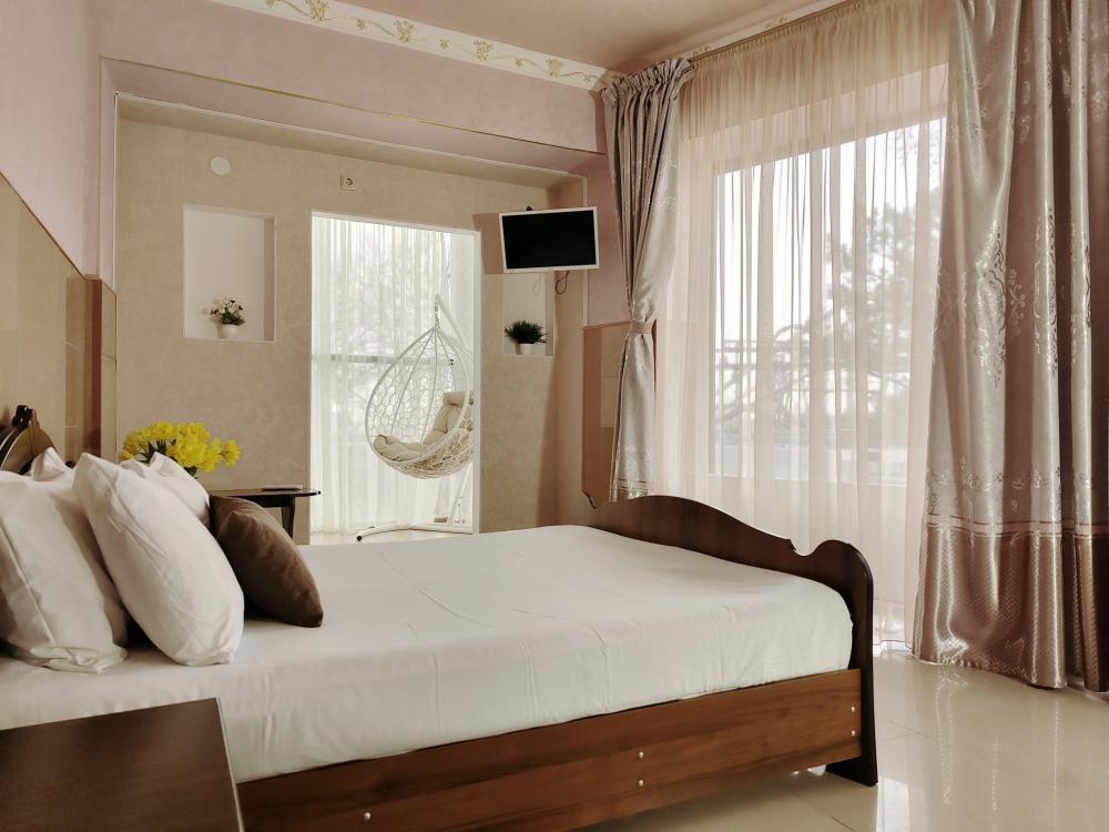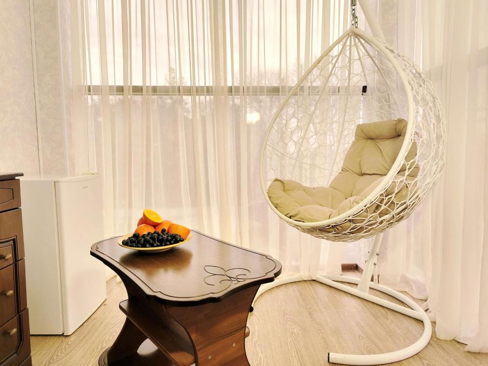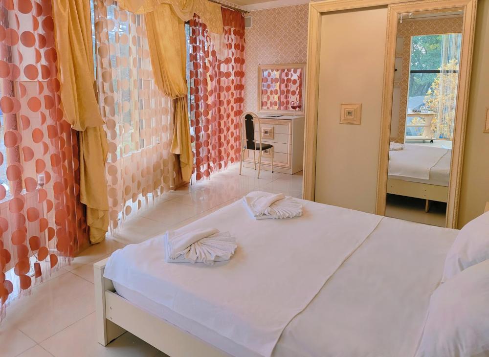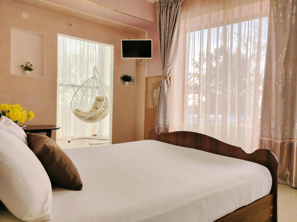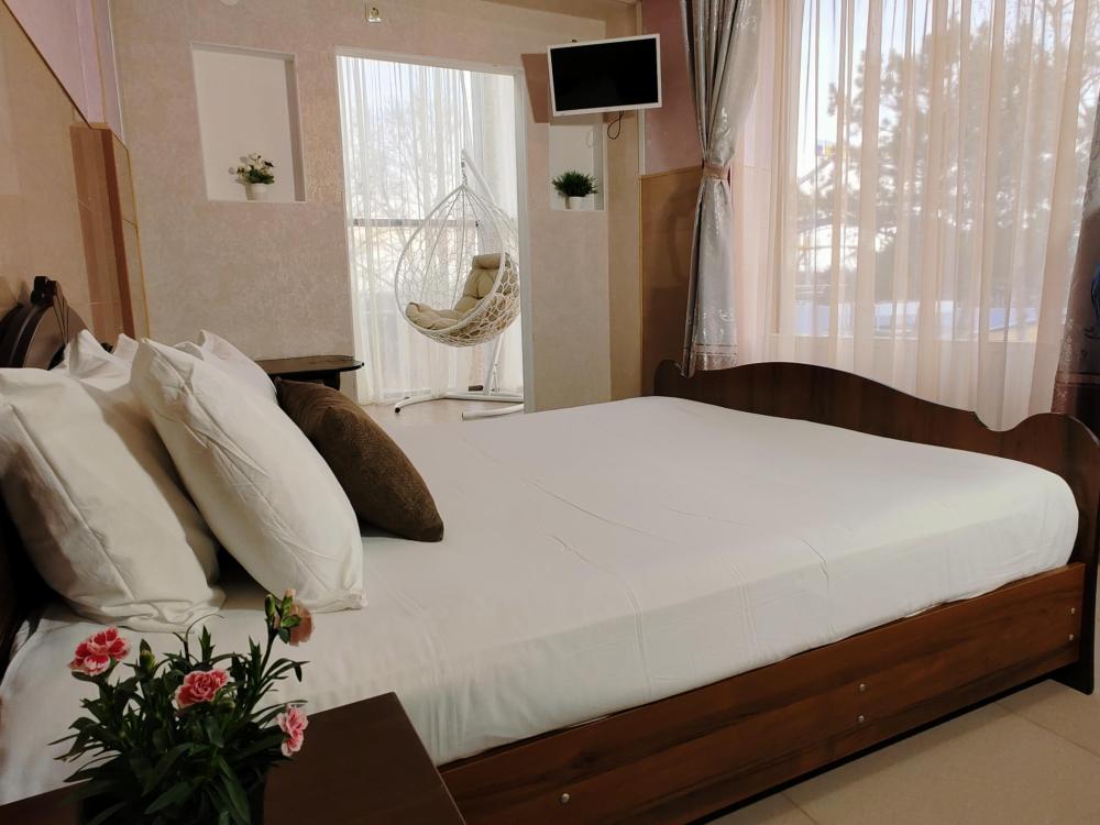 Просторный однокомнатный номер. В номере имеется: двуспальная кровать, диван-кровать, прикроватные тумбочки, журнальный столик, шкаф, телевизор, мини-холодильник, кондиционер. На лоджии находится кресло-кокон. Ванная комната: душевая кабина, раковина, туалет.