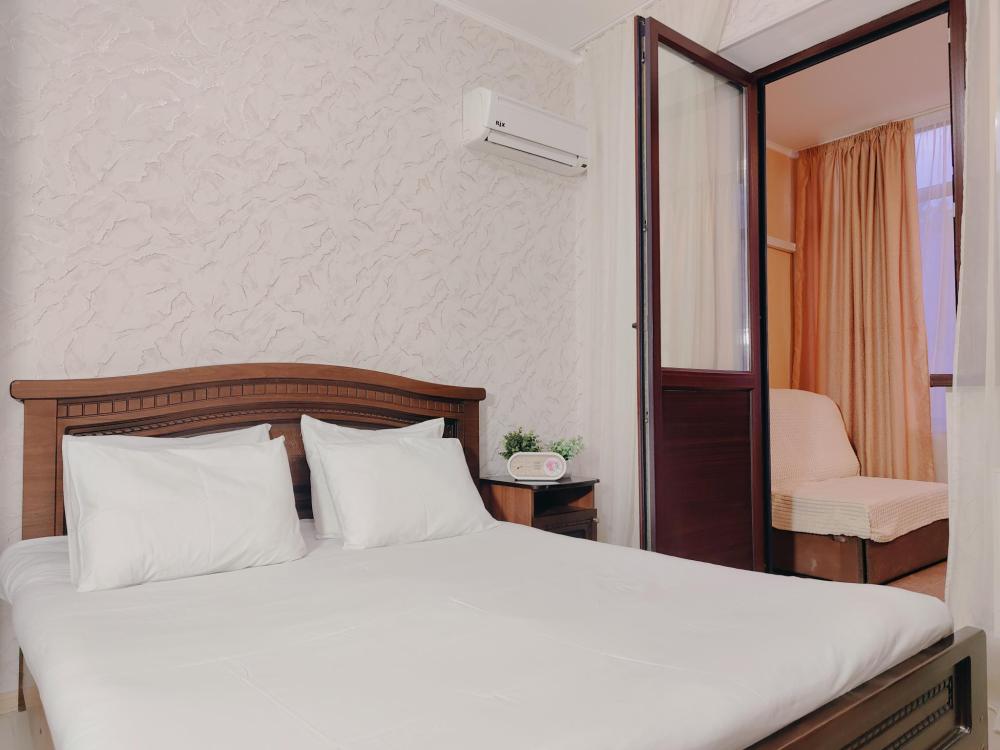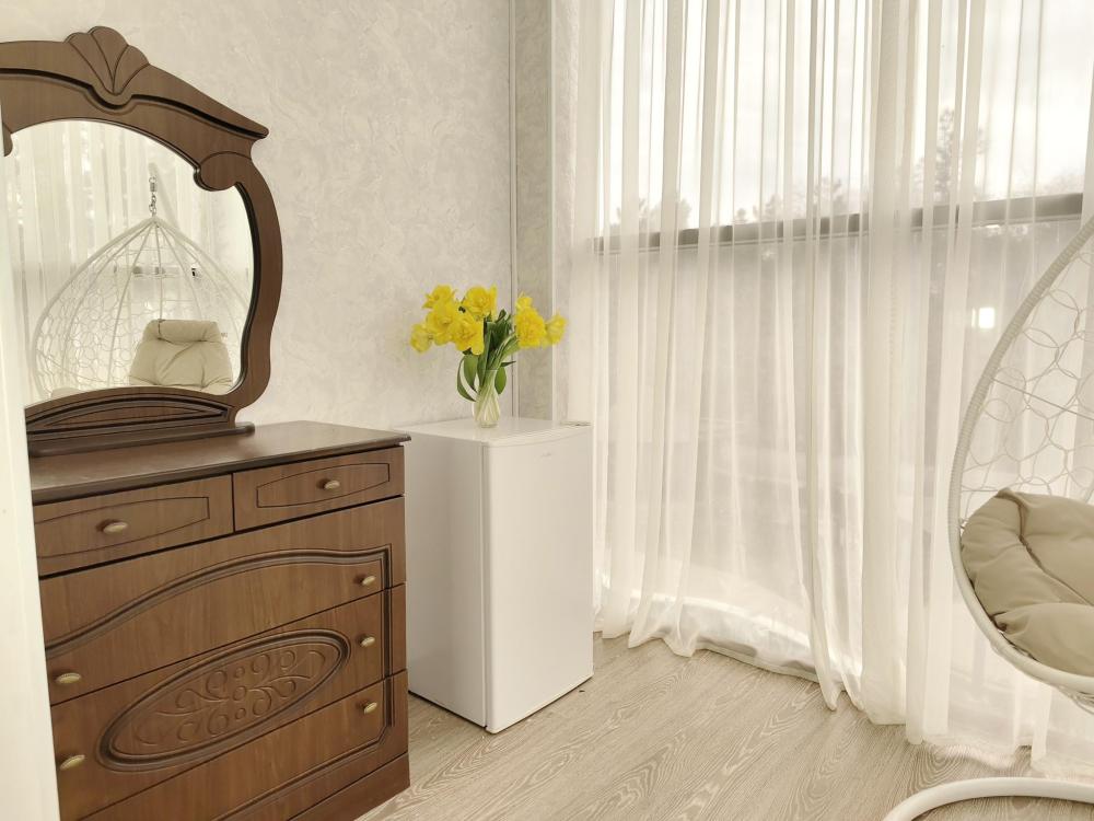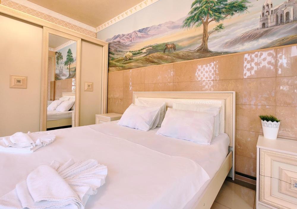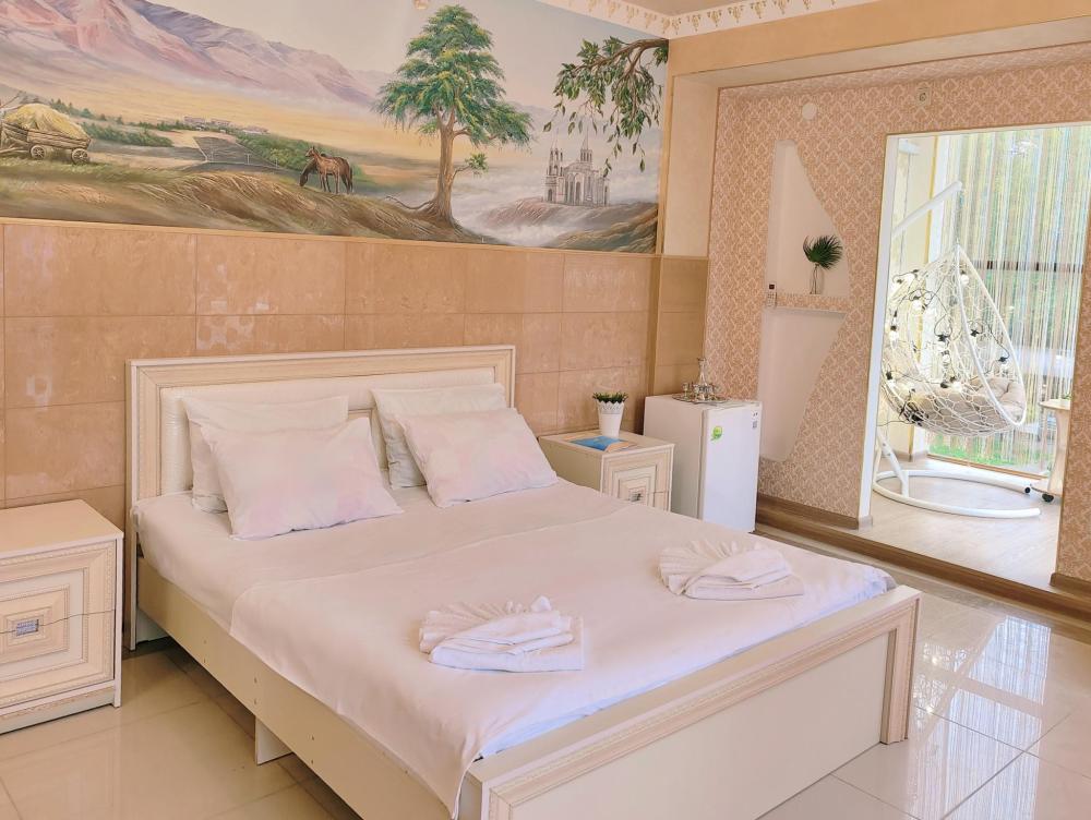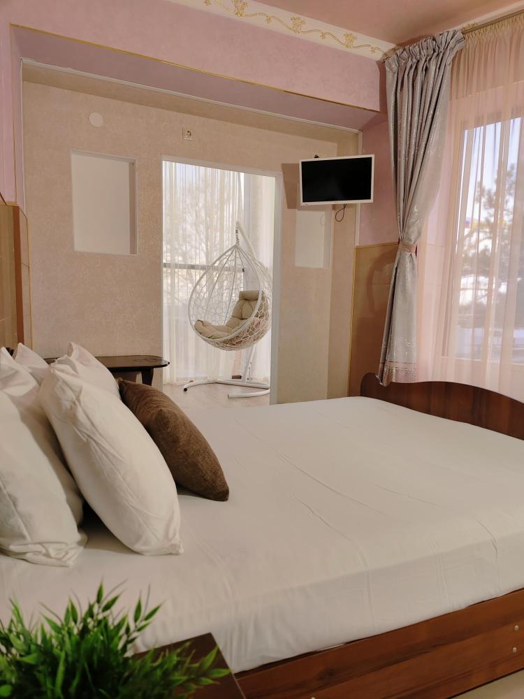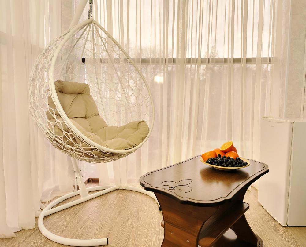 Просторный однокомнатный номер. В номере имеется: двуспальная кровать, диван-кровать, прикроватные тумбочки, журнальный столик, шкаф, телевизор, мини-холодильник, кондиционер. На лоджии находится кресло-кокон. Ванная комната: душевая кабина, раковина, туалет.