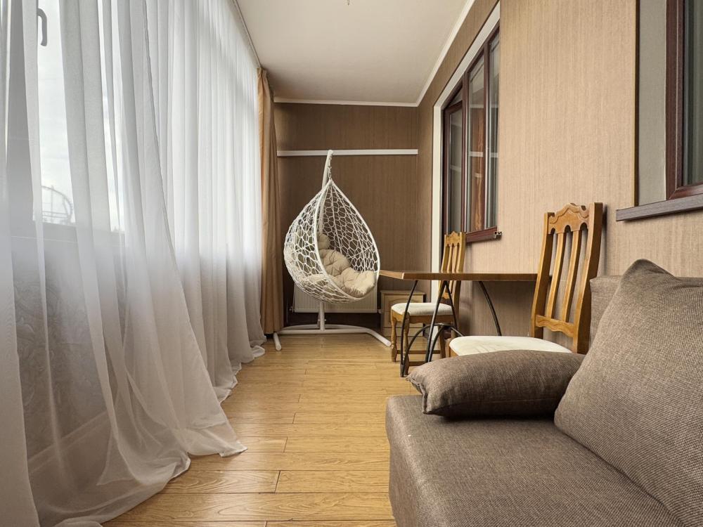 Однокомнатный номер большой площадью. На лоджии оборудована зона отдыха: кресло-кокон, столик. В номере имеется: двуспальная кровать, двухспальный диван, кресло-кровать, прикроватные тумбочки, журнальный столик, шкаф, комод, зеркало, телевизор, мини-холодильник, кондиционер, кресло-кокон. В номере есть огромная лоджия.