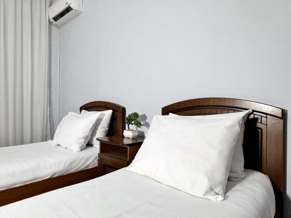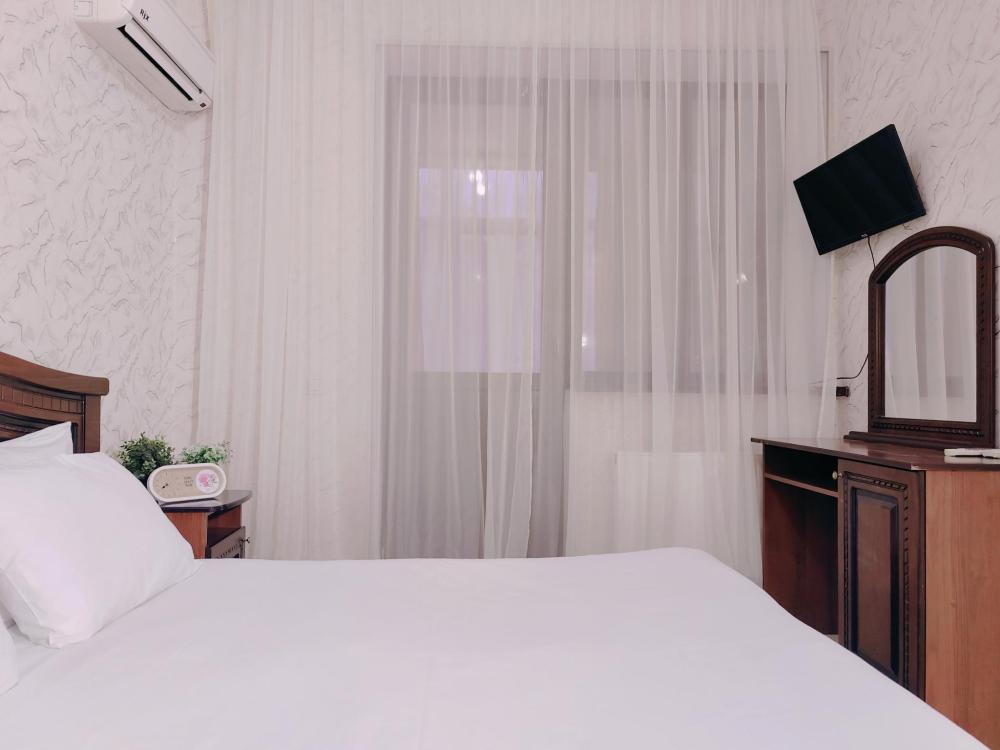 Двухместный уютный небольшой номер. Номер оснащен: двуспальная кровать, прикроватные тумбочки, шкаф, журнальный столик, туалетный столик, зеркало, стул, телевизор, мини-холодильник, кондиционер. В номере имеется небольшая лоджия с видом на столовую и территорию отеля.