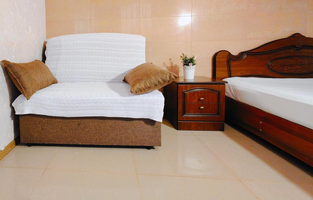 Номер на 3 гостей с видом на столовую. В номере имеется: двуспальная кровать, раскладное кресло-кровать (90 см), прикроватные тумбочки, шкаф, телевизор, мини-холодильник, кондиционер. В номере имеется небольшая лоджия с видом на столовую отеля.