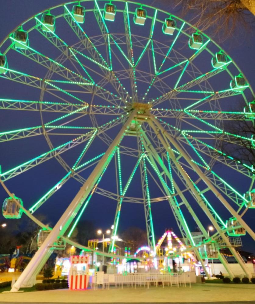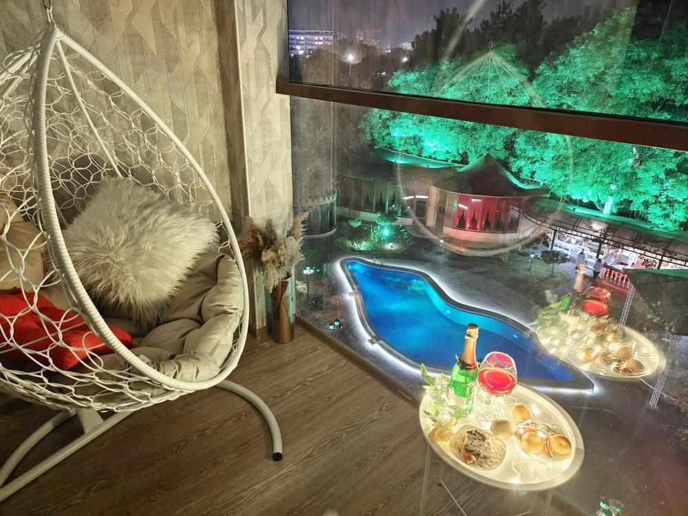 Шикарный номер с панорамными окнами и видом на колесо обозрения. В номере имеется лоджия панорамным и завораживающим видом на территорию отеля, бассейн и парк. Номер оснащен: двуспальная кровать, кресло-кровать, прикроватные тумбочки, комод, зеркало, шкаф, телевизор, мини-холодильник, кондиционер.