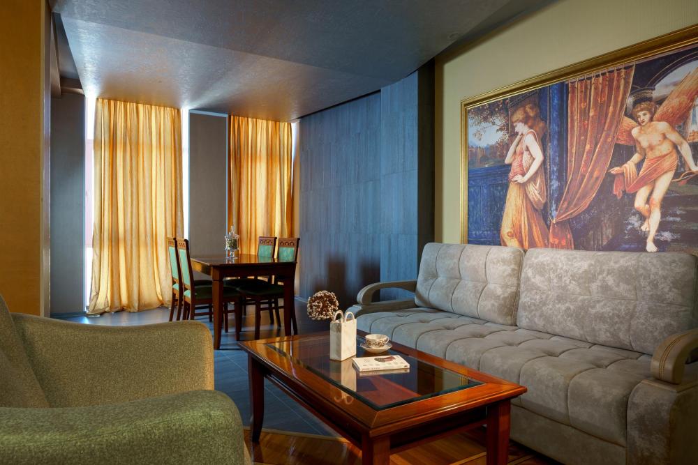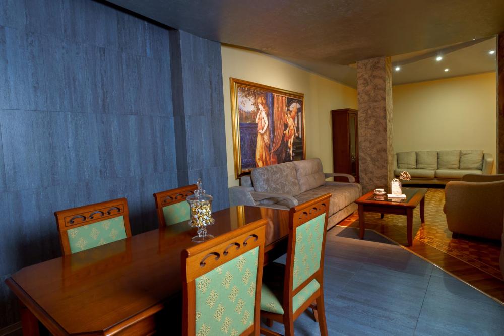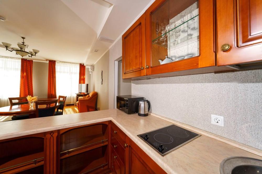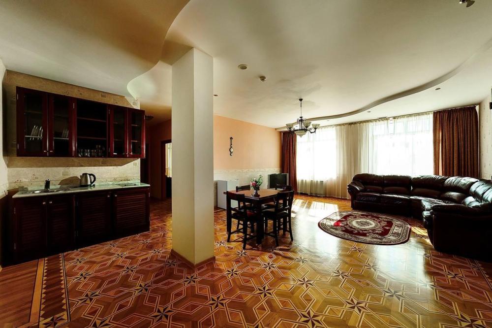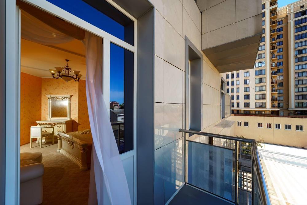 Изысканный трехкомнатный номер с двуспальной кроватью, двухместным раскладным диваном, кухонной зоной и балконом.