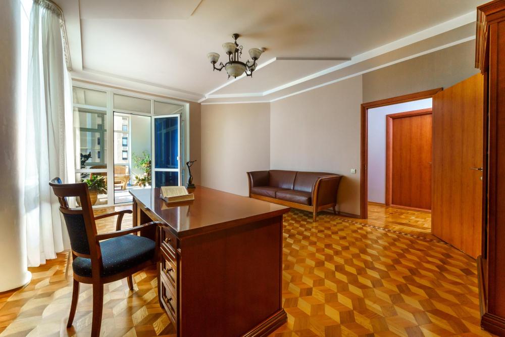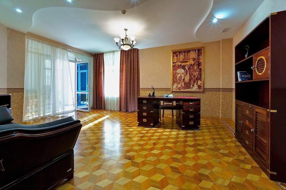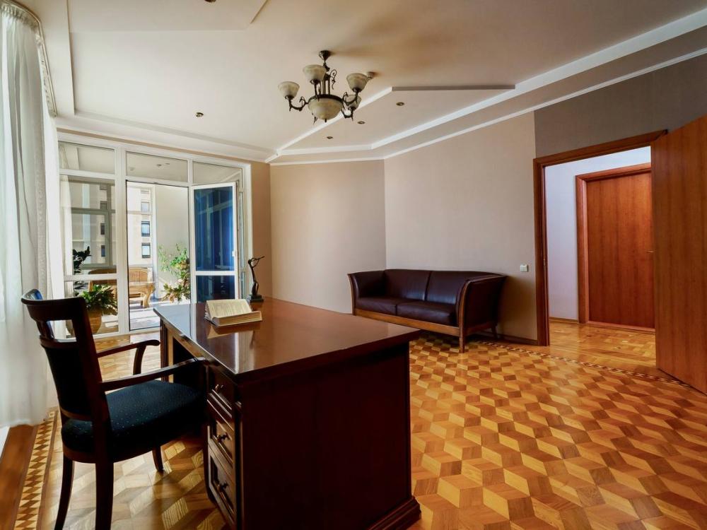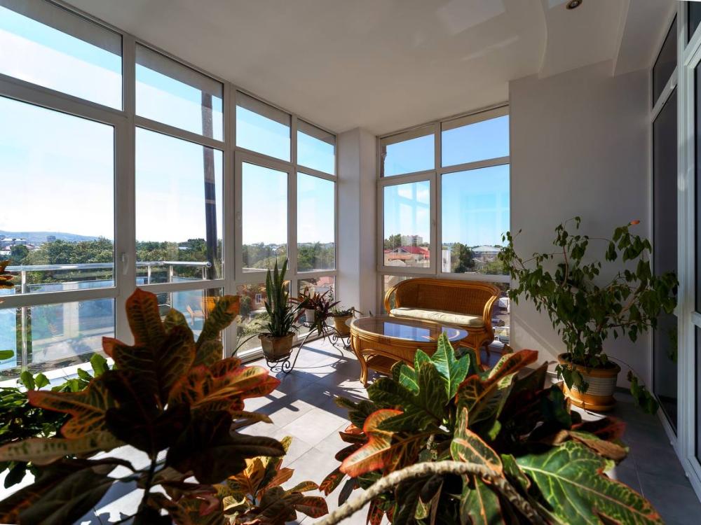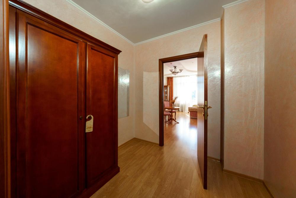 Изысканный трехкомнатный номер с двуспальной кроватью, двухместным раскладным диваном, кухонной зоной и балконом.