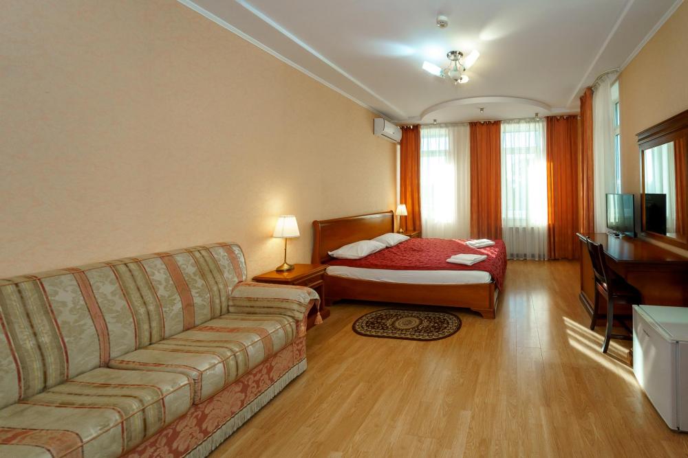 Комфортный однокомнатный номер с одной двуспальной или двумя односпальными кроватями, двухместным раскладным диваном и балконом.
