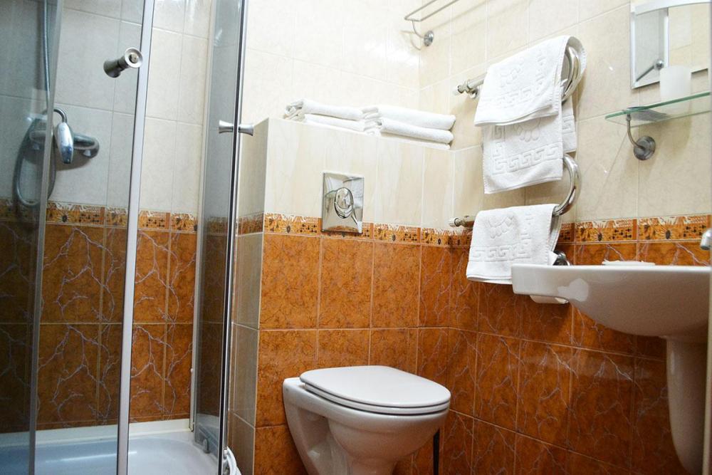 В номере: двуспальная кровать, прикроватные тумбочки, журнальный столик, двустворчатый шкаф, сейф, телефон, интернет, холодильник, жк-телевизор, сплит-система, санузел (душевая кабина, умывальник, фен, туал.принадлежности)