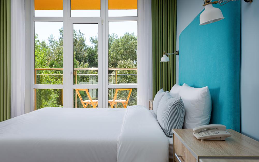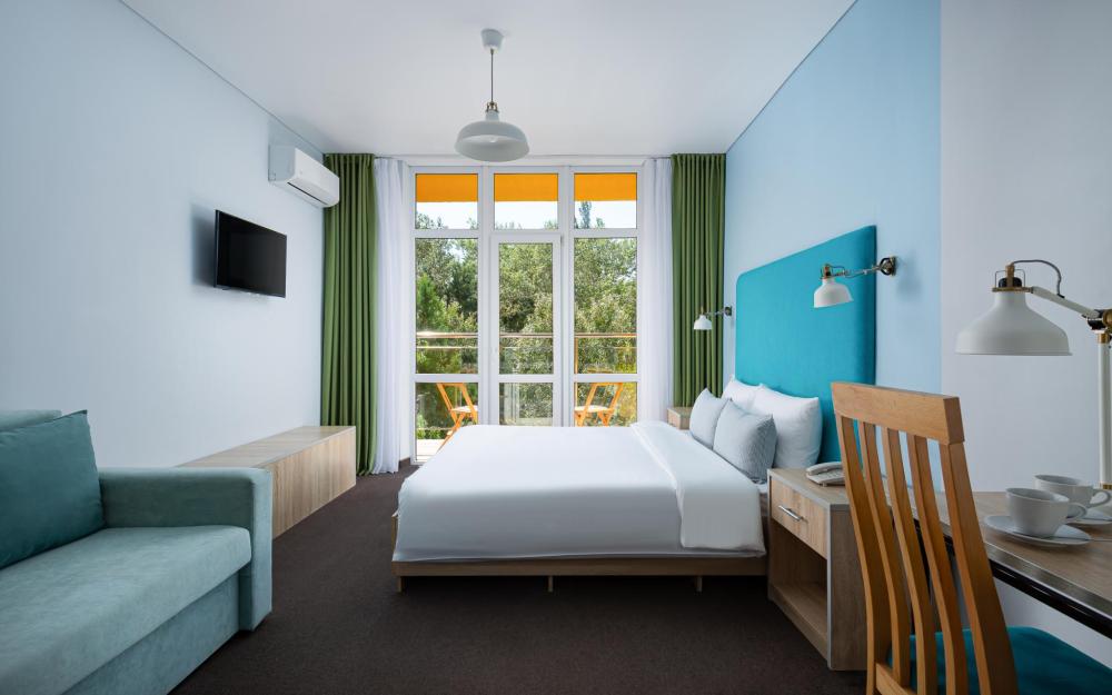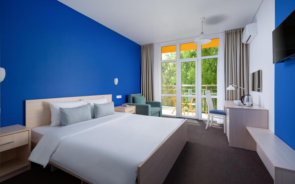 Номер представляет собой номер с ярко оформленным интерьером и, конечно же, удобной, большой двуспальной кроватью. В номере: двуспальная кровать, раскладное кресло, зеркало, шкаф, мини-холодильник, телевизор, WI-FI, сплит-система, телефон (внутренняя связь), гладильные принадлежности, сейф, чайник, чайный набор, бутилированная вода; балкон с мебелью и сушилкой. В ванной комнате: душевая кабина, фен, полотенца, туалетные принадлежности, халаты, тапочки.
