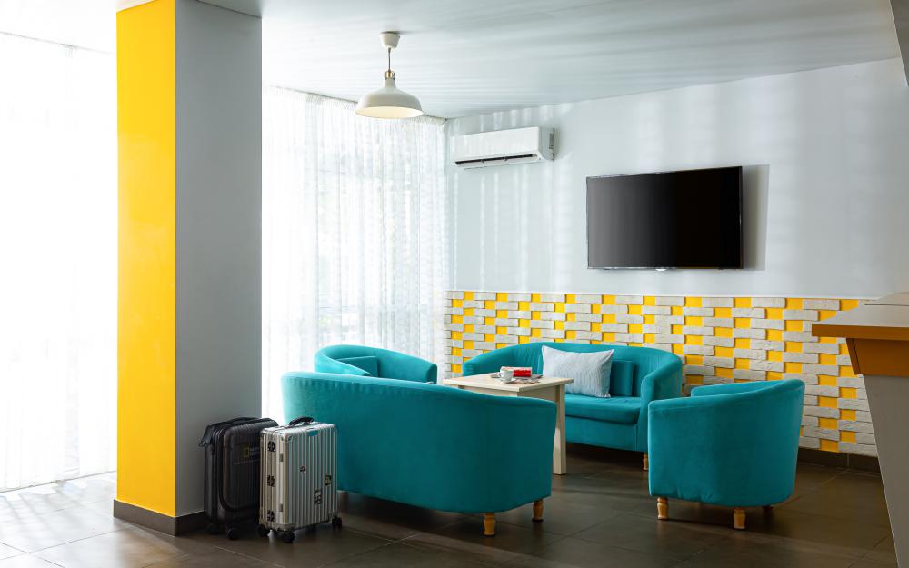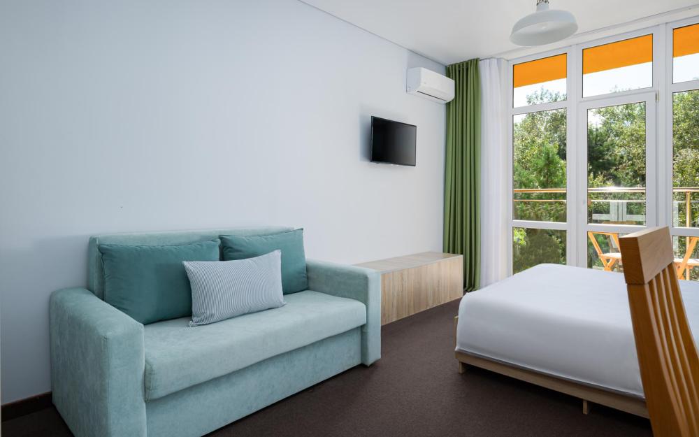 Номер с расширенной площадью, двуспальной кроватью и раскладным диваном – поэтому подходит большим компаниям и семьям до 4-х человек. В каждом номере — отдельная рабочая зона, современная ванная комната и целое море комфорта. В номере: двуспальная кровать, раскладной диван, зеркало, шкаф, рабочее место, мини-холодильник, телевизор, WI-FI, сплит-система, телефон (внутренняя связь), гладильные принадлежности, сейф, чайник, чайный набор, бутилированная вода; балкон с мебелью и сушилкой. В ванной комнате: душевая кабина, фен, полотенца, туалетные принадлежности, халаты, тапочки.