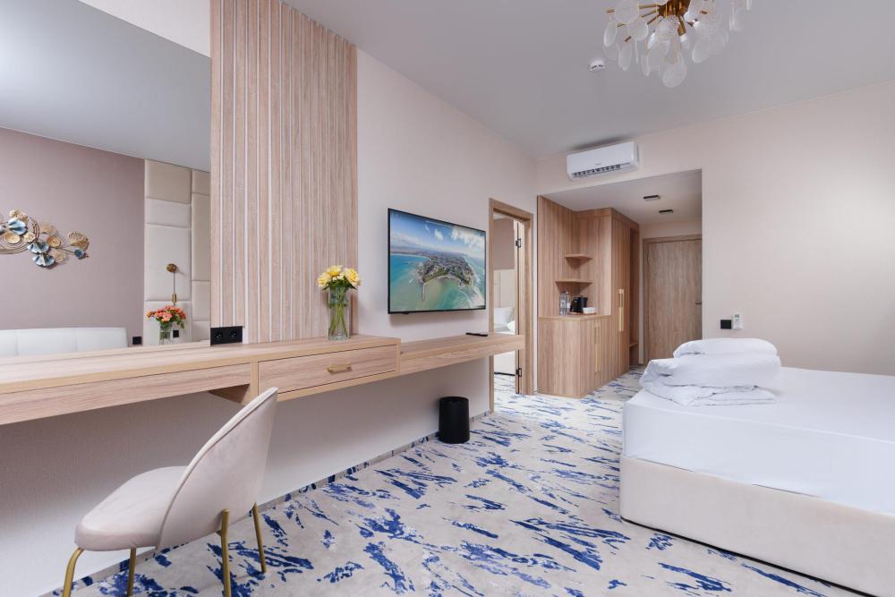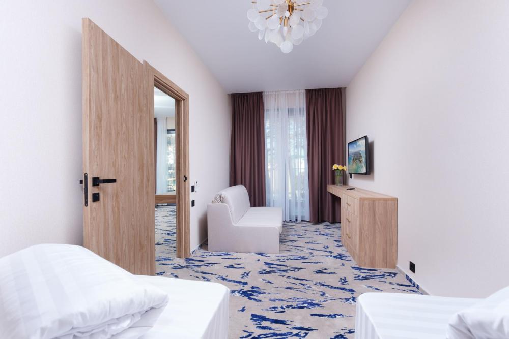 Номер общей площадью 68 кв.м. с личным выходом к бассейну В номере данной категории возможно размещение только взрослых (16+) Номера находятся в 10 метрах от моря - в парковой зоне, в окружении вечнозеленой семидесятилетней пицундской сосны и детских и спортивных площадках. В номере 3 комнаты. Гостиная: 1.Двухспальный раскладной диван 2.Письменный стол 3.Стул 4.Журнальный столик 5.ТV 6.Шкаф для одежды 7.Мини-холодильник Спальня: 1.Двухспальная кровать 2.Прикроватные тумбы 3.Стул 4.TV Спальня: 1.Две односпальные кровати 2.Прикроватные тумбы 3.Стул 4.TV Сан.узел: 1.Ванна 2.Душ 3.Унитаз