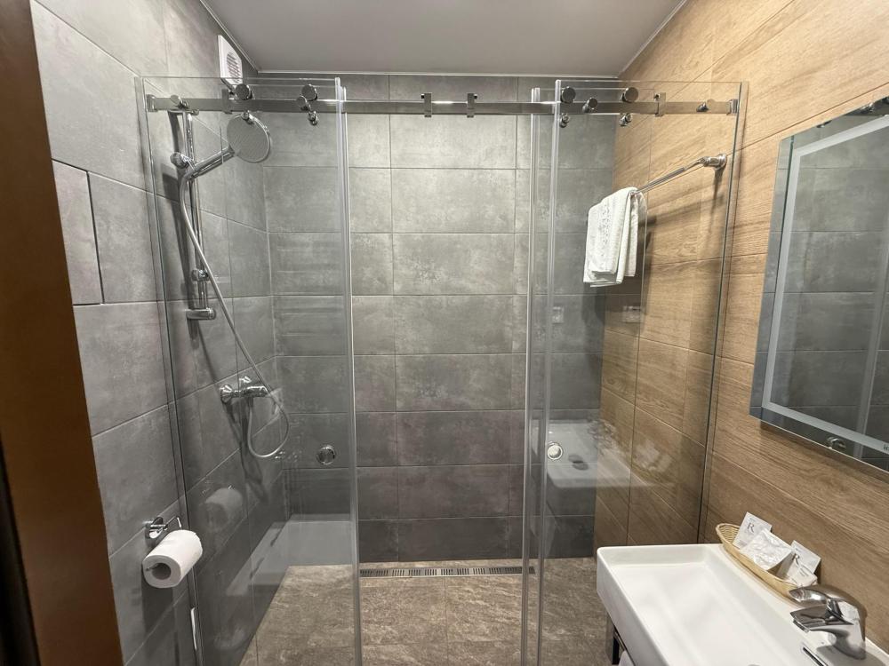 Двухкомнатный номер: состоит из спальной две односпальные кровати, прикроватные тумбочки, письменный стол, шкаф, вешалка, зеркало и в гостиной раскладной диван, кресло, сплит-система, сейф, цифровое телевидение, два телевизора, холодильник, телефон, набор посуды, санузел с душевой кабиной, фен, туалетные принадлежности, балкон оборудован мебелью и сушилкой. Окна выходят на парковку.