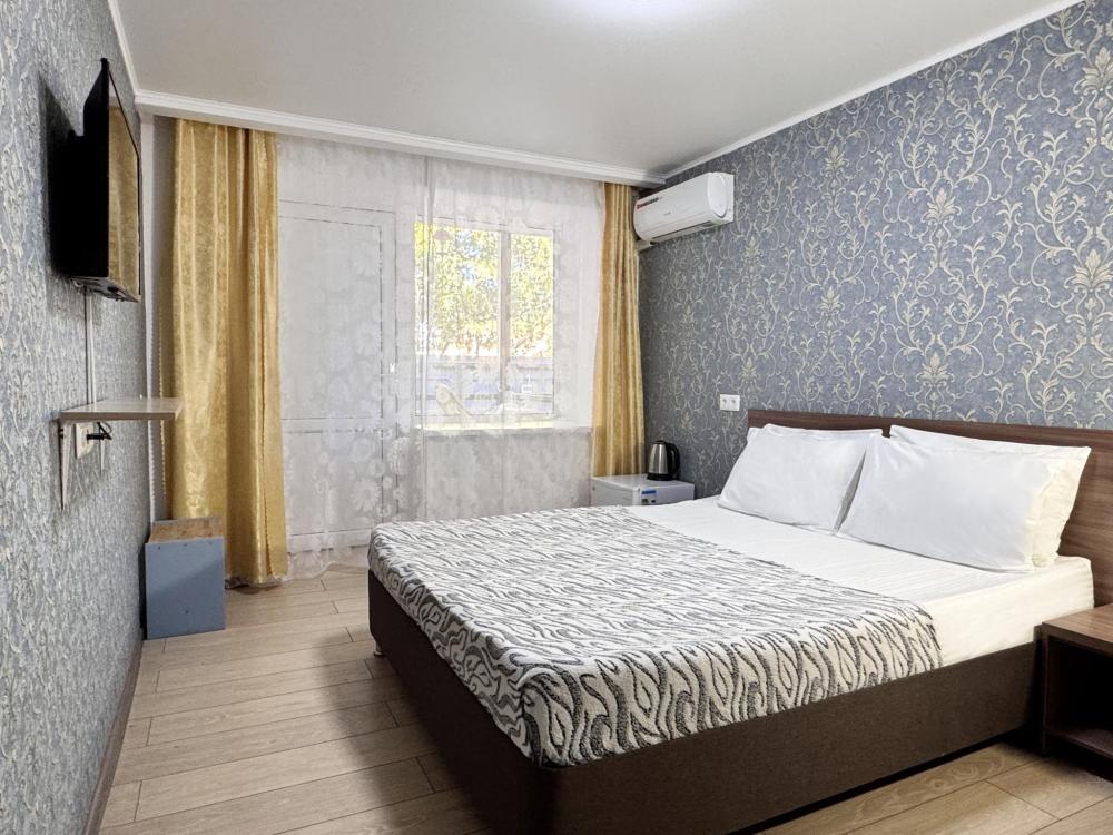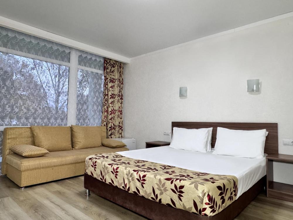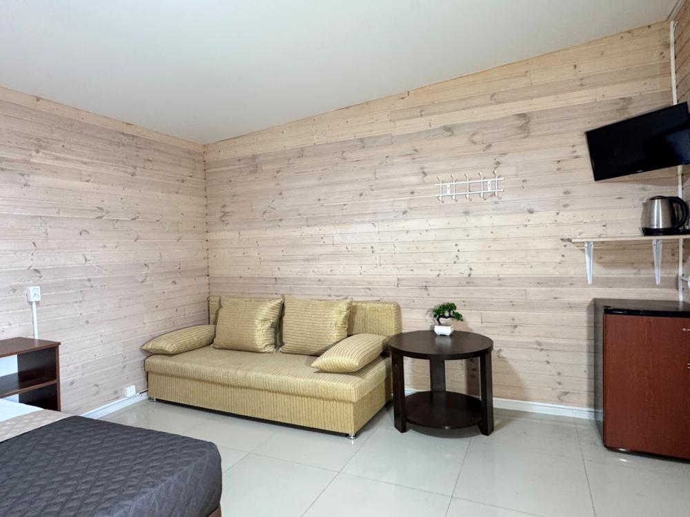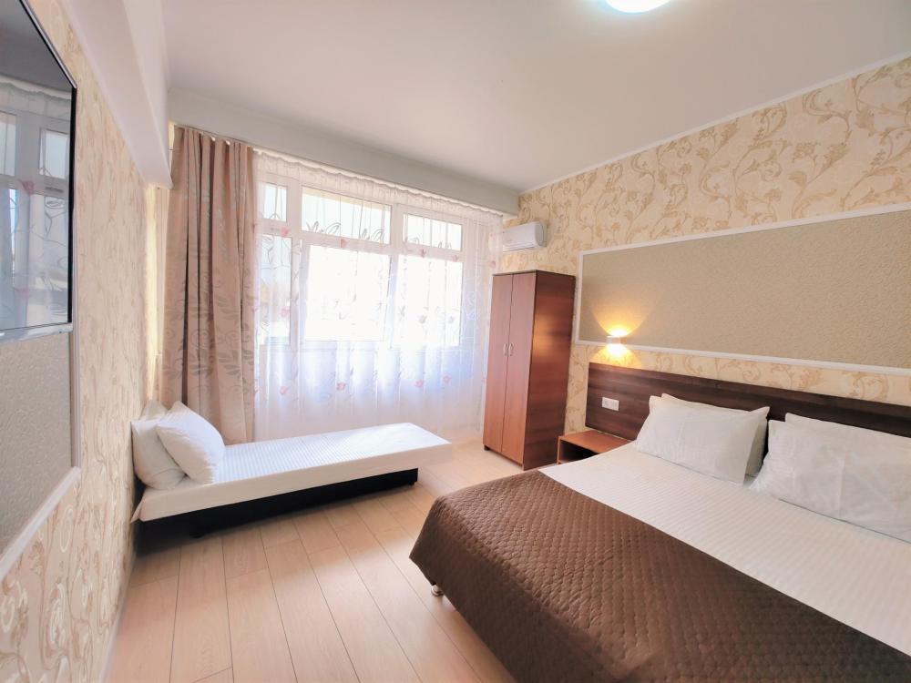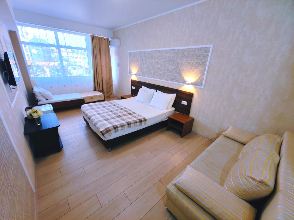 В номере: двуспальная кровать, односпальный диван, санузел, душ, ТВ, холодильник, кондиционер. Без балкона.