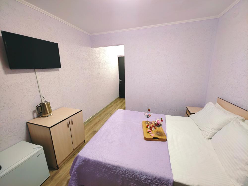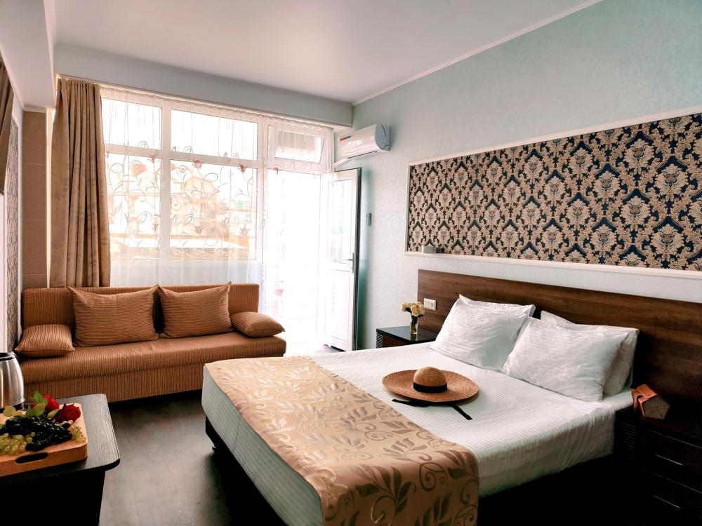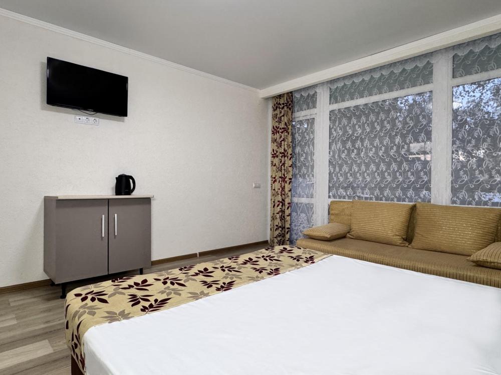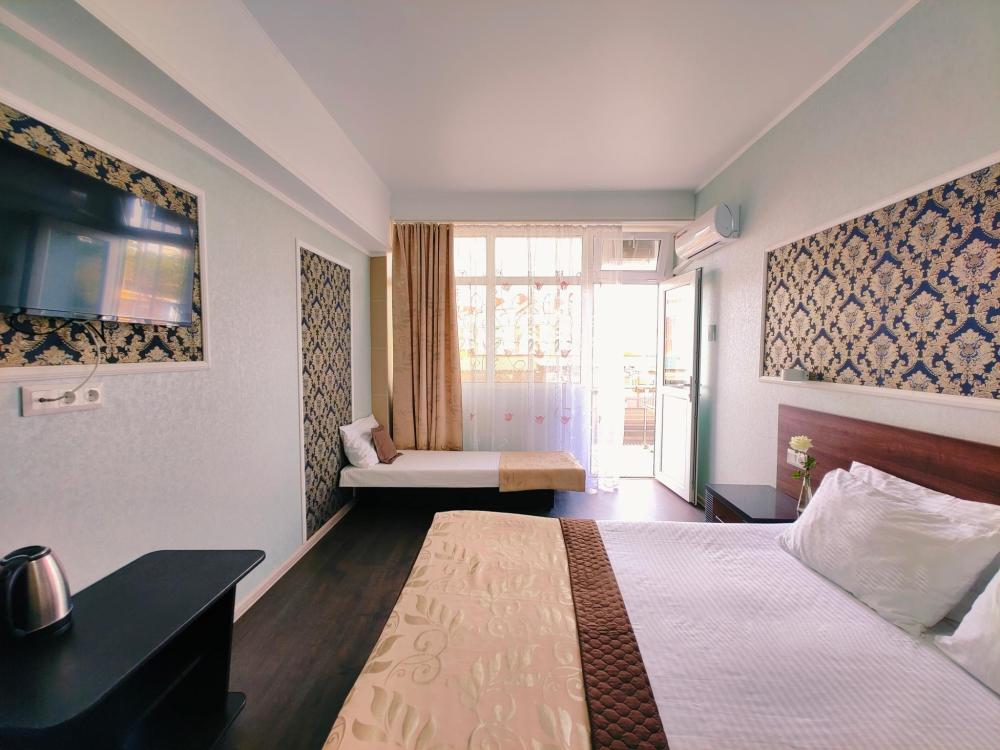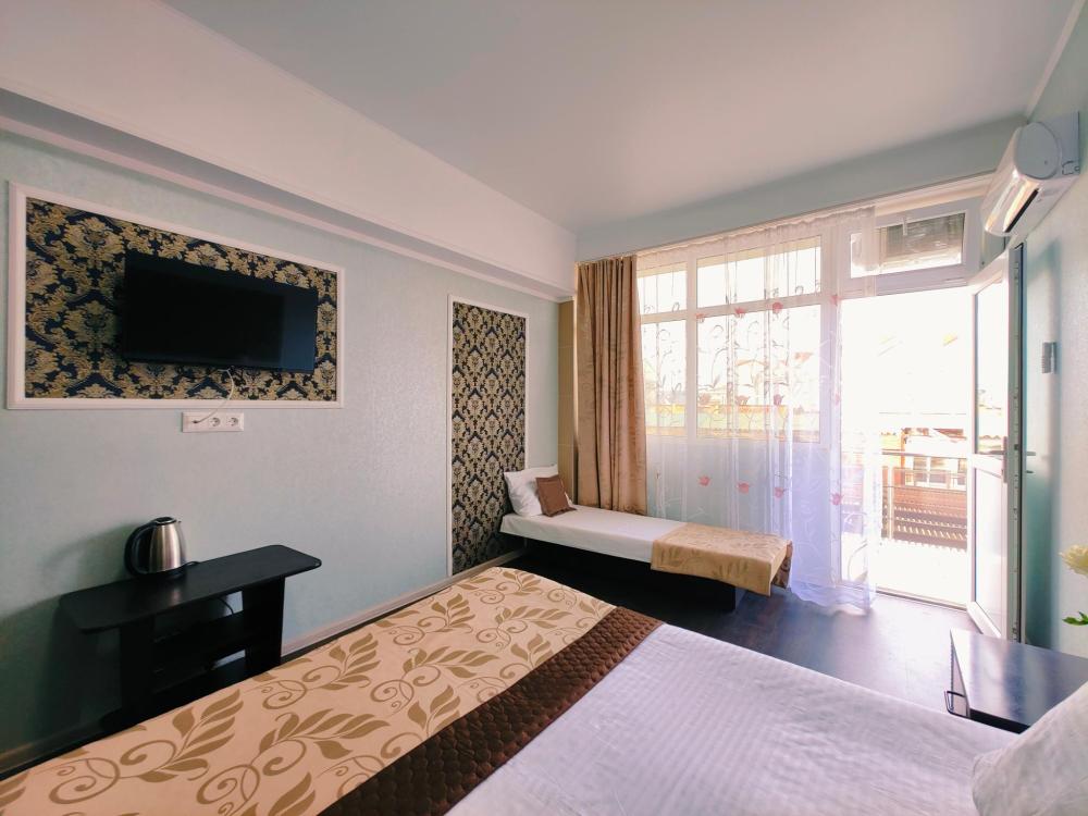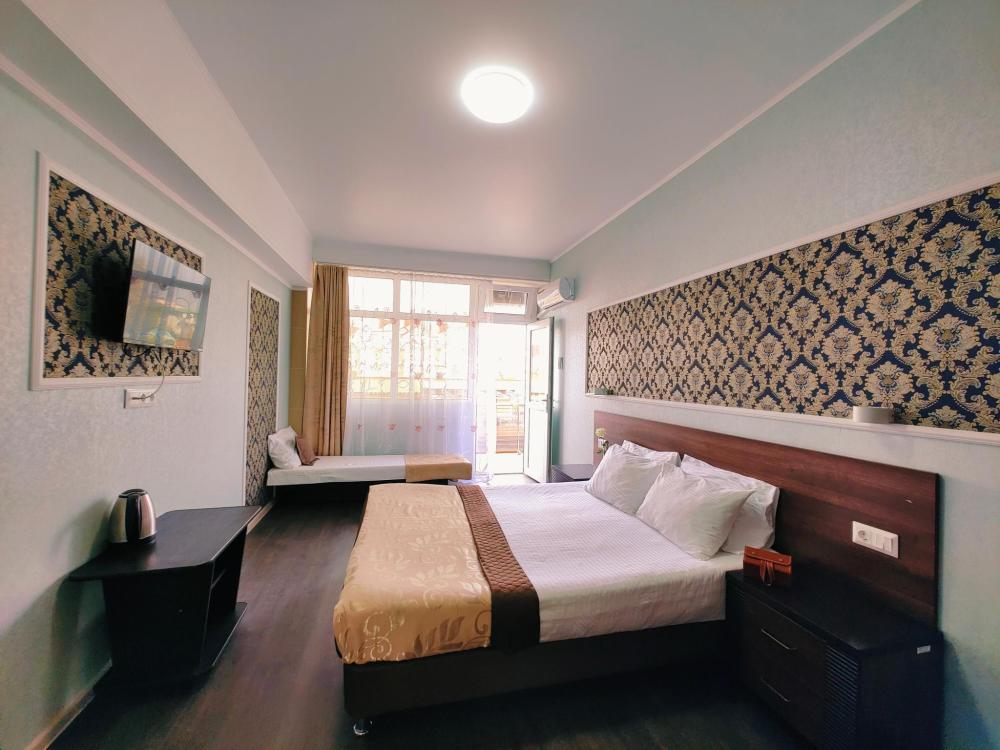 В номере: двуспальная кровать, односпальный диван, санузел, душ, ТВ, холодильник, кондиционер. Без балкона.
