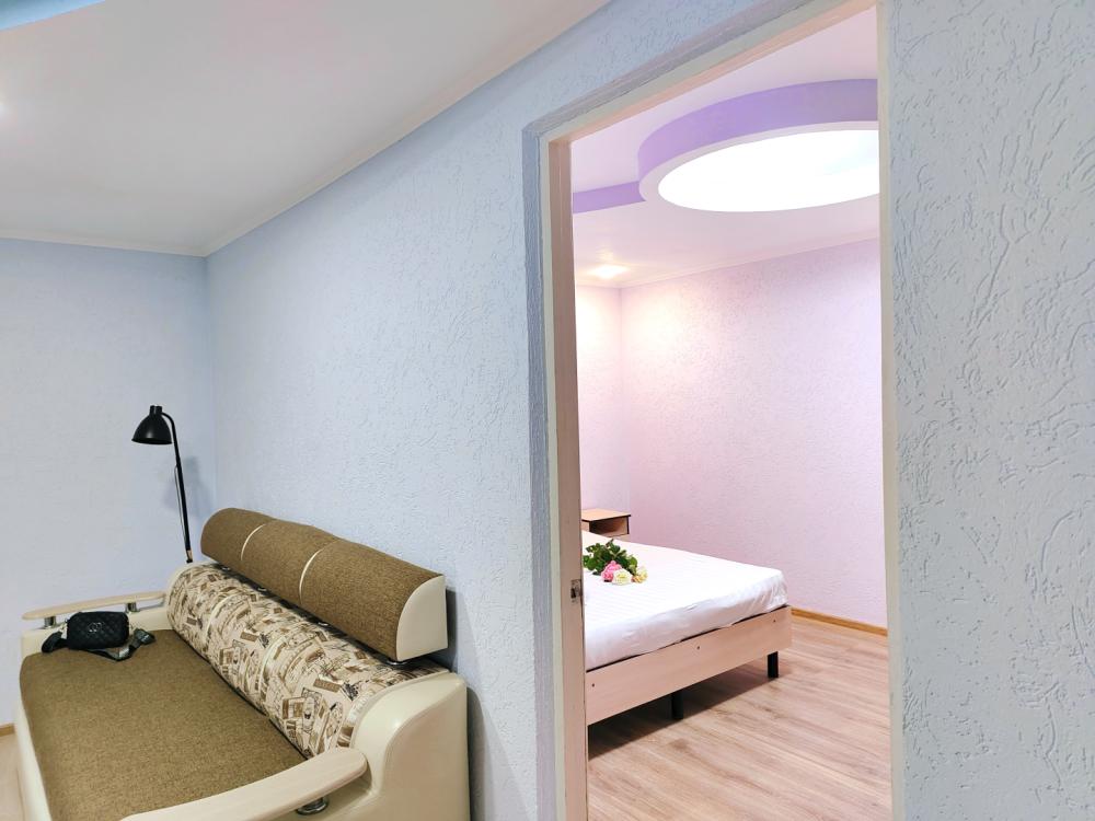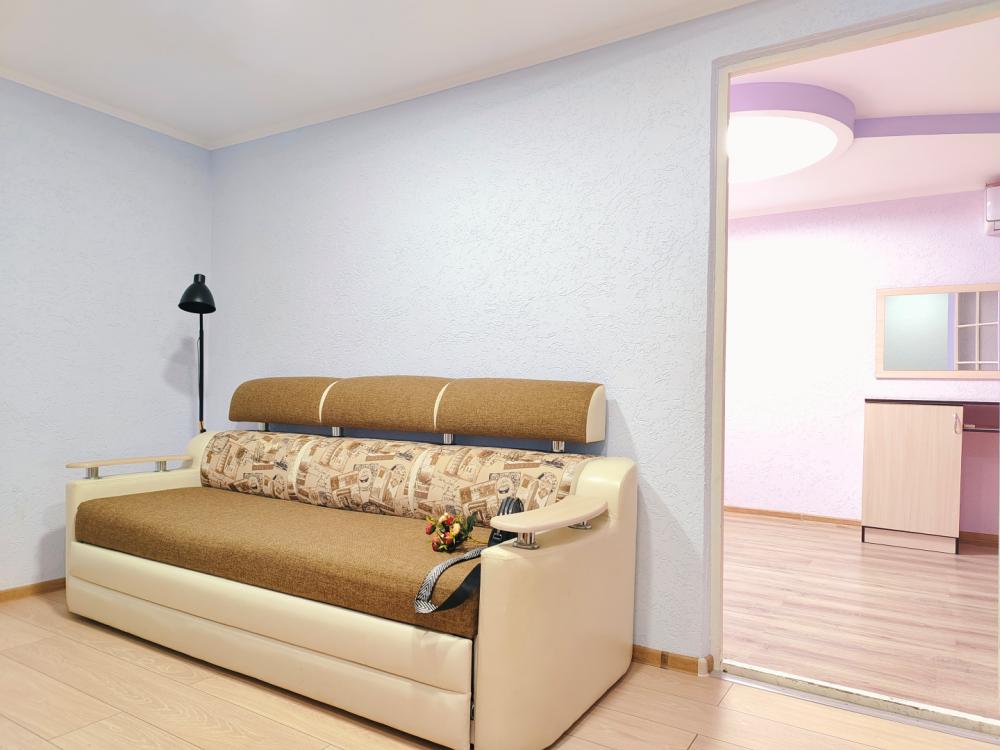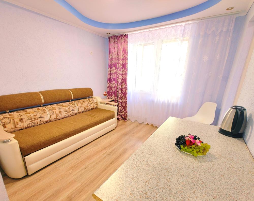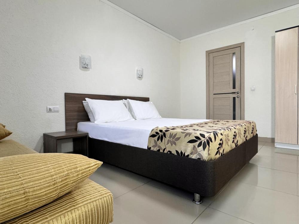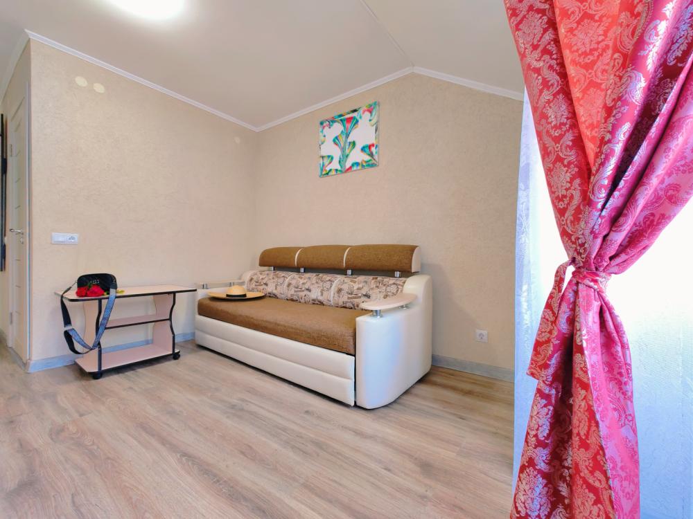 Четырехместная студия с мини-кухней и террасой. В номере: двуспальная кровать, двуспальный диван, санузел, душ, ТВ, холодильник, кондиционер, мини-кухня(набор посуды, микроволновка/мультиварка/эл.печь), летняя мебель и лежаки для загара.
