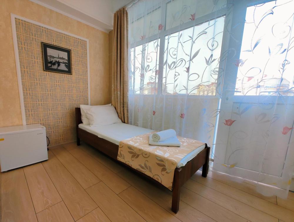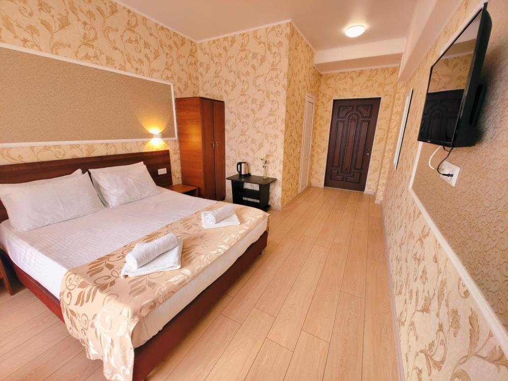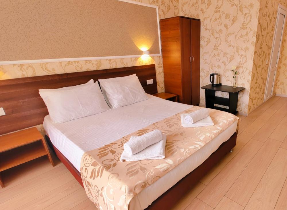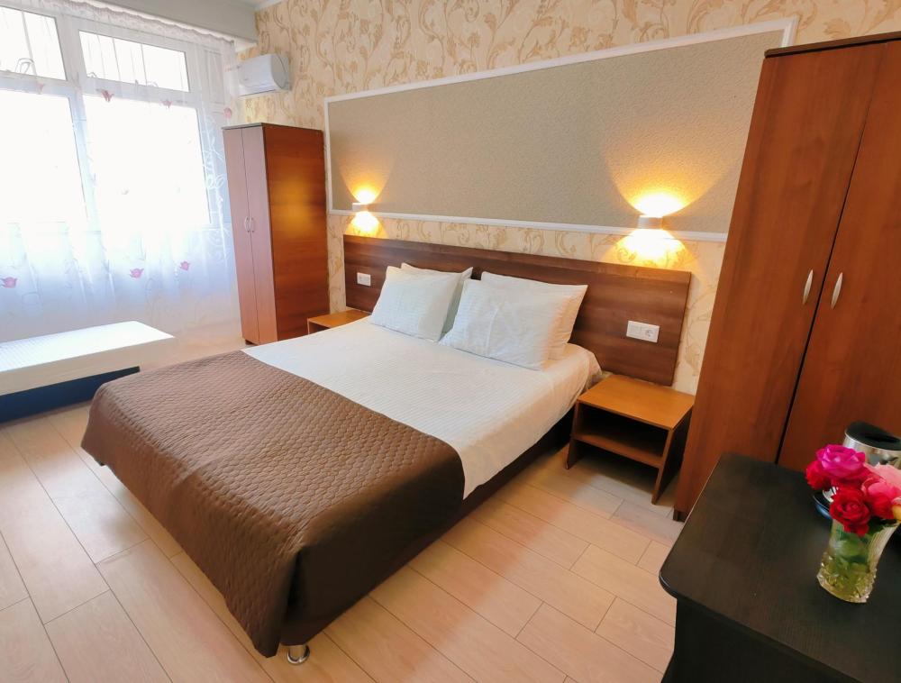 Оснащение номера: кровать (120×200), шкаф для хранения одежды, тумбочки или журнальный столик, мини-холодильник, телевизор, чайник, кружки. Комфортную температуру обеспечивает сплит-система. В ванной комнате: набор одноразовой косметики (гель, шампунь, мыло). Балкон с летней мебелью. Номер предусмотрен для проживания одного взрослого и одного ребенка до 5 лет. Возможно предоставление детской кроватки.