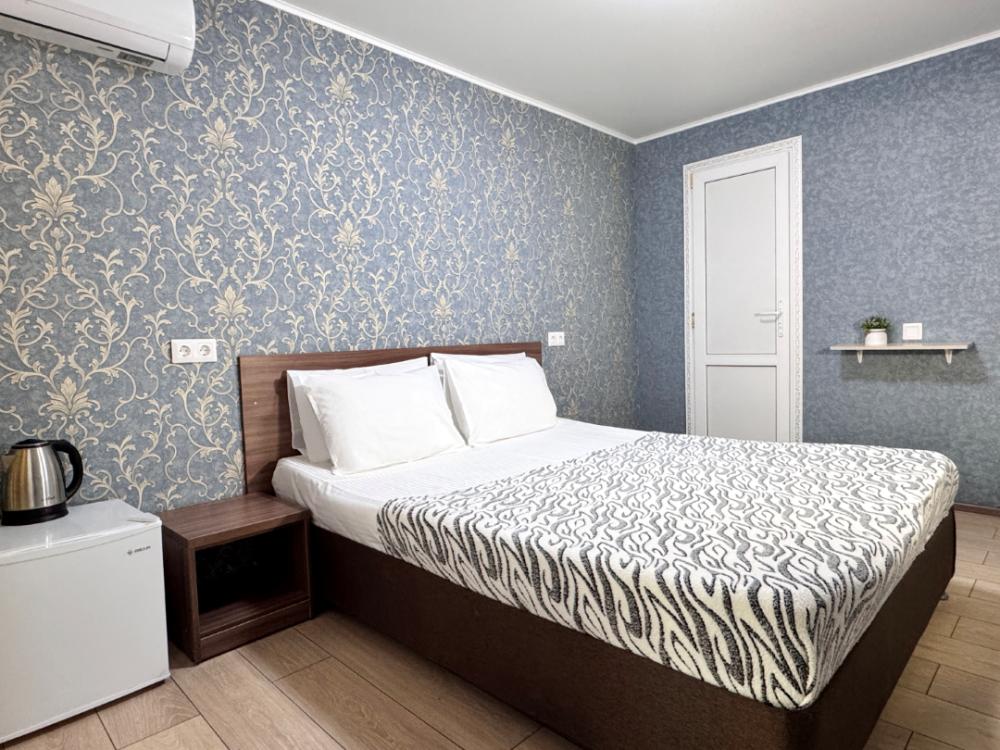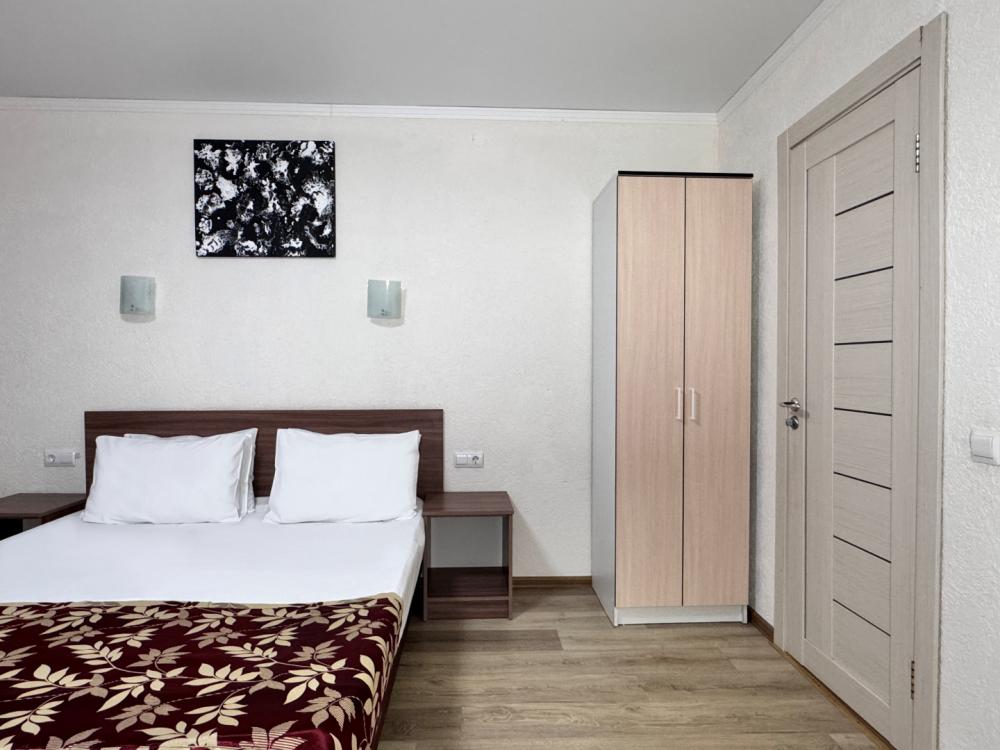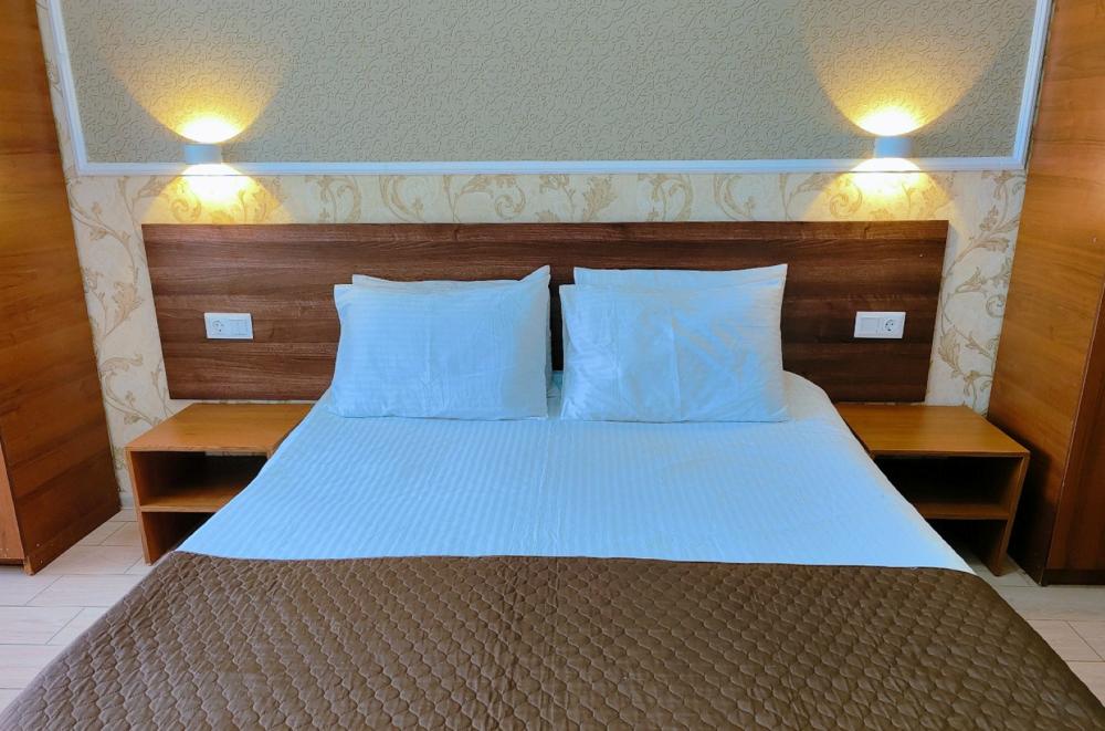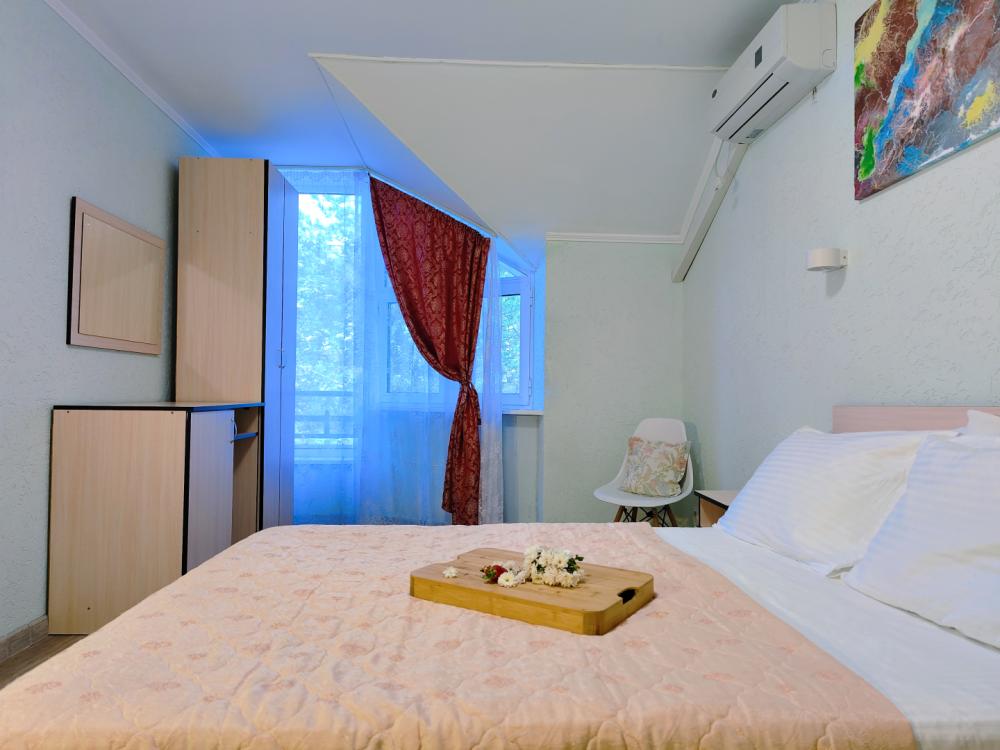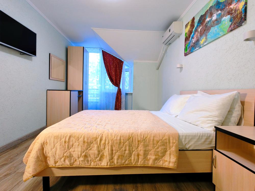 Оснащение номера: кровать (120×200), шкаф для хранения одежды, тумбочки или журнальный столик, мини-холодильник, телевизор, чайник, кружки. Комфортную температуру обеспечивает сплит-система. В ванной комнате: набор одноразовой косметики (гель, шампунь, мыло). Балкон с летней мебелью. Номер предусмотрен для проживания одного взрослого и одного ребенка до 5 лет. Возможно предоставление детской кроватки.