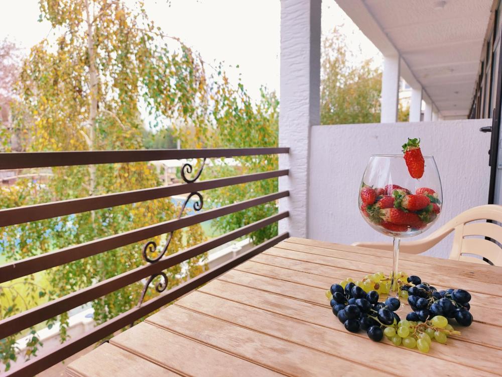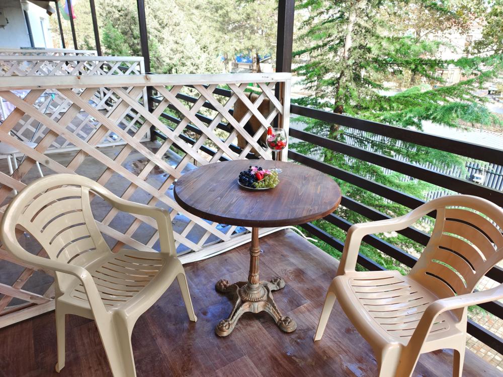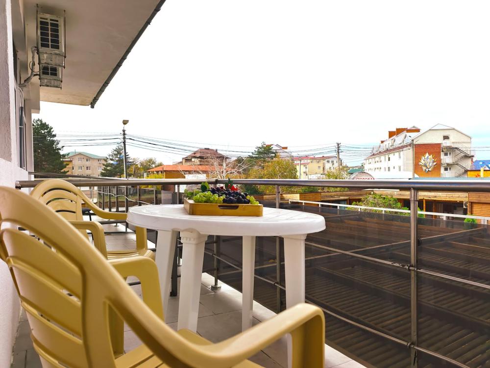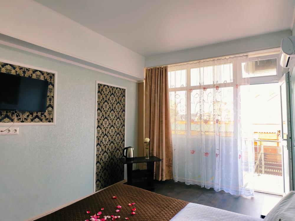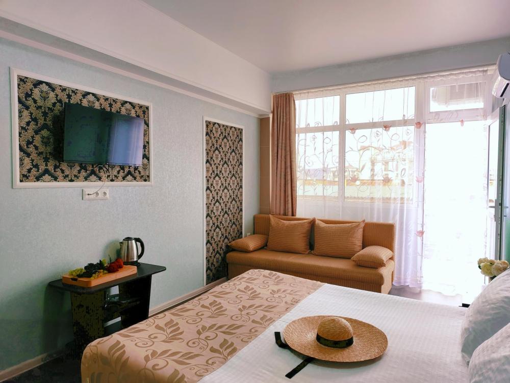 В номере: двуспальная кровать, односпальный диван, санузел, душ, ТВ, холодильник, кондиционер, балкон и летняя мебель.